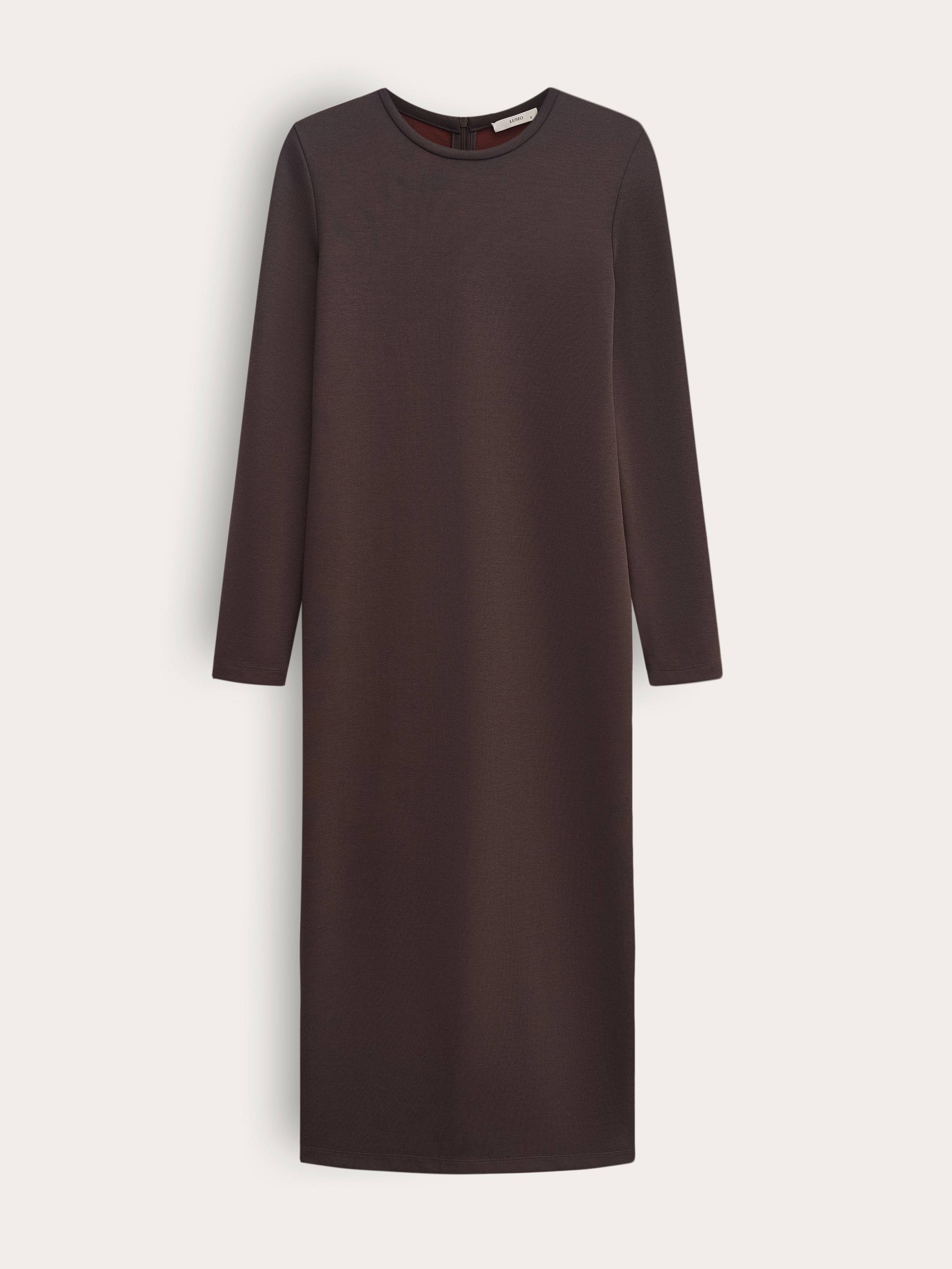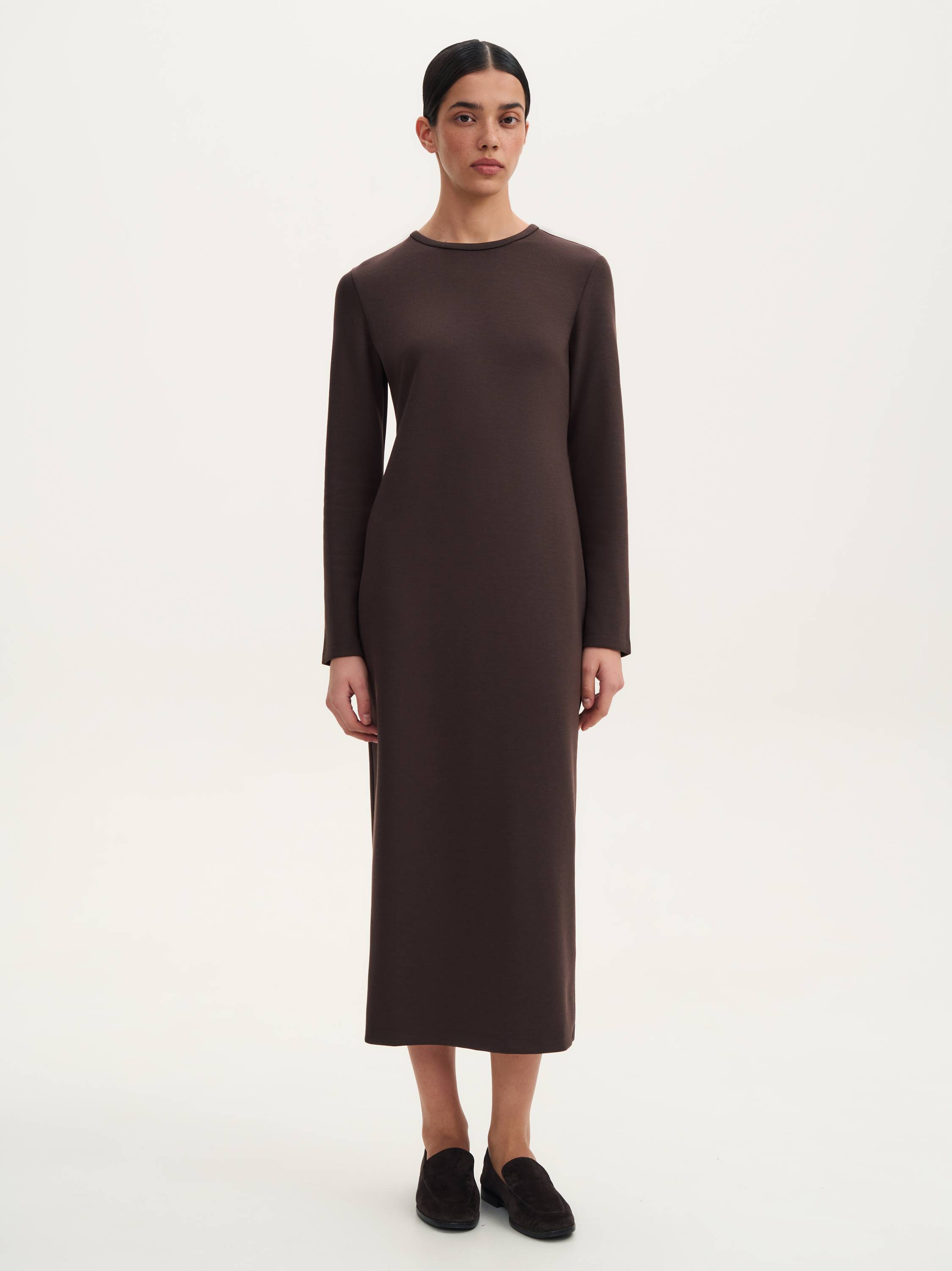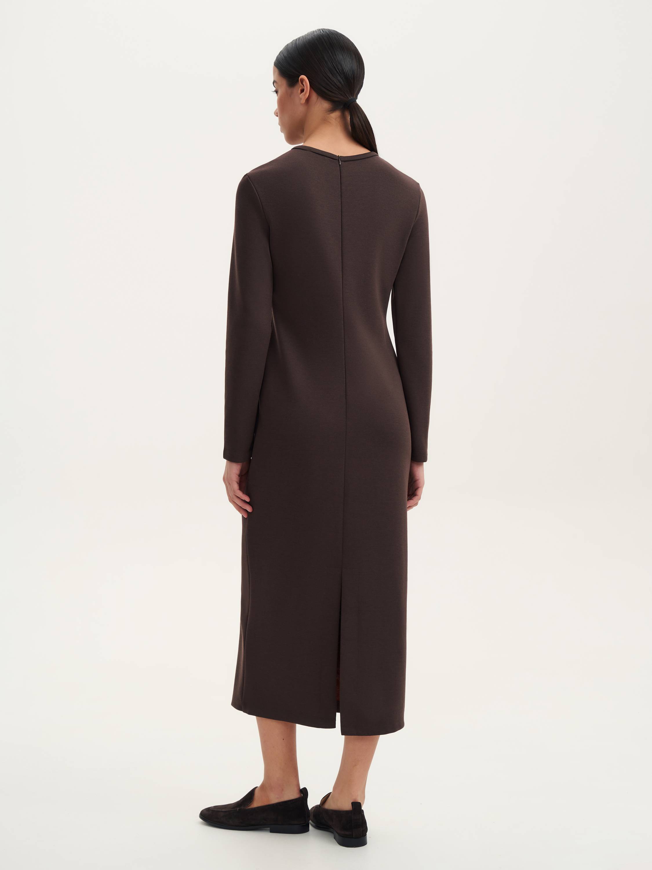 Платье прямого кроя длины миди выполнено из плотного трикотажа на основе вискозы, шерсти и синтетических волокон. Материал держит форму, при этом остается пластичным и комфортным в носке. Модель с округлым вырезом и длинными рукавами, без лишних деталей, что подчеркивает минималистичную эстетику. Сзади предусмотрен разрез для удобства движения. Чистые линии и лаконичный силуэт позволяют носить платье как в деловых, так и в повседневных образах.