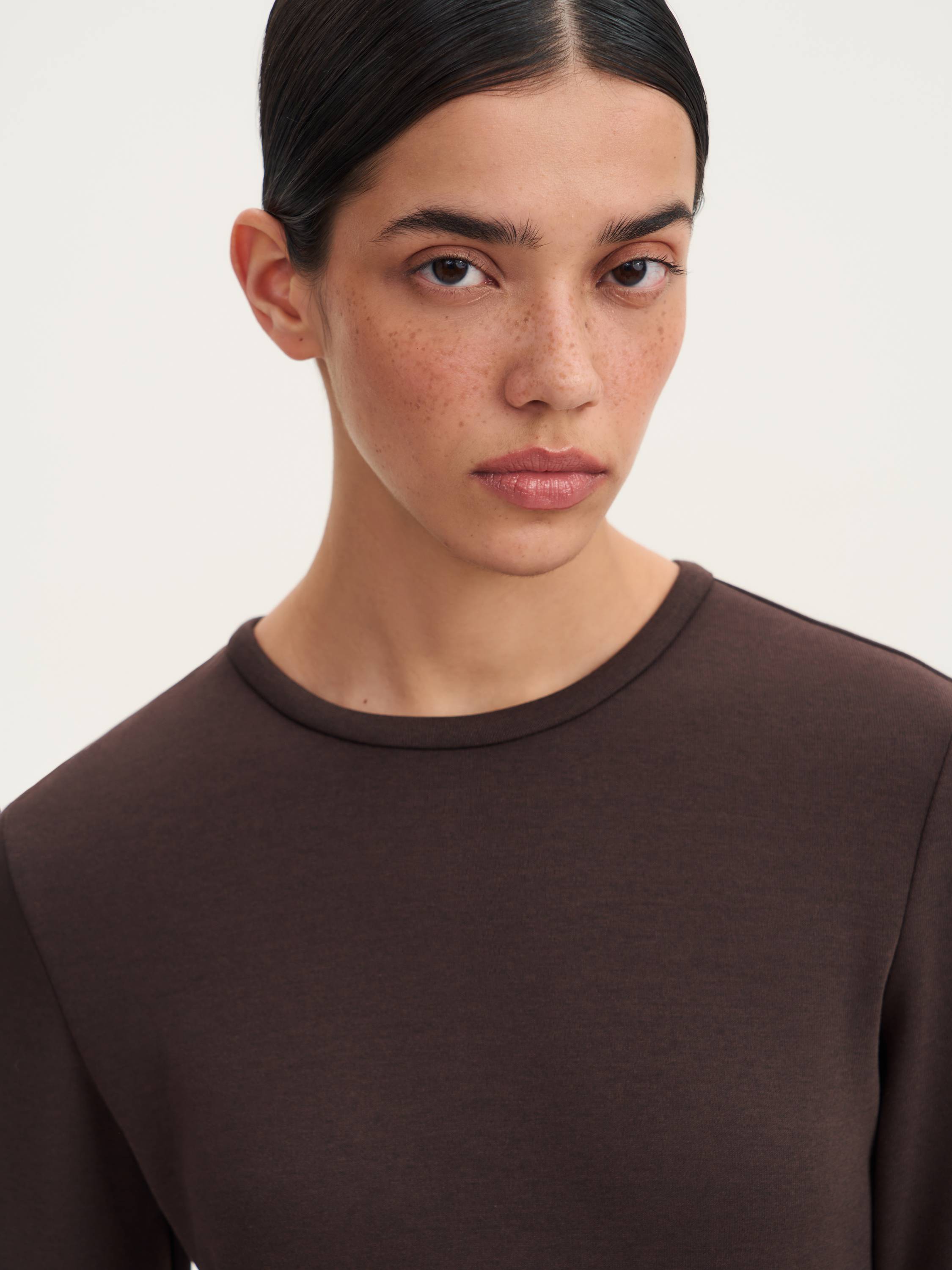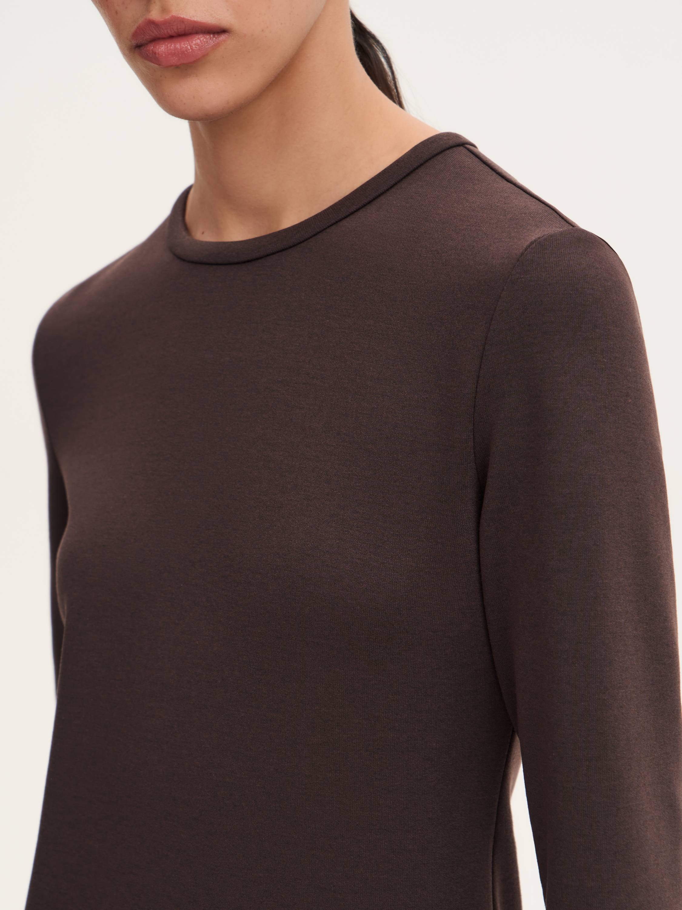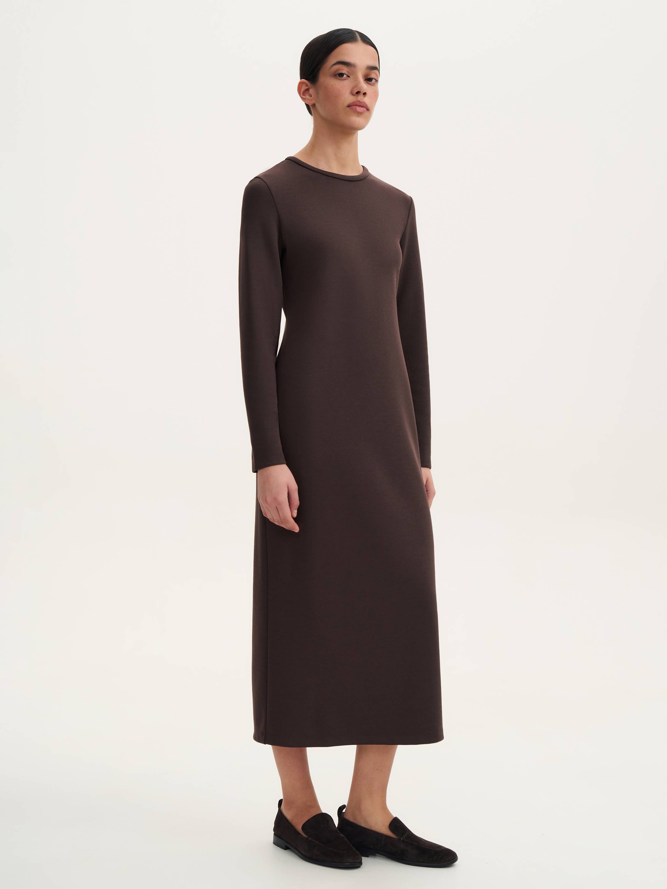 Платье прямого кроя длины миди выполнено из плотного трикотажа на основе вискозы, шерсти и синтетических волокон. Материал держит форму, при этом остается пластичным и комфортным в носке. Модель с округлым вырезом и длинными рукавами, без лишних деталей, что подчеркивает минималистичную эстетику. Сзади предусмотрен разрез для удобства движения. Чистые линии и лаконичный силуэт позволяют носить платье как в деловых, так и в повседневных образах.