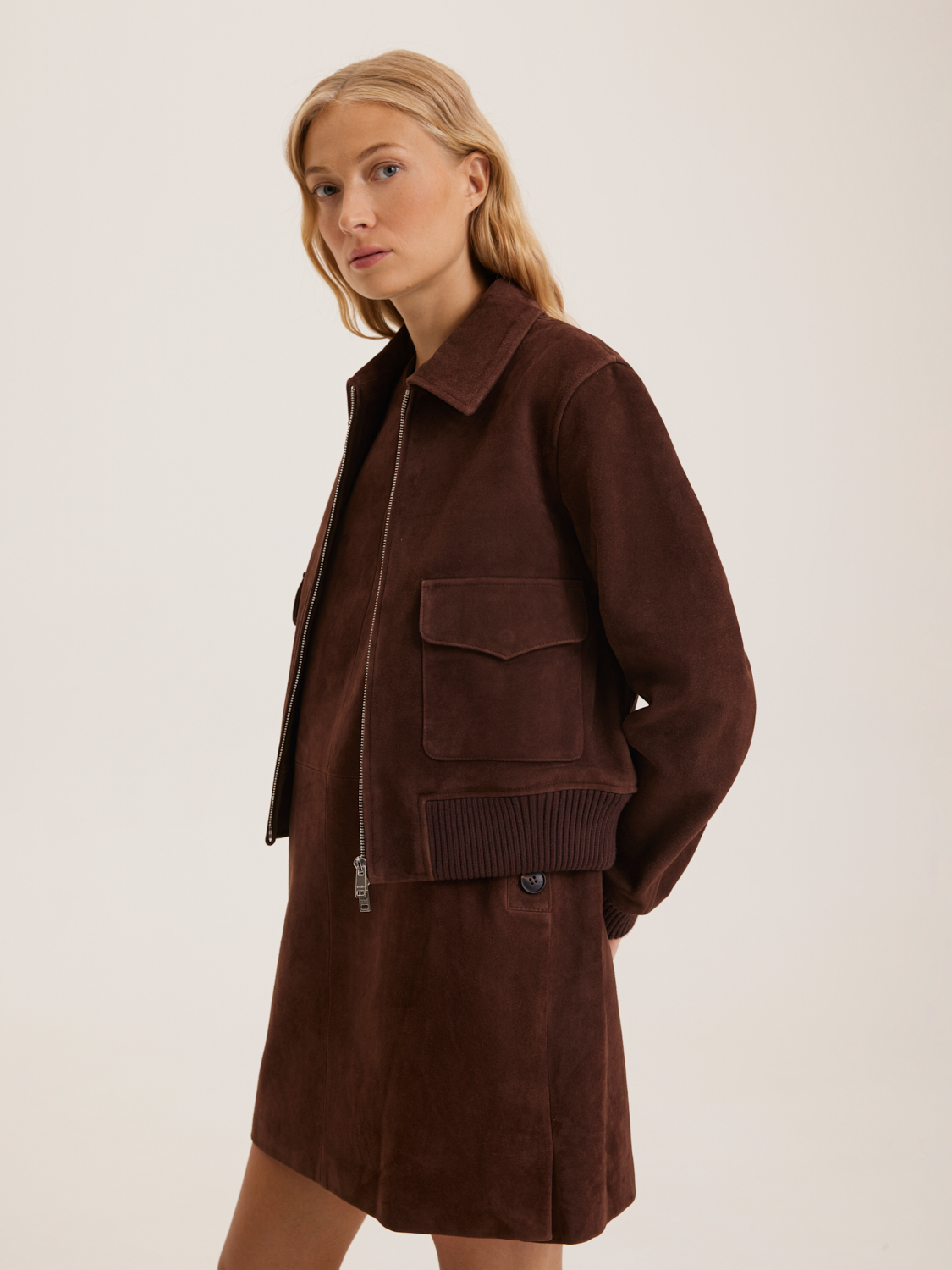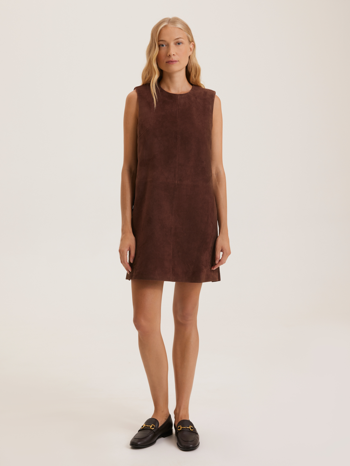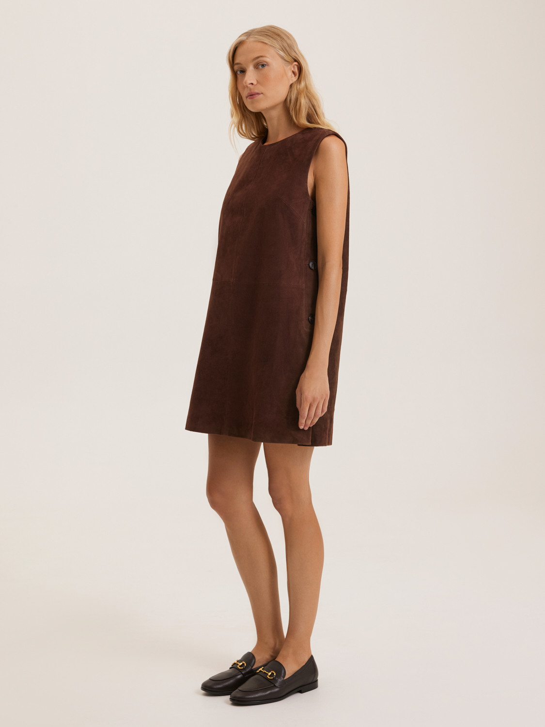 Платье из натуральной замши представлено в элегантном минималистичном стиле. Его приталенный фасон с боковыми карманами, обрамленными пуговицами, добавляет оригинальности и подчеркивает изящность силуэта. Платье выполнено из качественной замши, что обеспечивает мягкость и комфорт в носке. Идеально подходит для создания стильных повседневных и деловых образов. Длина платья до середины бедра делает его универсальным выбором для различных случаев. Модель носит размер S. Параметры модели: рост 172, 84-62-91.