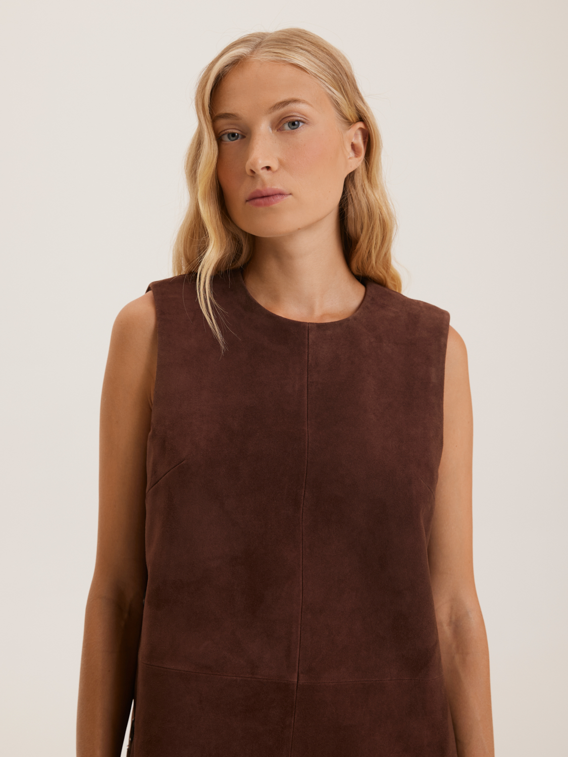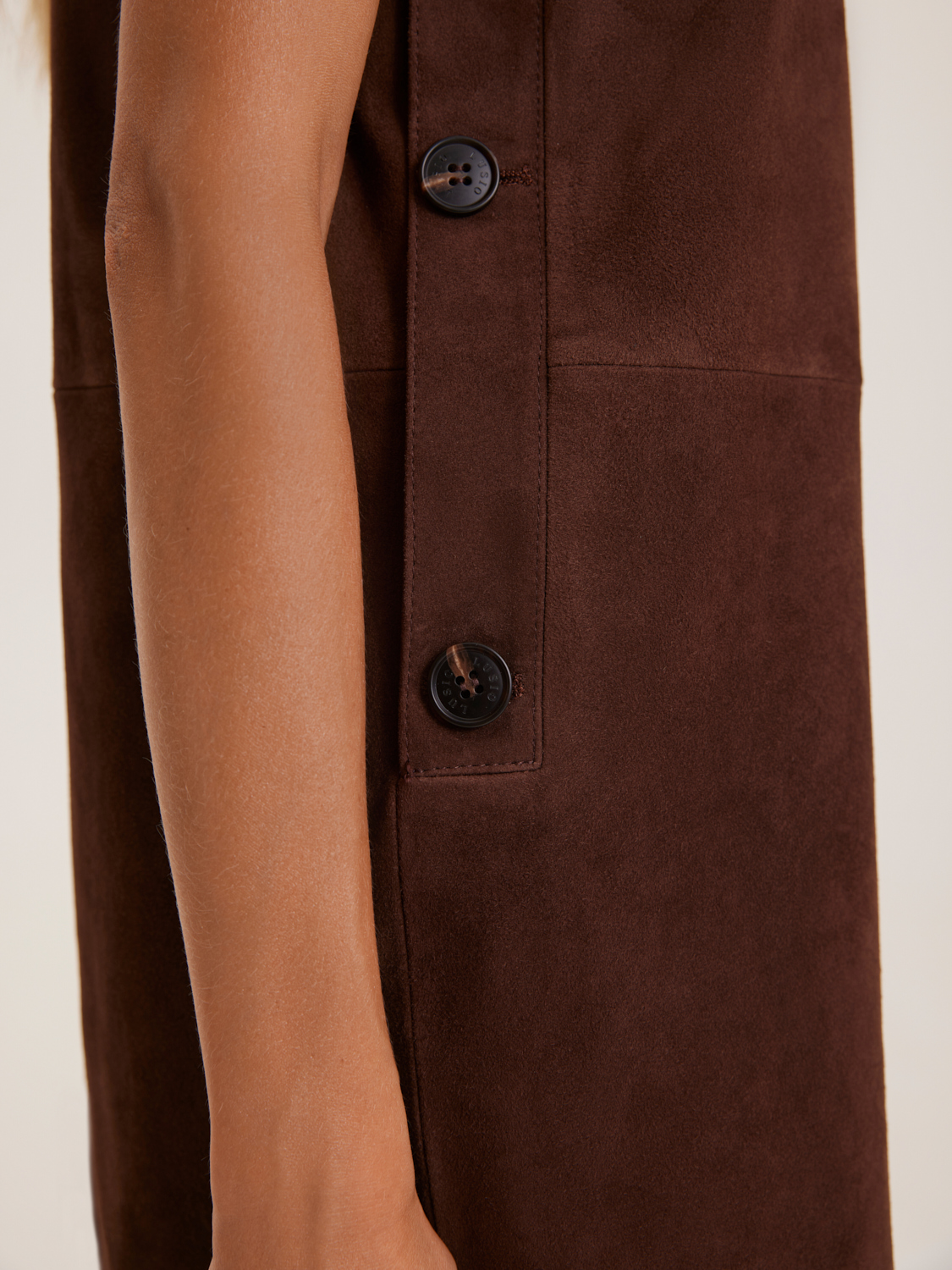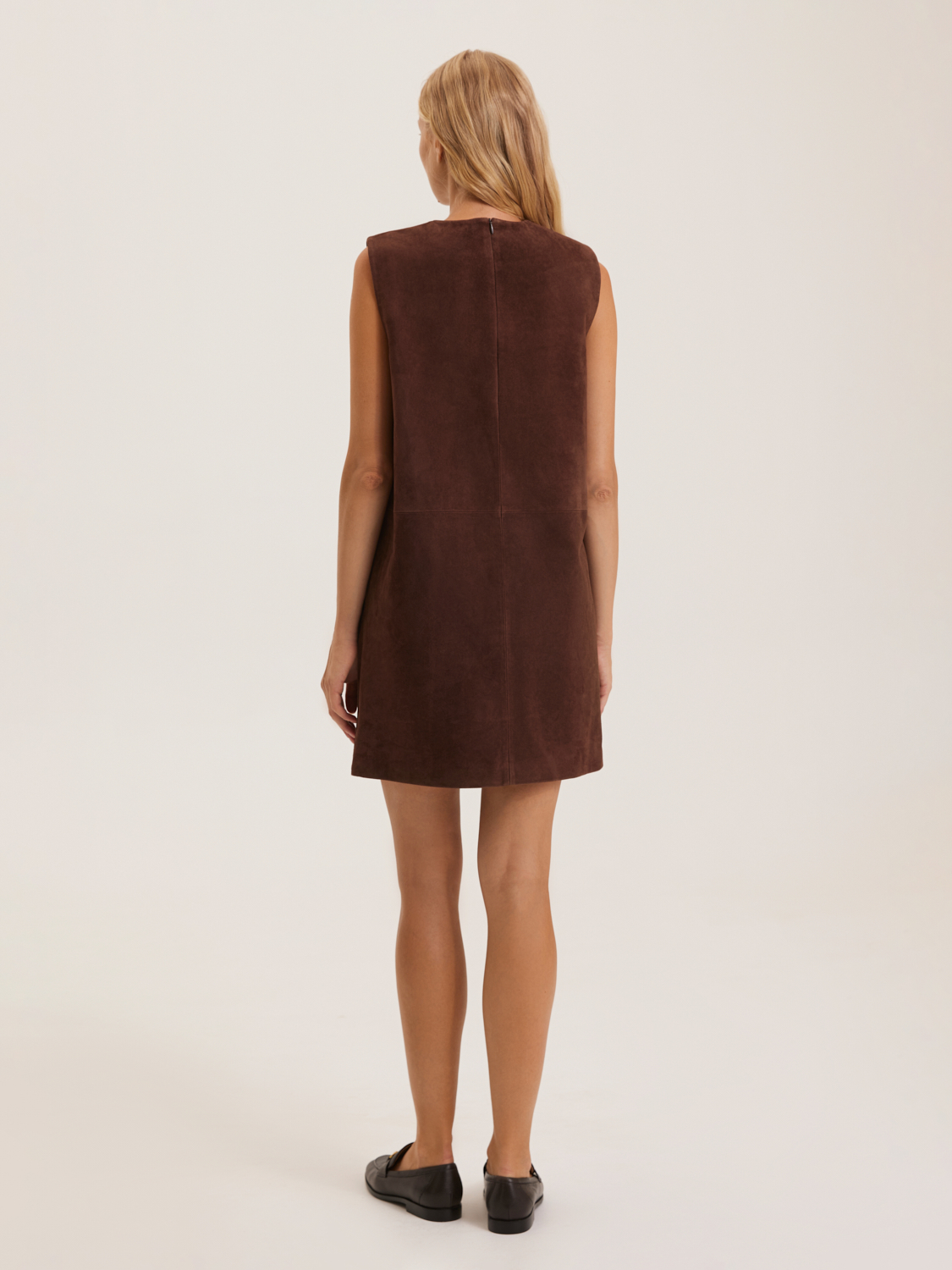 Платье из натуральной замши представлено в элегантном минималистичном стиле. Его приталенный фасон с боковыми карманами, обрамленными пуговицами, добавляет оригинальности и подчеркивает изящность силуэта. Платье выполнено из качественной замши, что обеспечивает мягкость и комфорт в носке. Идеально подходит для создания стильных повседневных и деловых образов. Длина платья до середины бедра делает его универсальным выбором для различных случаев. Модель носит размер S. Параметры модели: рост 172, 84-62-91.