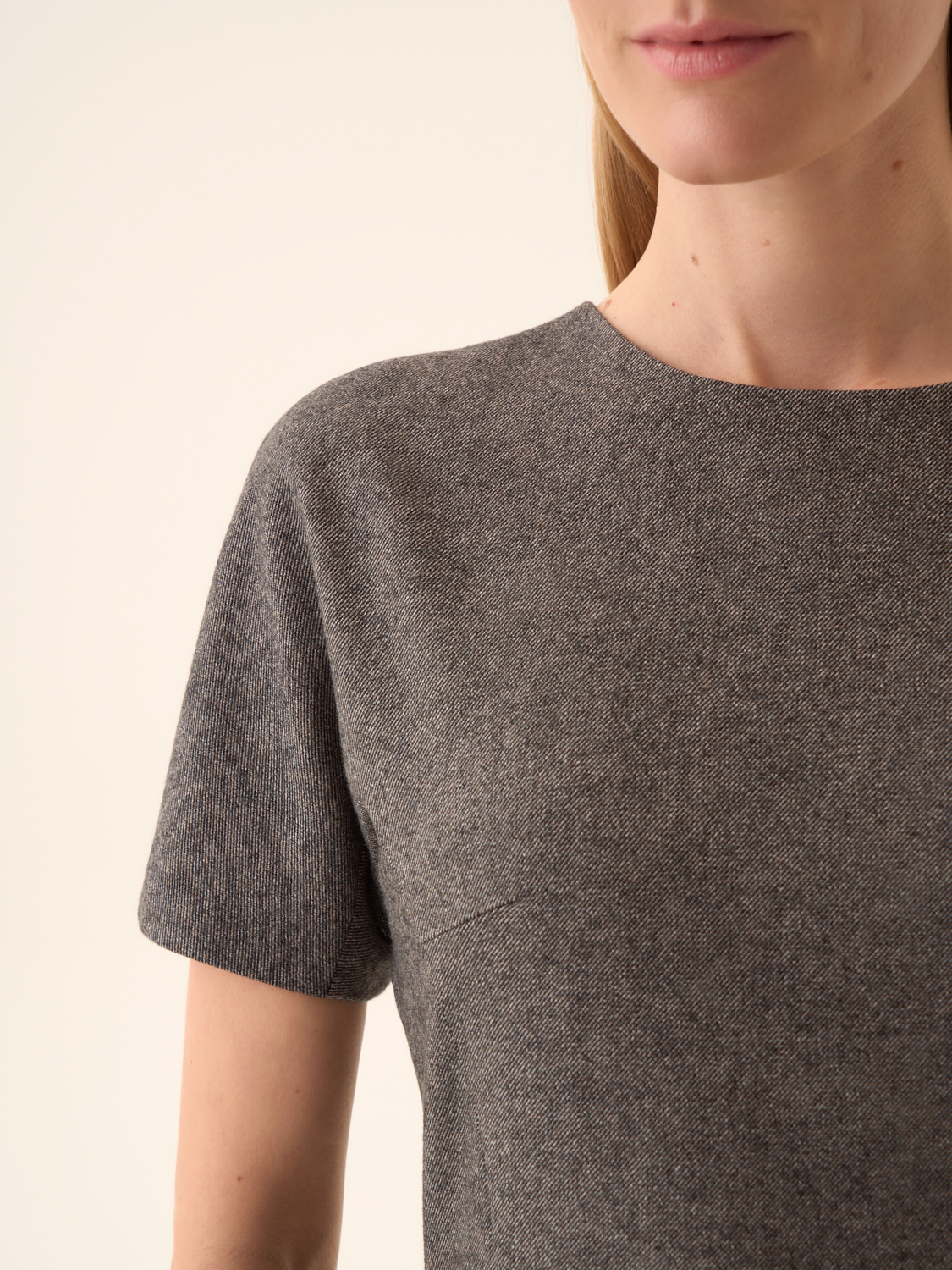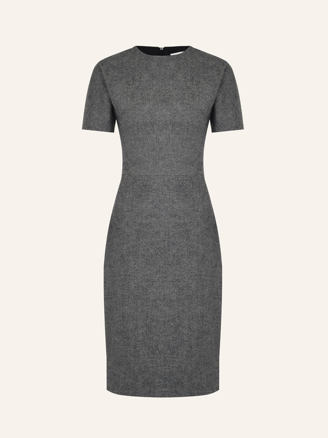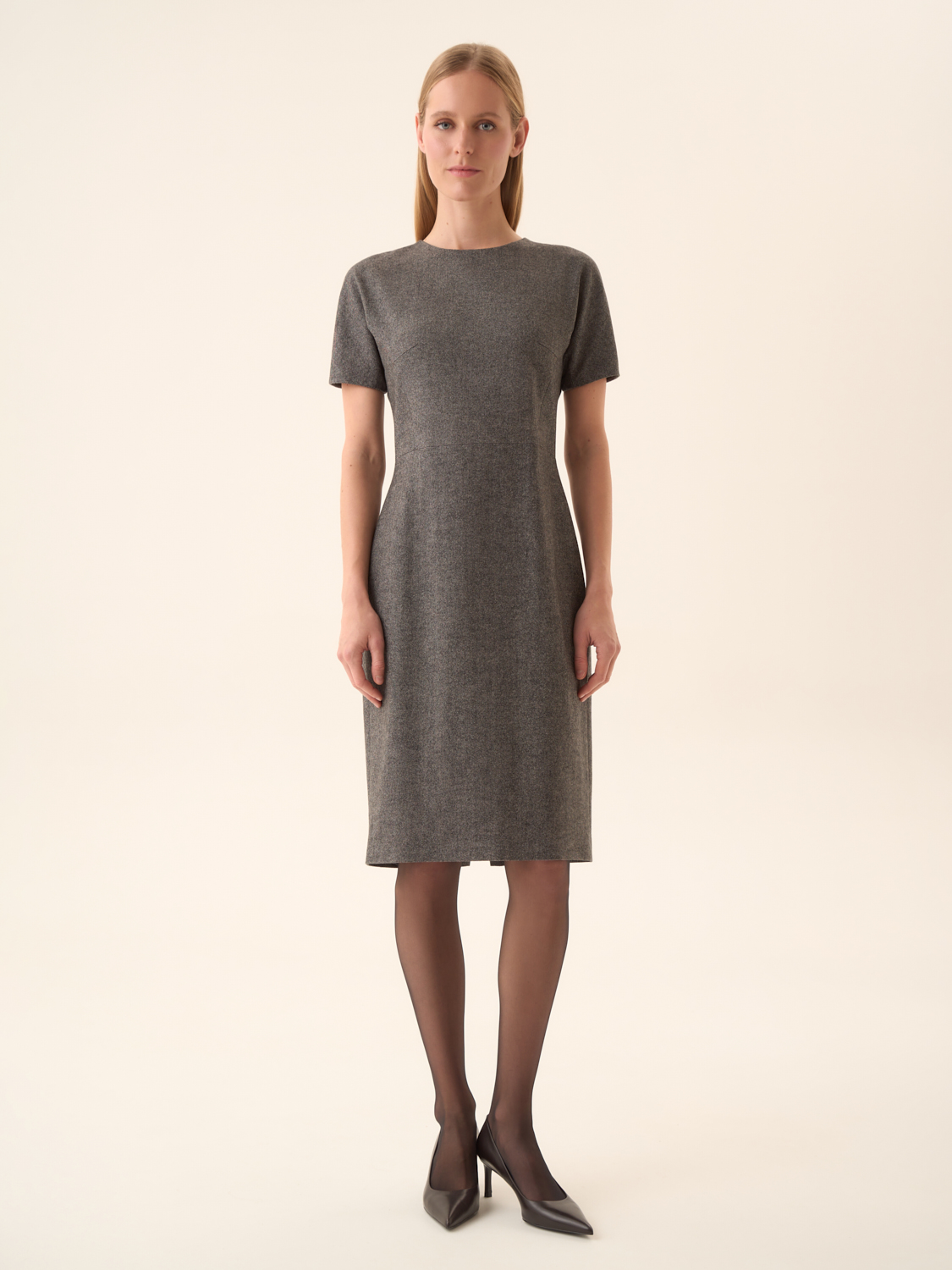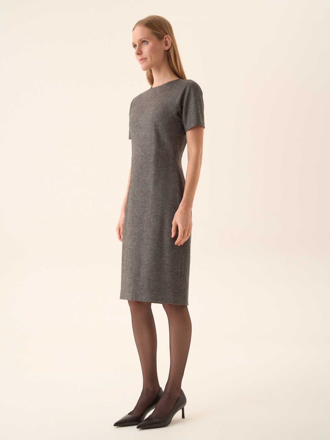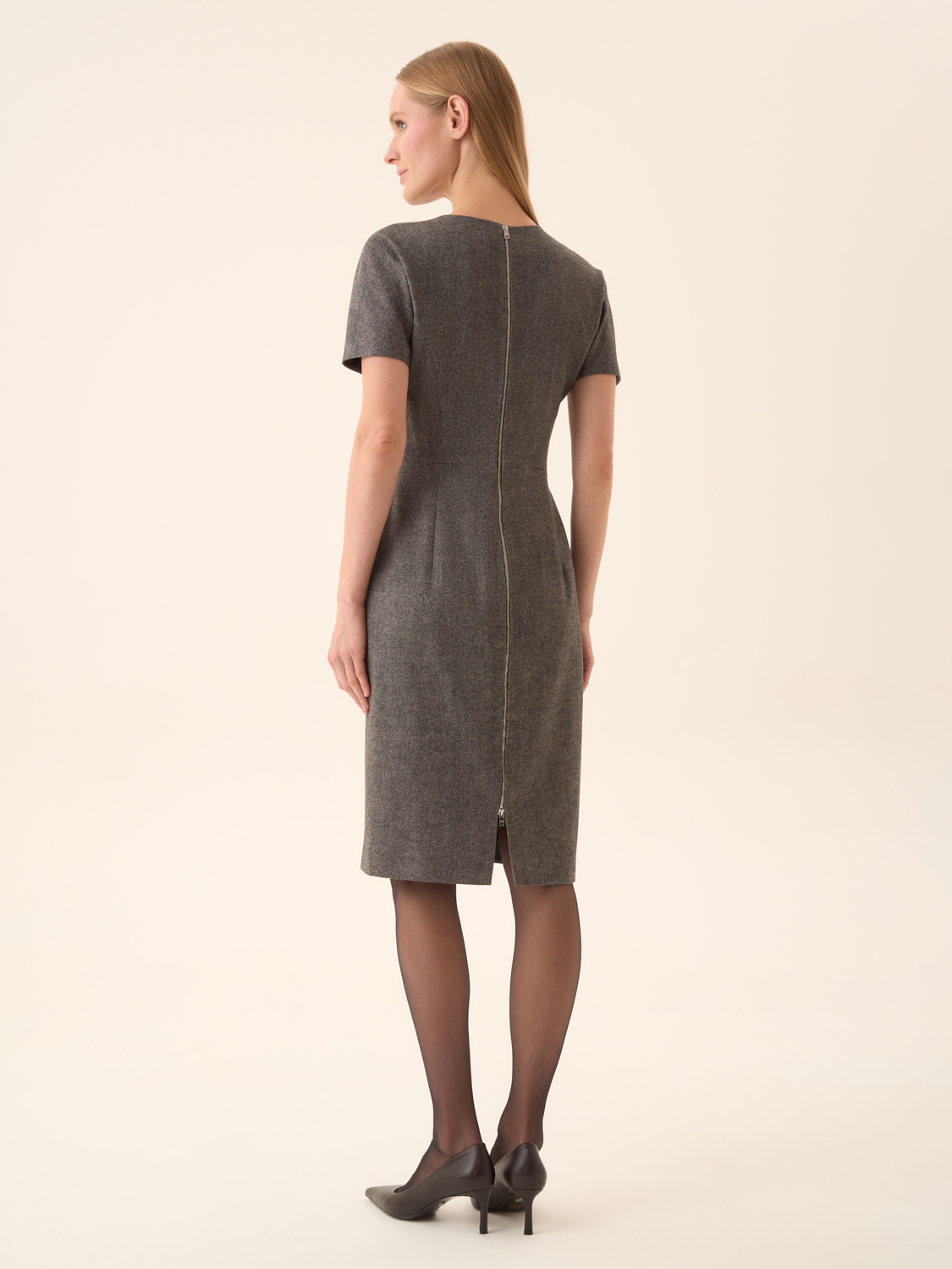 Платье-футляр из смесовой ткани на основе хлопка и шерсти с добавлением модала. Материал пластичный, с мягкой фактурой и деликатным теплом, обеспечивает комфортную посадку и сохраняет форму в течение дня. Крой прямой, с короткими рукавами и лаконичным круглым вырезом, формирующим чистую линию силуэта. На спинке — потайная молния и шлица для удобства движения. Минималистичный дизайн делает модель универсальной: она органично вписывается в деловые ансамбли с жакетами и туфлями, а также подходит для повседневных образов с кардиганами или тренчем.