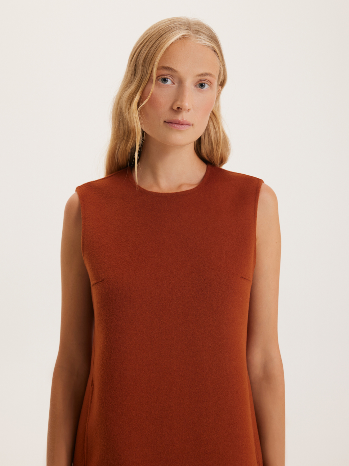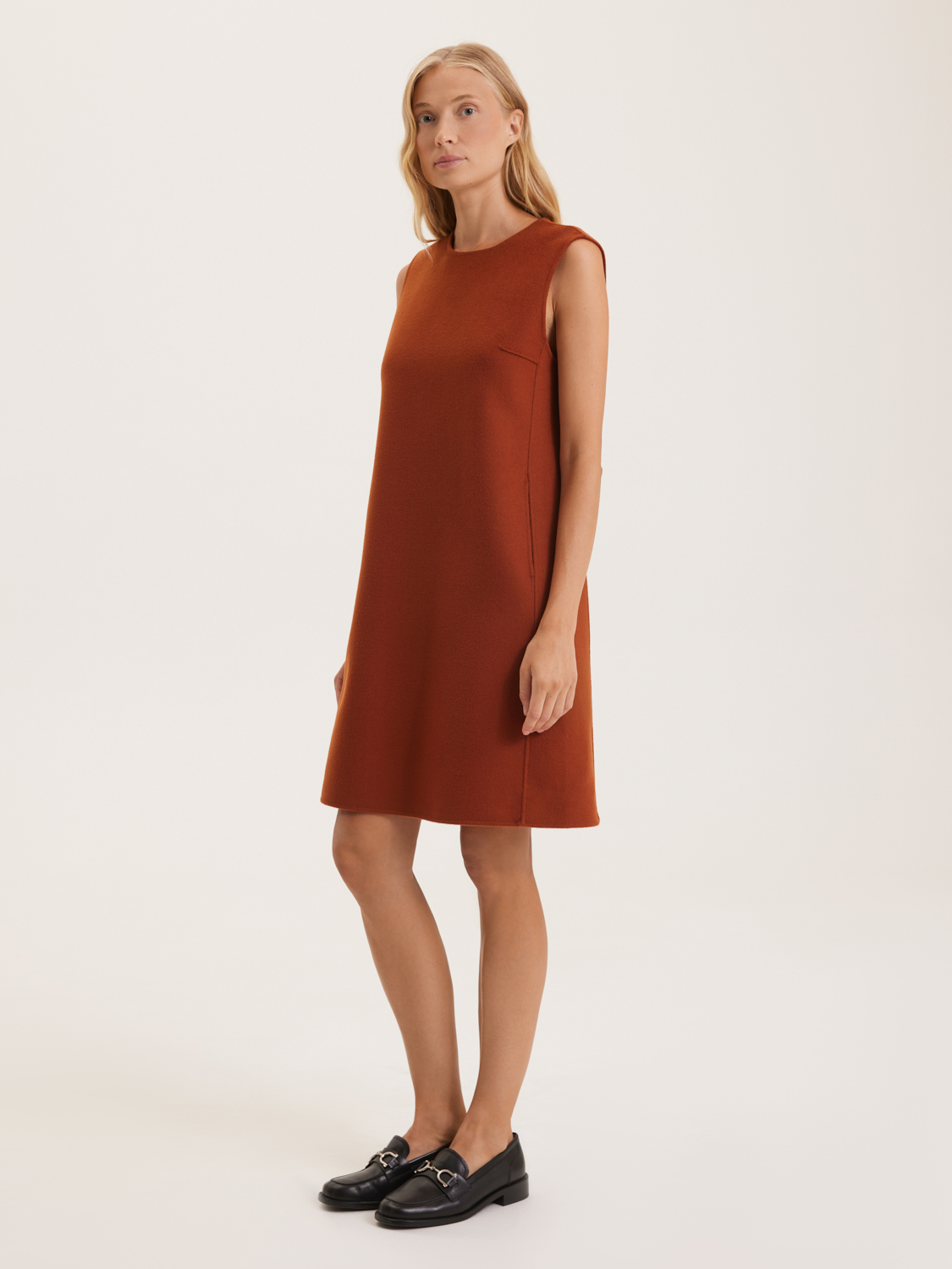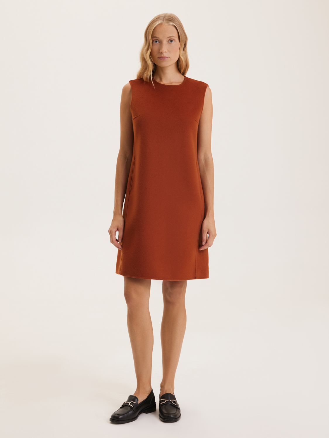 Лаконичное платье средней длины – это воплощение элегантности и комфорта. Мягкая ткань из шерсти австралийского мериноса обеспечивает тепло и удобство в холодное время года, оставаясь при этом легкой и дышащей. Прямой крой и отсутствие рукавов делают это платье идеальным для создания многослойных образов. Оно отлично сочетается с кардиганами, жакетами и пальто. В платье предусмотрены удобные карманы, что добавляет ему практичности. На модели размер S. Параметры модели: рост 172, 84-62-91.