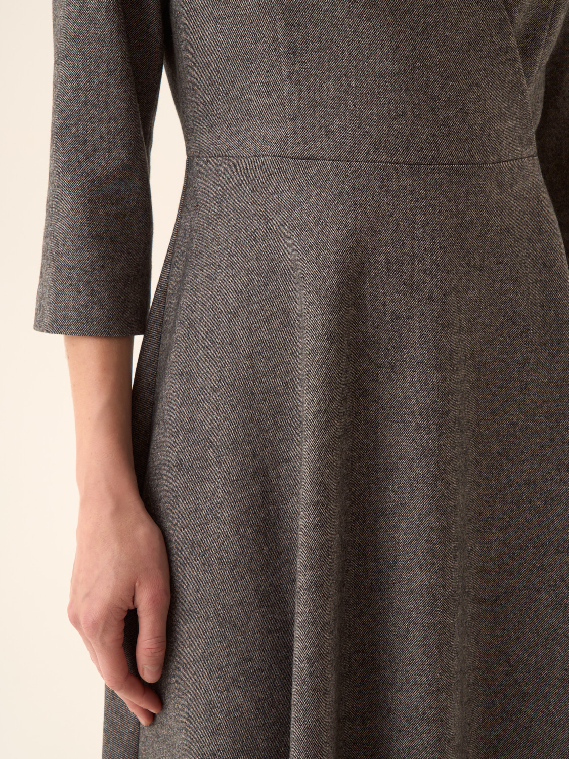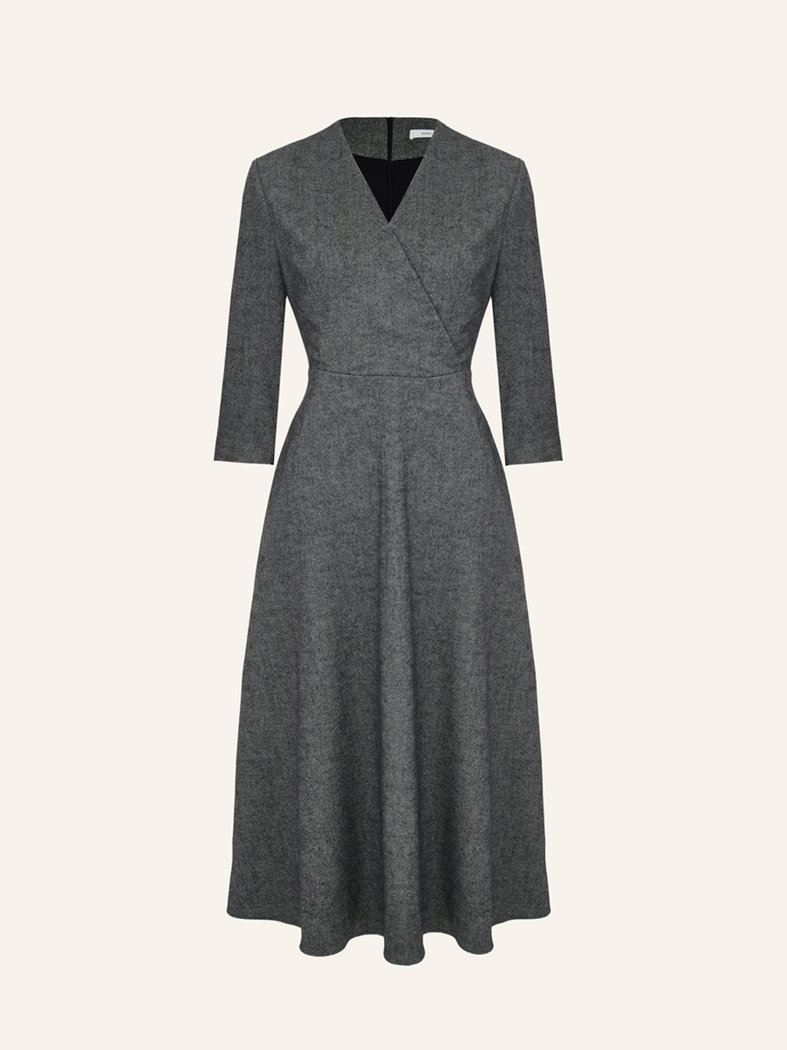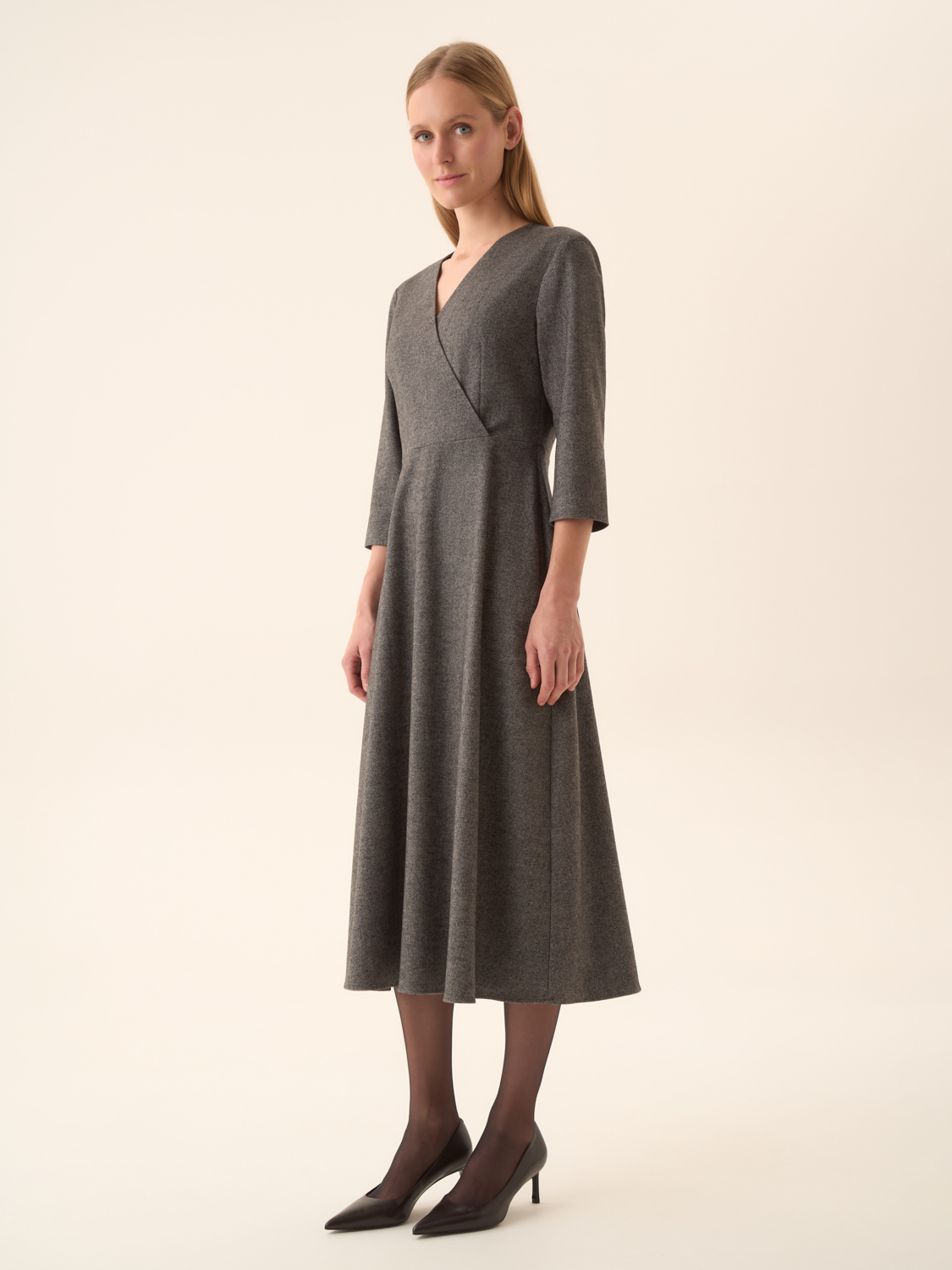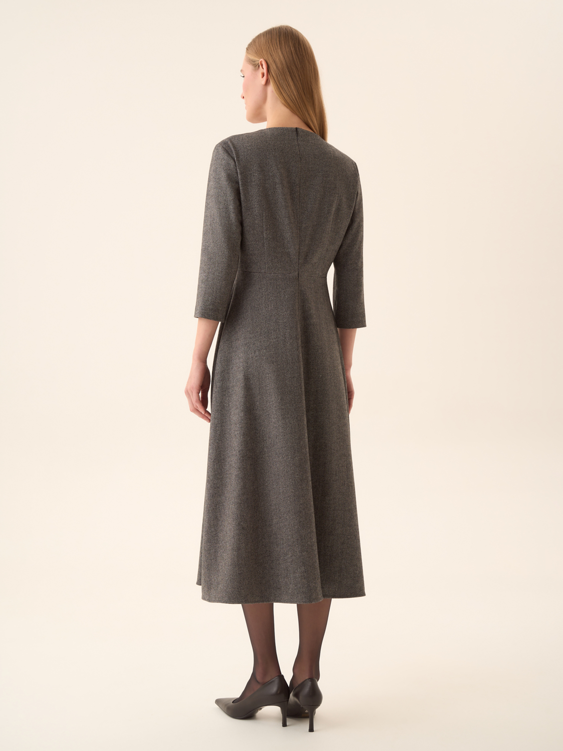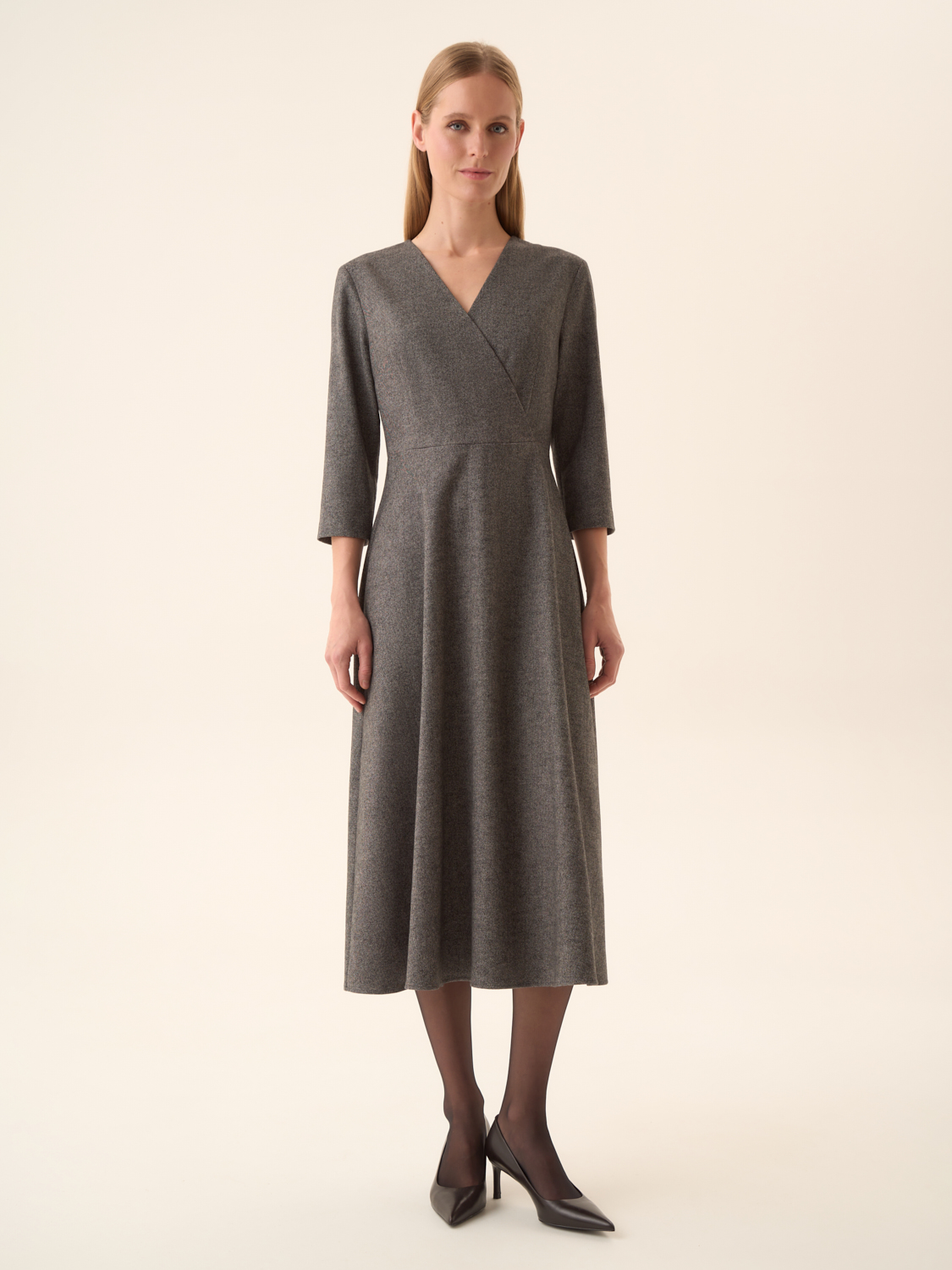Платье миди из мягкого смесового полотна на основе хлопка и шерсти с добавлением модала и эластана. Материал пластичный, сдержанный по фактуре, обеспечивает комфорт и аккуратную посадку. Крой приталенный в верхней части с плавным расширением к подолу, что подчеркивает линию талии и формирует женственный силуэт. V-образное перекрестное декольте и рукава 3/4 придают модели элегантность, а длина миди делает ее универсальной для разных случаев. Аккуратная застежка сзади завершает образ, сохраняя чистоту линий.