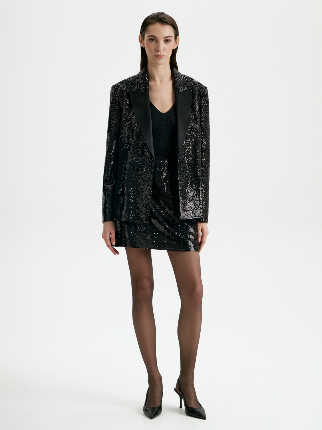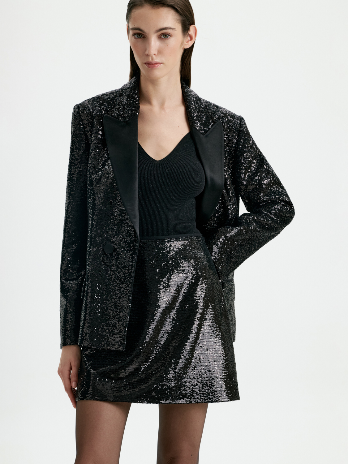 Юбка мини, расшитая пайетками, — выбор для ярких и эффектных образов. Ее сияние притягивает взгляды, превращая любой образ в настоящий шедевр. Прямой крой подчеркивает изящество фигуры, а пайетки создают игру света, добавляя динамичности. Лаконичный крой подчеркивает линию бедер, создавая женственный и элегантный силуэт. Легкая подкладка обеспечивает комфорт и удобство в носке. Эта юбка станет идеальной основой для яркого тотал лука, особенно в сочетании с пиджаком, расшитым пайетками. Такой ансамбль подчеркнет вашу уверенность и поможет блистать на любом мероприятии. Дополните образ лаконичным топом и обувью на каблуке, чтобы создать гармоничный и ультрамодный наряд.
