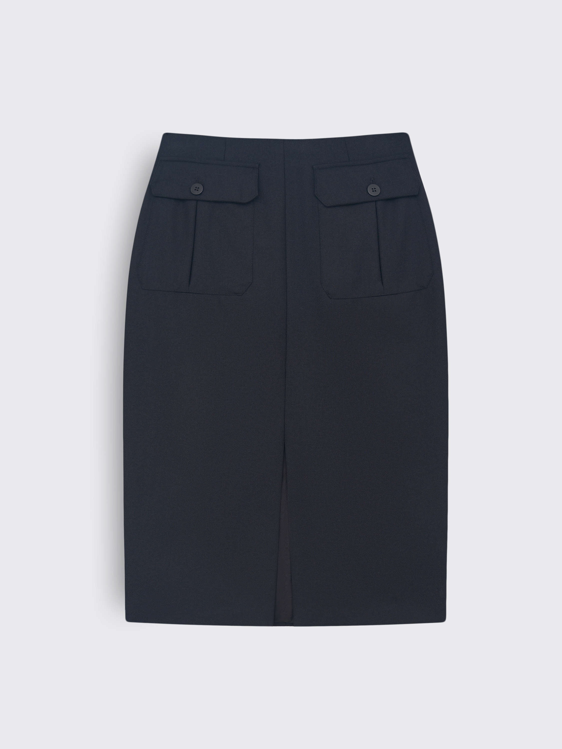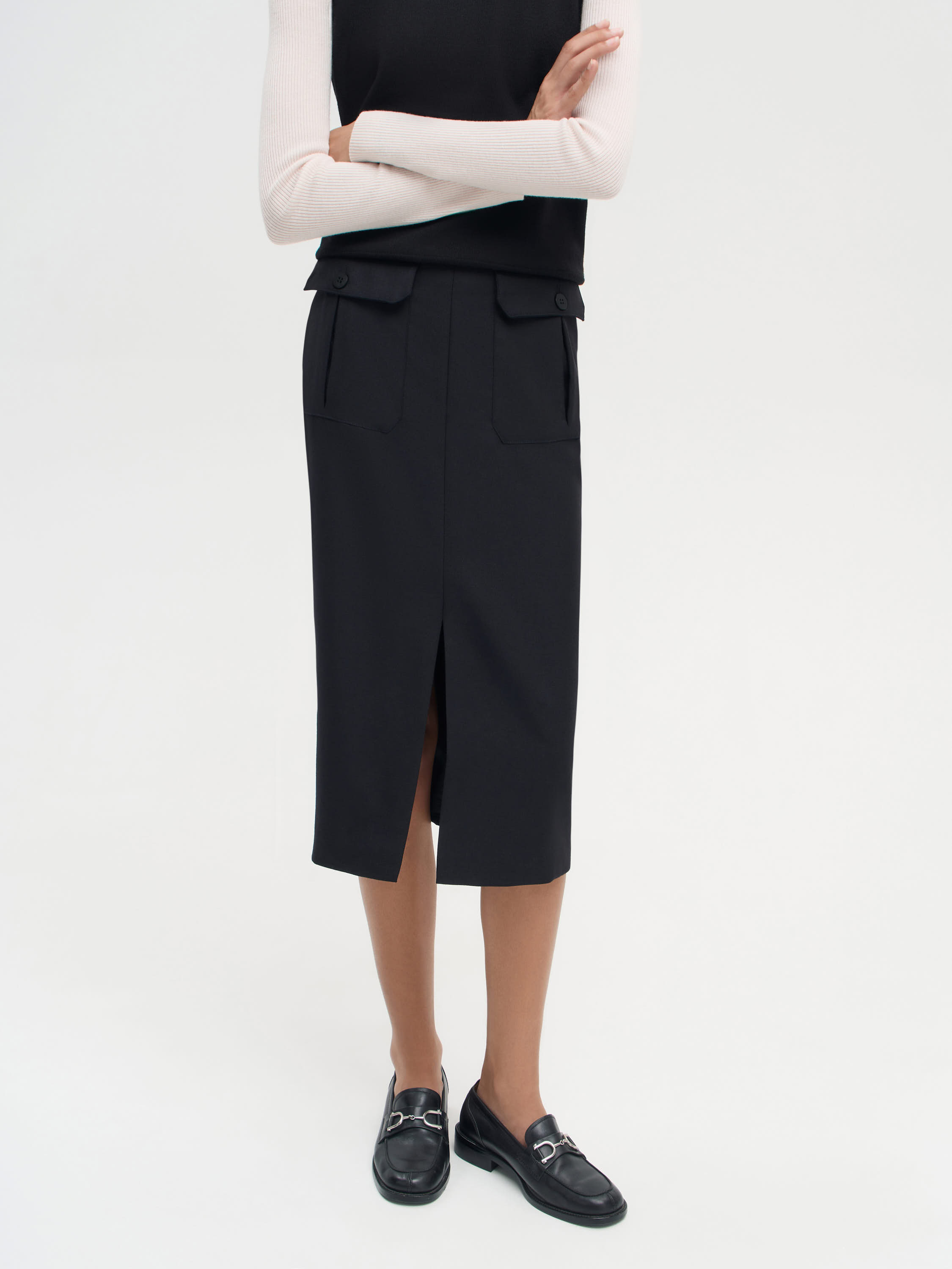 Юбка выполнена из 100% шерсти, материал плотный и структурный, с естественной драпировкой и выразительной фактурой. Прямой крой длины миди дополнен аккуратным разрезом спереди, который обеспечивает свободу движения и делает силуэт динамичным. На линии бедра — накладные клапаны с пуговицами, создающие графичный акцент. Лаконичный дизайн и чистые линии подчеркивают универсальность модели: юбка вписывается как в деловые комплекты с жакетами и рубашками, так и в повседневные образы с трикотажем.
