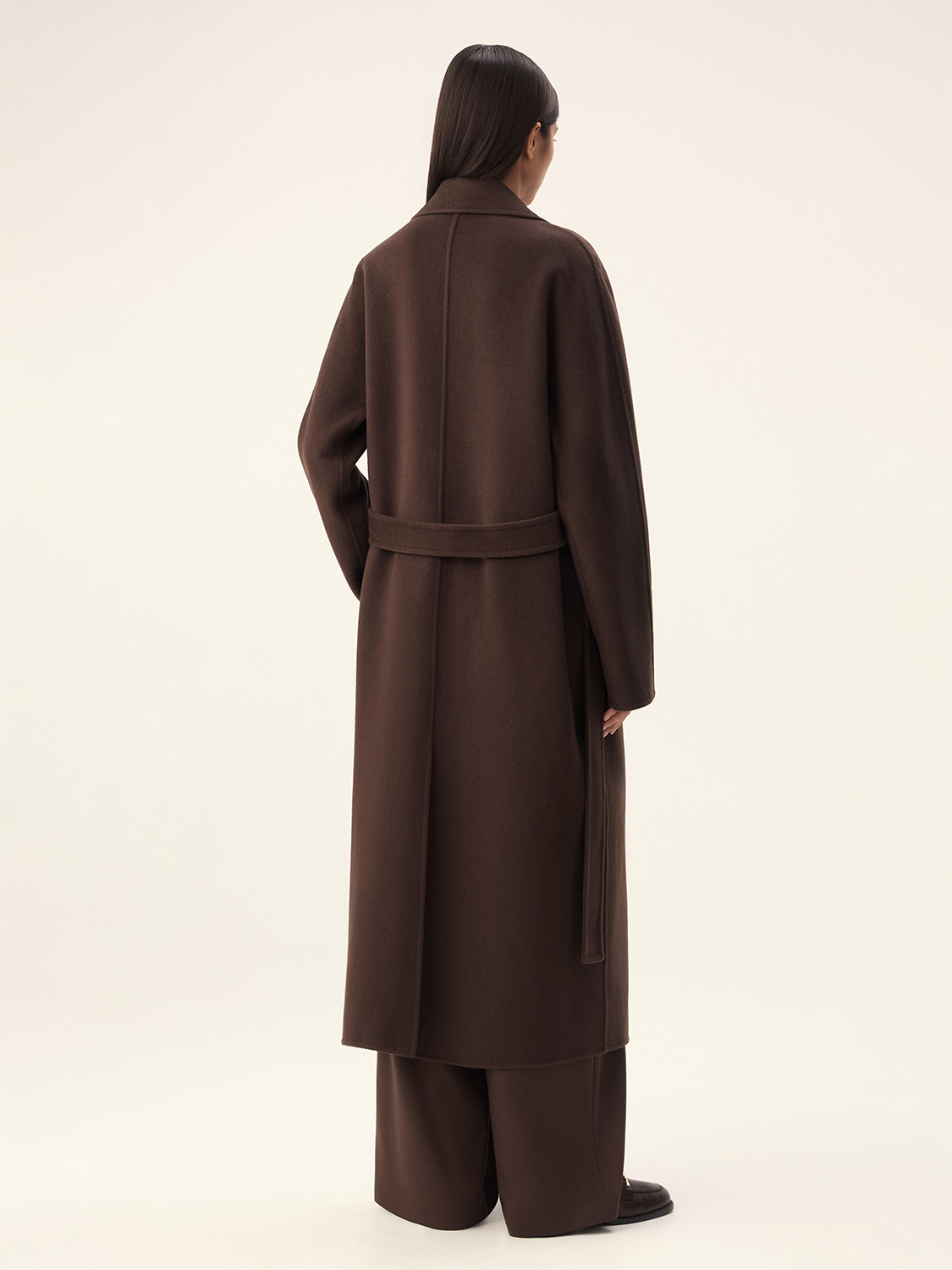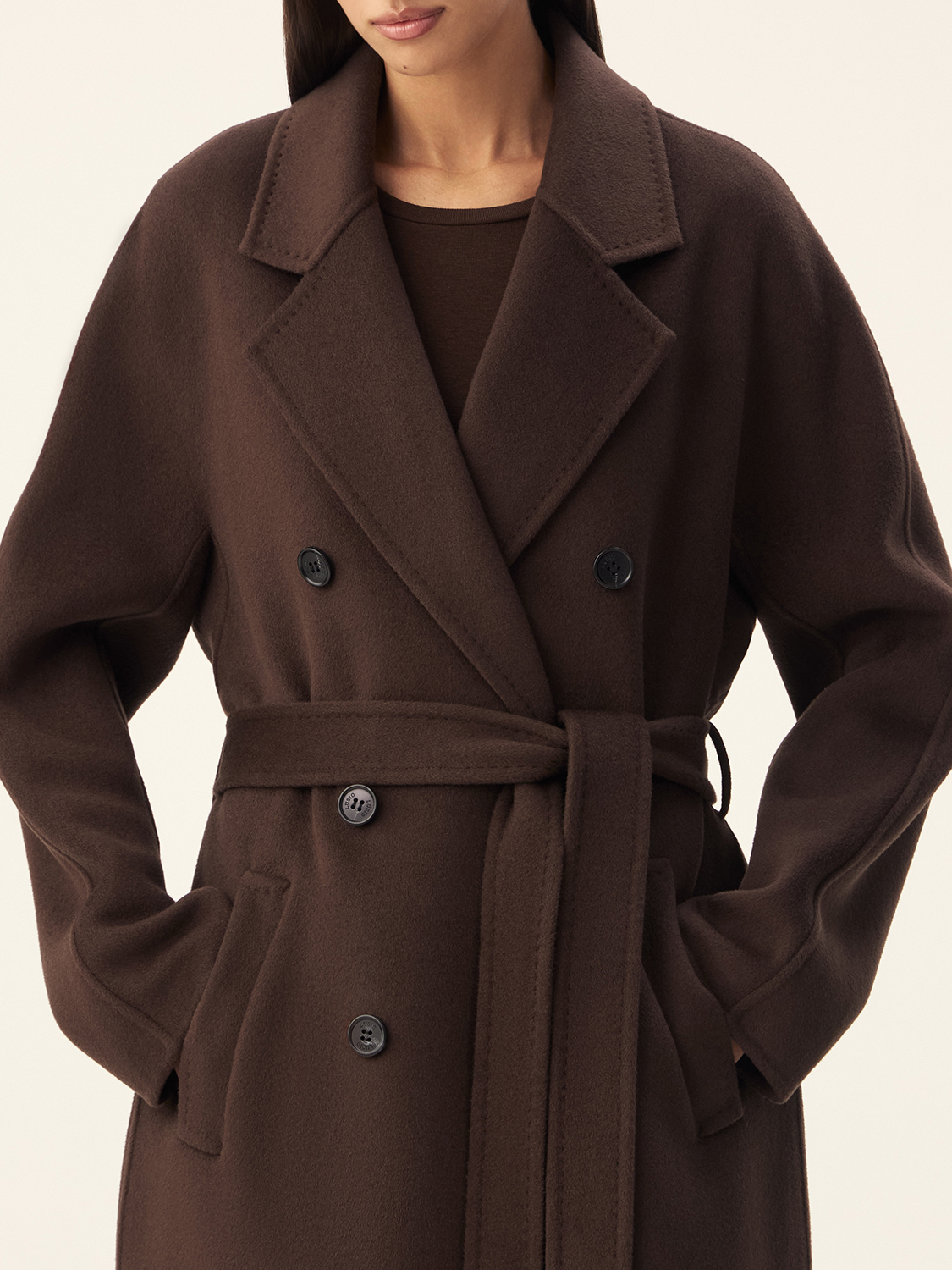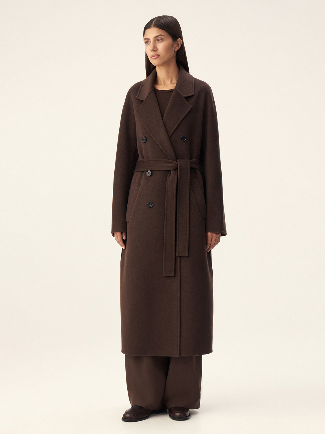 Элегантное двубортное пальто из шерсти мериноса и кашемира — это воплощение лаконичного стиля и комфорта. Длинный пояс подчеркивает талию, а классический крой с акцентом на плечи создает изящный силуэт. Благодаря сочетанию шерсти мериноса и кашемира, пальто обладает отличными терморегулирующими свойствами, обеспечивая тепло в холодную погоду, но не перегревая. Идеальный выбор для тех, кто ценит сочетание элегантности и функциональности в осенне-зимнем гардеробе. Параметры модели: рост 178 см, размер S.