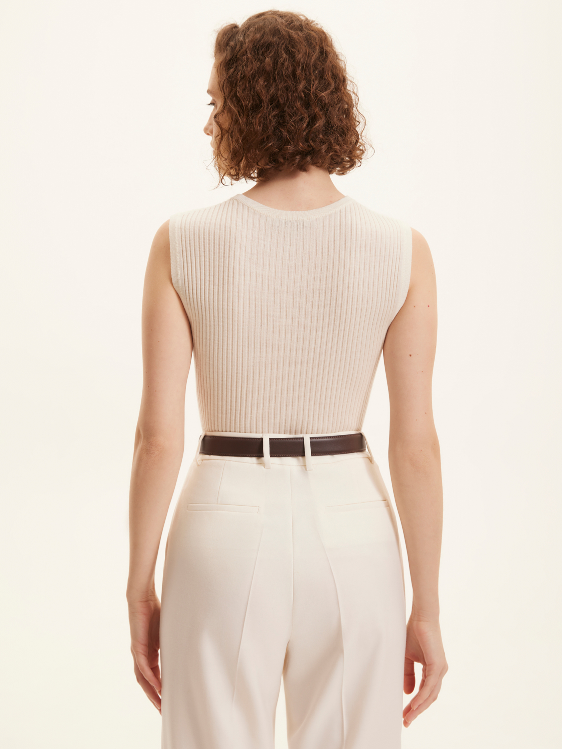Трикотажная блузка без рукавов из шерсти мериноса. Изделие выполнено из высококачественной шерсти австралийского мериноса, что обеспечивает мягкость и тепло. Тонкий трикотаж подчеркивает фигуру, создавая элегантный и современный образ. Приталенный силуэт и отсутствие рукавов делают эту блузку идеальным выбором для многослойных нарядов или самостоятельного ношения в теплую погоду. Носите ее с юбками или брюками, чтобы создать стильный и законченный лук. На модели размер S. Параметры модели: рост 176, 85-60-89.