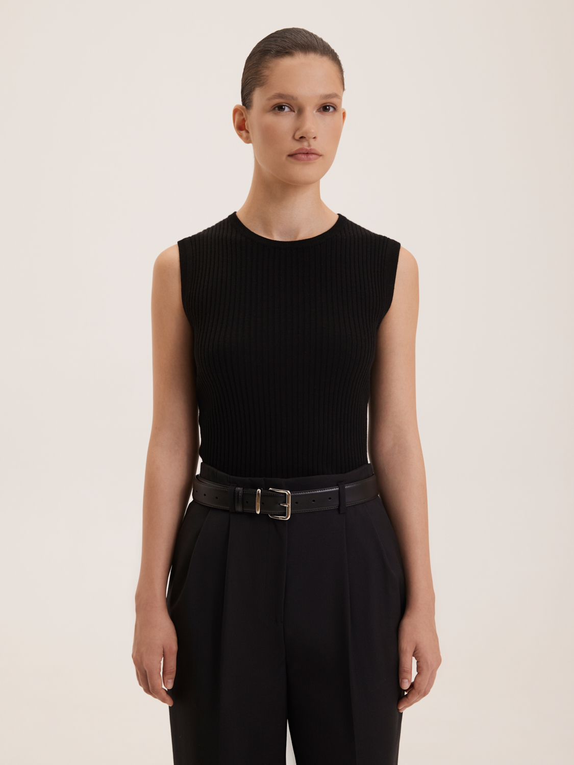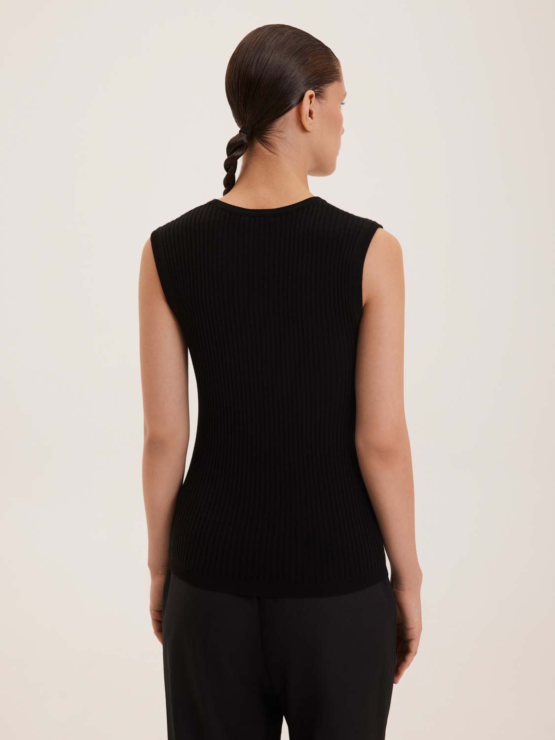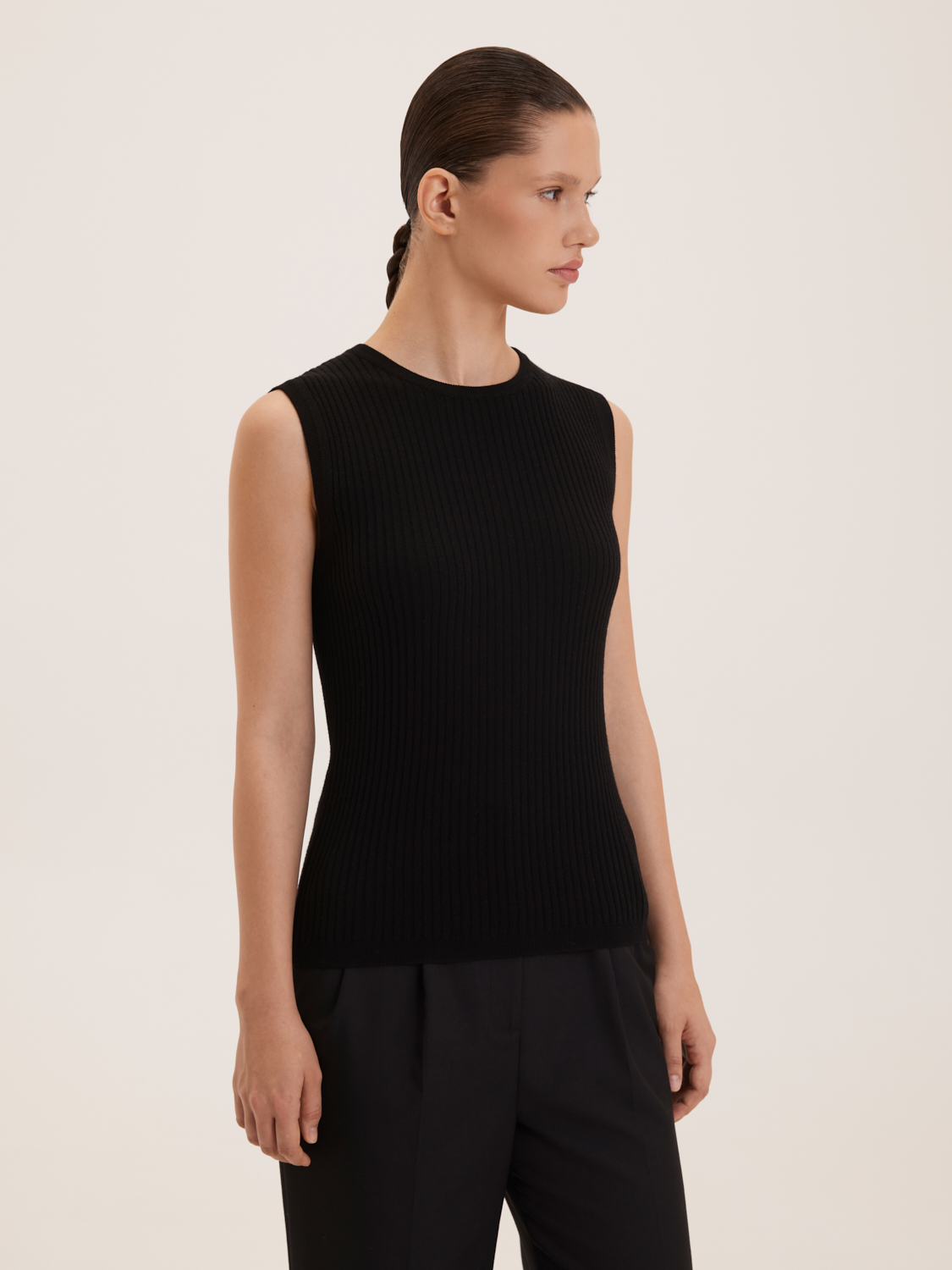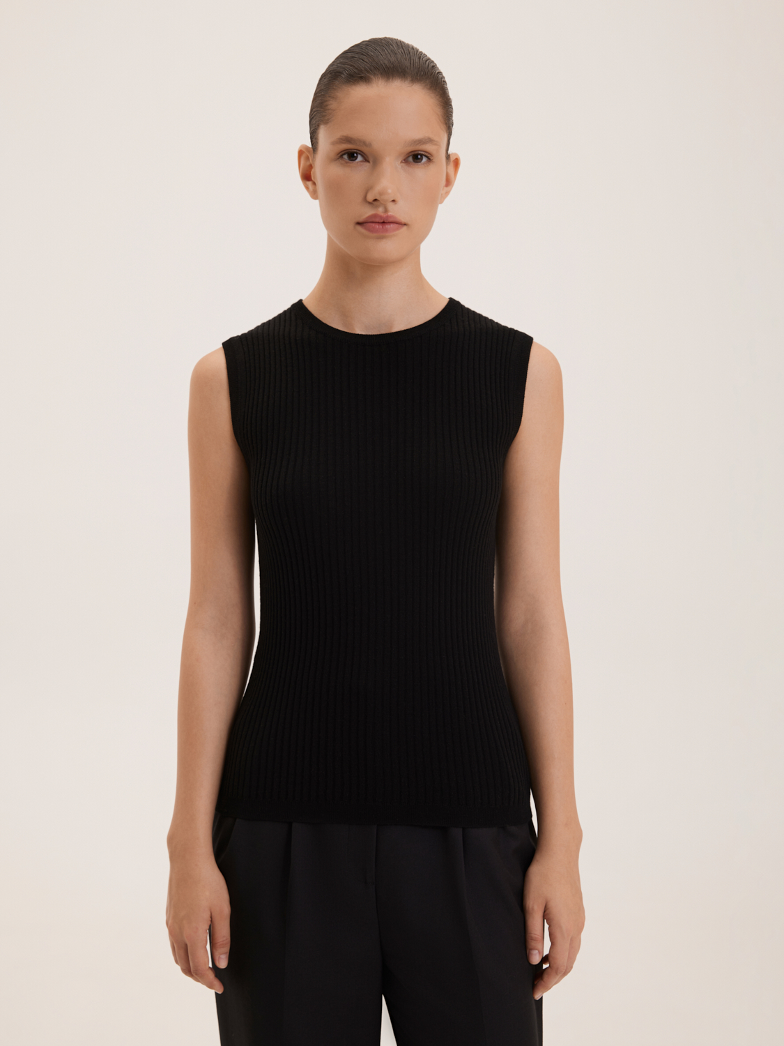 Трикотажная блузка без рукавов из шерсти мериноса. Изделие выполнено из высококачественной шерсти австралийского мериноса, что обеспечивает мягкость и тепло. Тонкий трикотаж подчеркивает фигуру, создавая элегантный и современный образ. Приталенный силуэт и отсутствие рукавов делают эту блузку идеальным выбором для многослойных нарядов или самостоятельного ношения в теплую погоду. Носите ее с юбками или брюками, чтобы создать стильный и законченный лук. На модели размер S. Параметры модели: рост 176, 85-60-89.