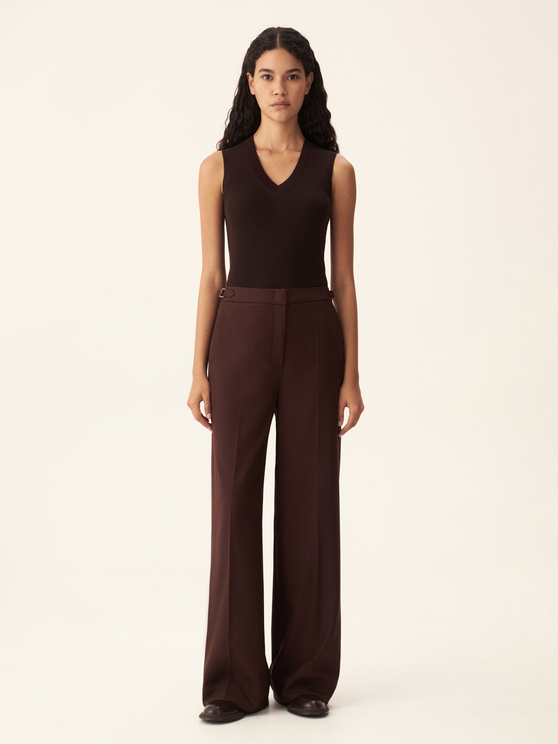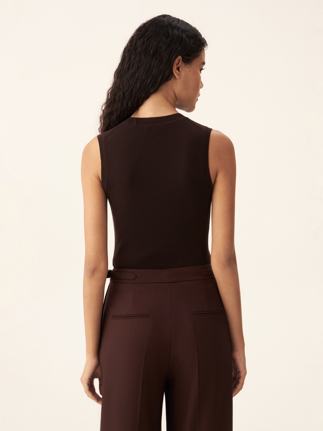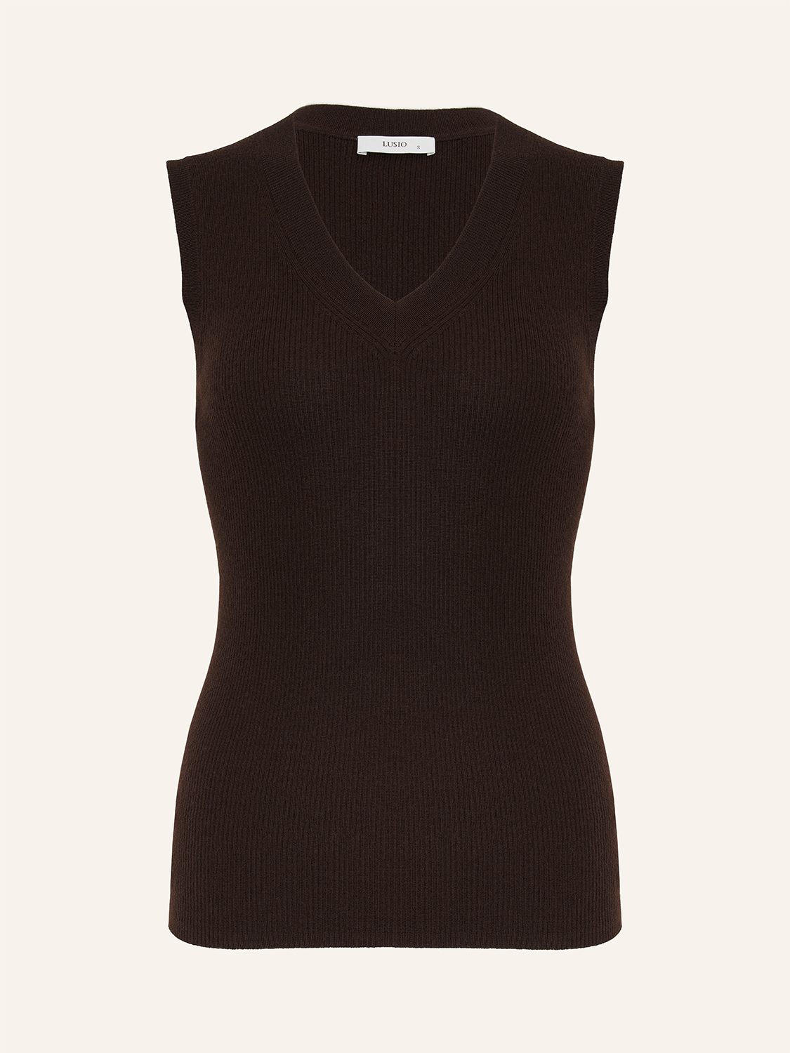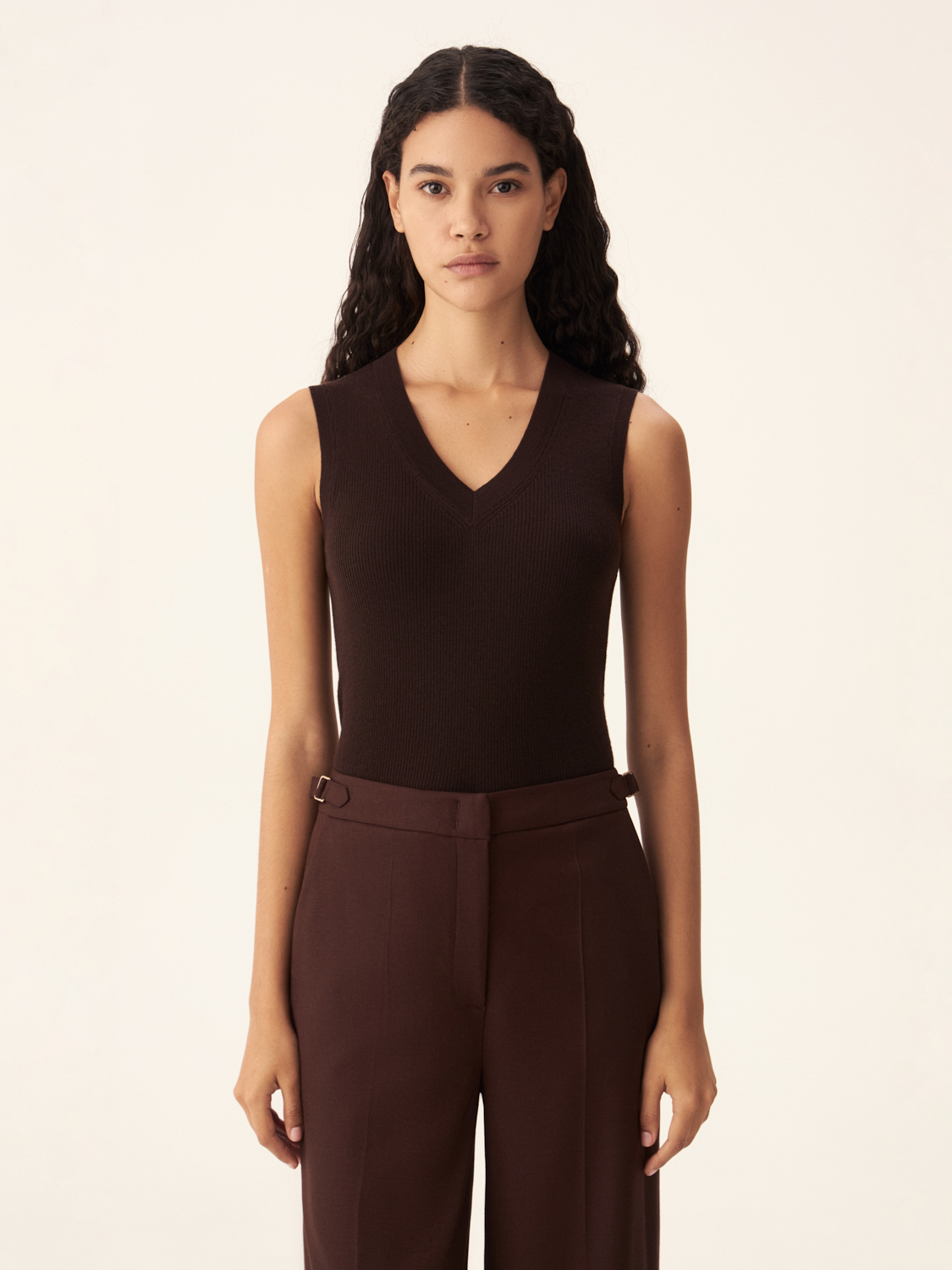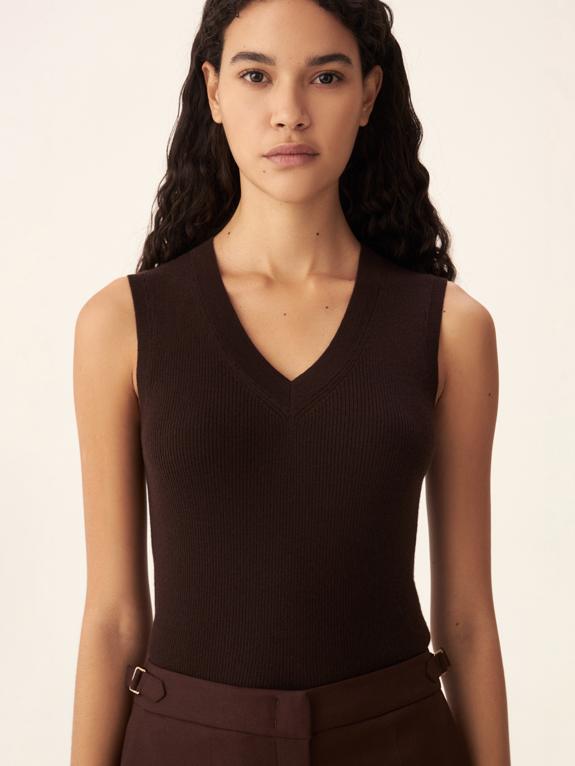 Трикотажный топ без рукавов в базовом оттенке станет идеальным элементом вашего гардероба. Благодаря лаконичному дизайну и глубокому V-образному вырезу, эта модель легко комбинируется как с деловыми, так и с повседневными образами. Плотная трикотажная текстура нежно облегает фигуру, подчеркивая силуэт, а отсутствие рукавов придает образу легкость и динамичность. Этот универсальный топ можно носить как самостоятельный элемент или сочетать с жакетами и кардиганами в прохладное время года. Параметры модели: 178/78/60/88