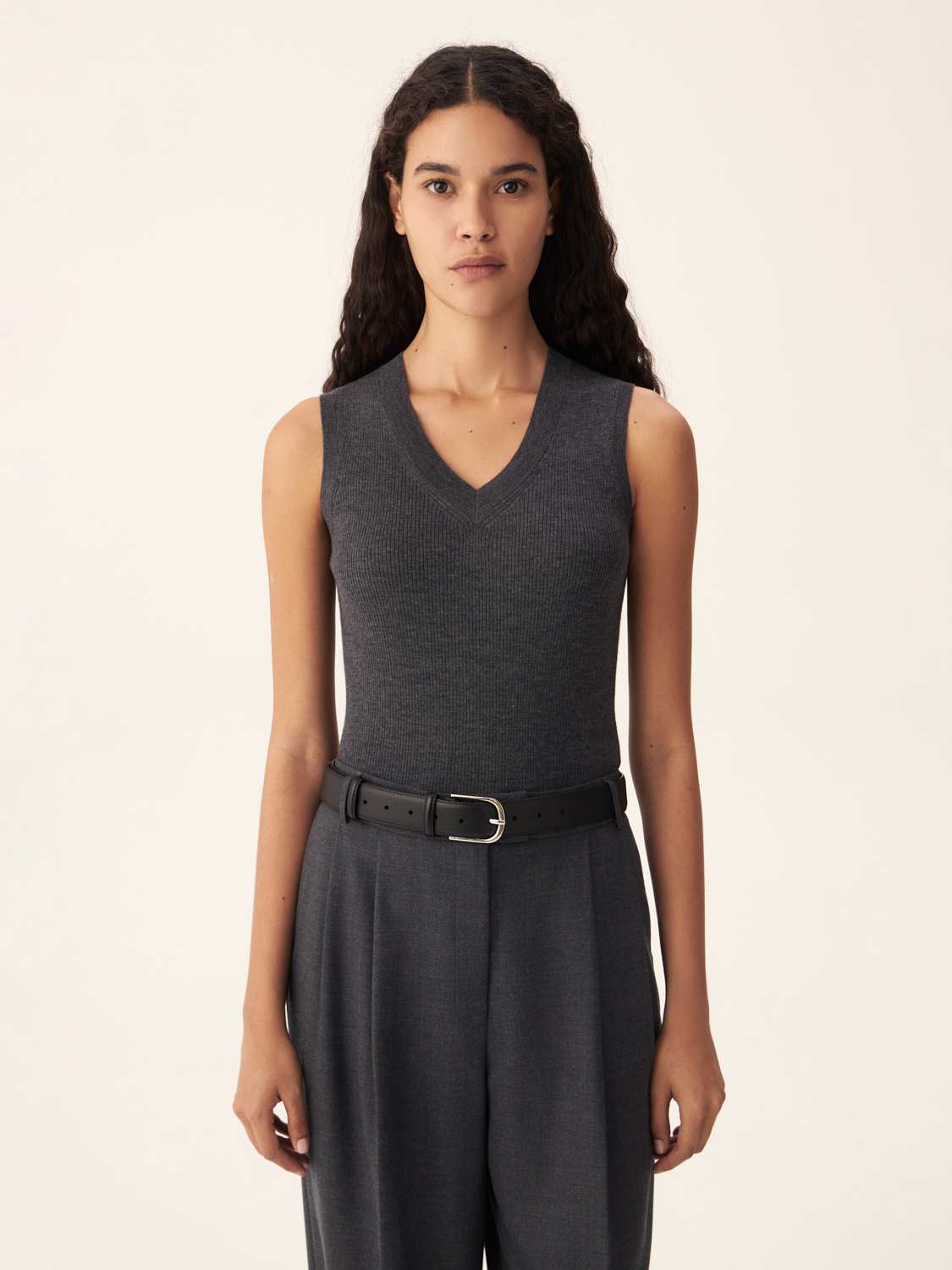 Трикотажный топ без рукавов в базовом оттенке станет идеальным элементом вашего гардероба. Благодаря лаконичному дизайну и глубокому V-образному вырезу, эта модель легко комбинируется как с деловыми, так и с повседневными образами. Плотная трикотажная текстура нежно облегает фигуру, подчеркивая силуэт, а отсутствие рукавов придает образу легкость и динамичность. Этот универсальный топ можно носить как самостоятельный элемент или сочетать с жакетами и кардиганами в прохладное время года. Параметры модели: 178/78/60/88 На модели размер: S
