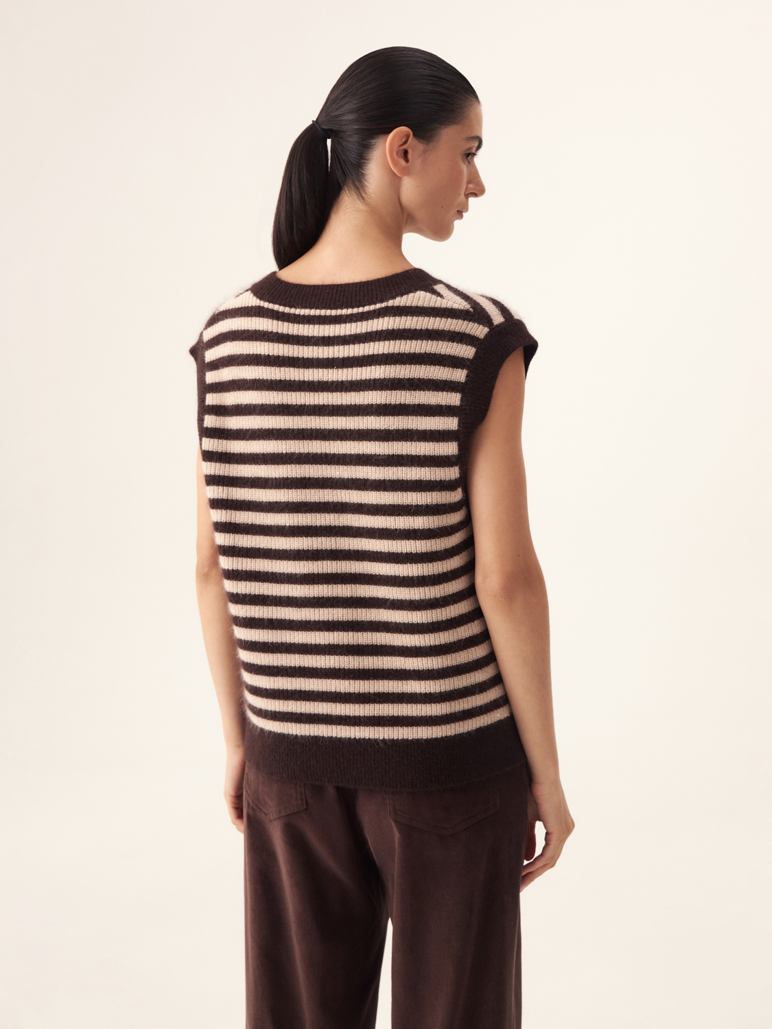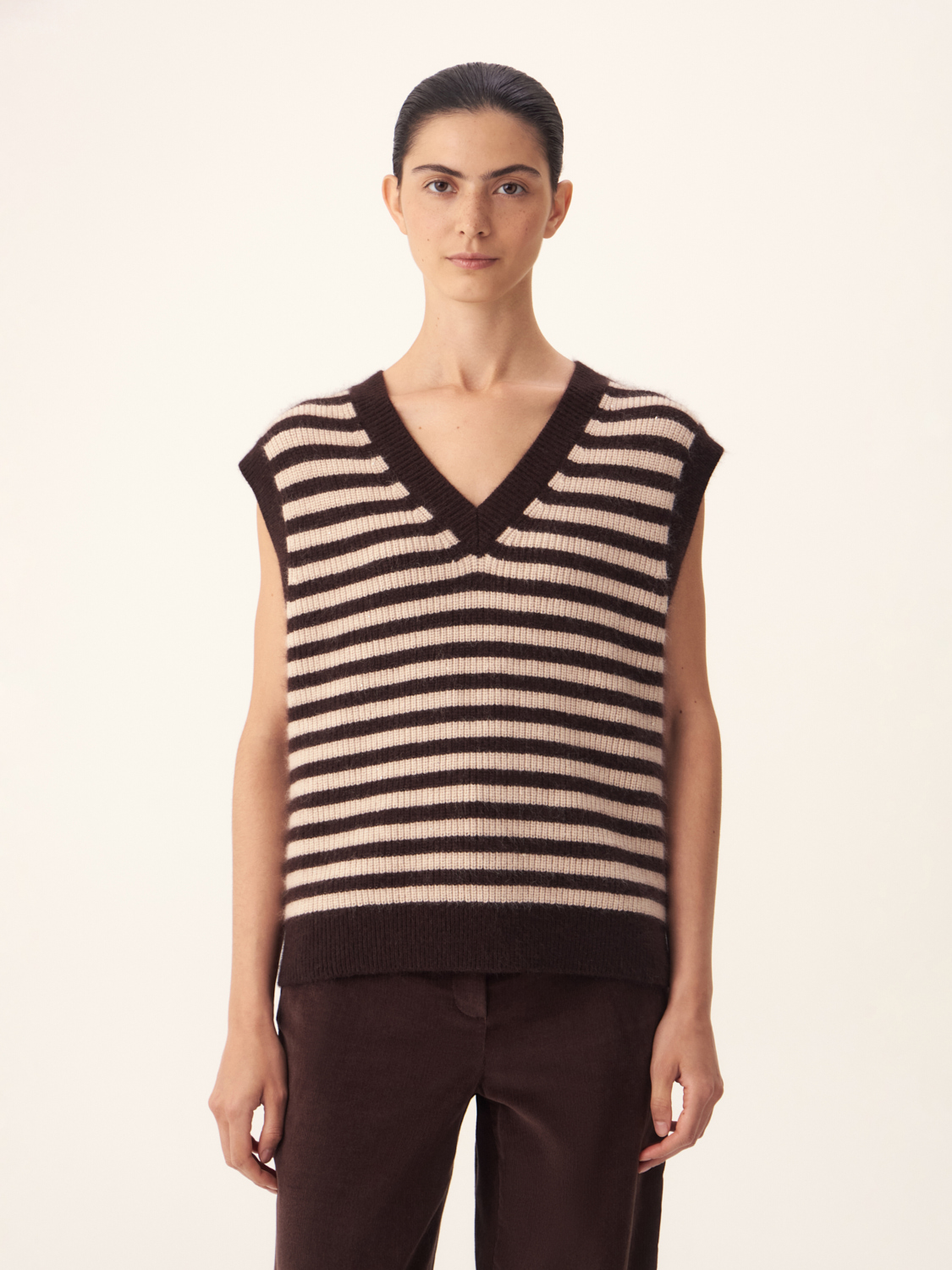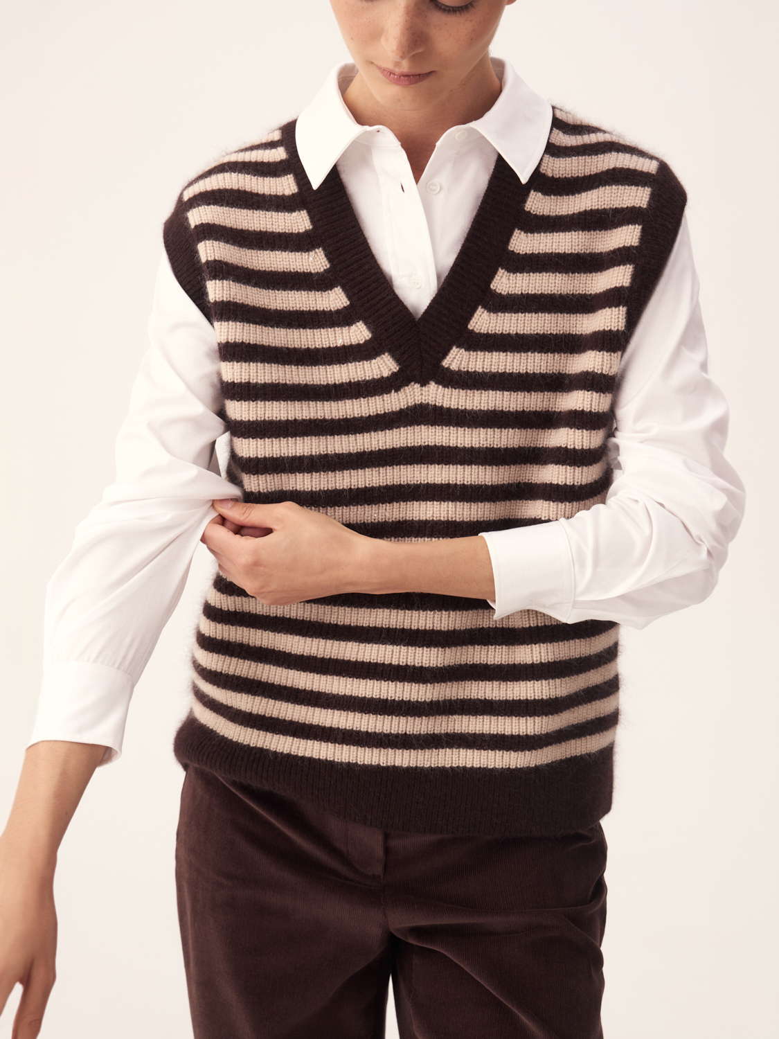 Трикотажная жилетка с V-образным вырезом — универсальная и стильная модель. Мягкая текстура и лаконичный крой позволяют носить ее как отдельный элемент гардероба, создавая женственный и элегантный образ. V-образный вырез акцентирует линию шеи, добавляя утонченности. Эта жилетка также идеально впишется в многослойные сочетания: комбинируйте ее с жакетами, кардиганами или носите поверх рубашек, чтобы создавать многогранные образы для любых случаев.