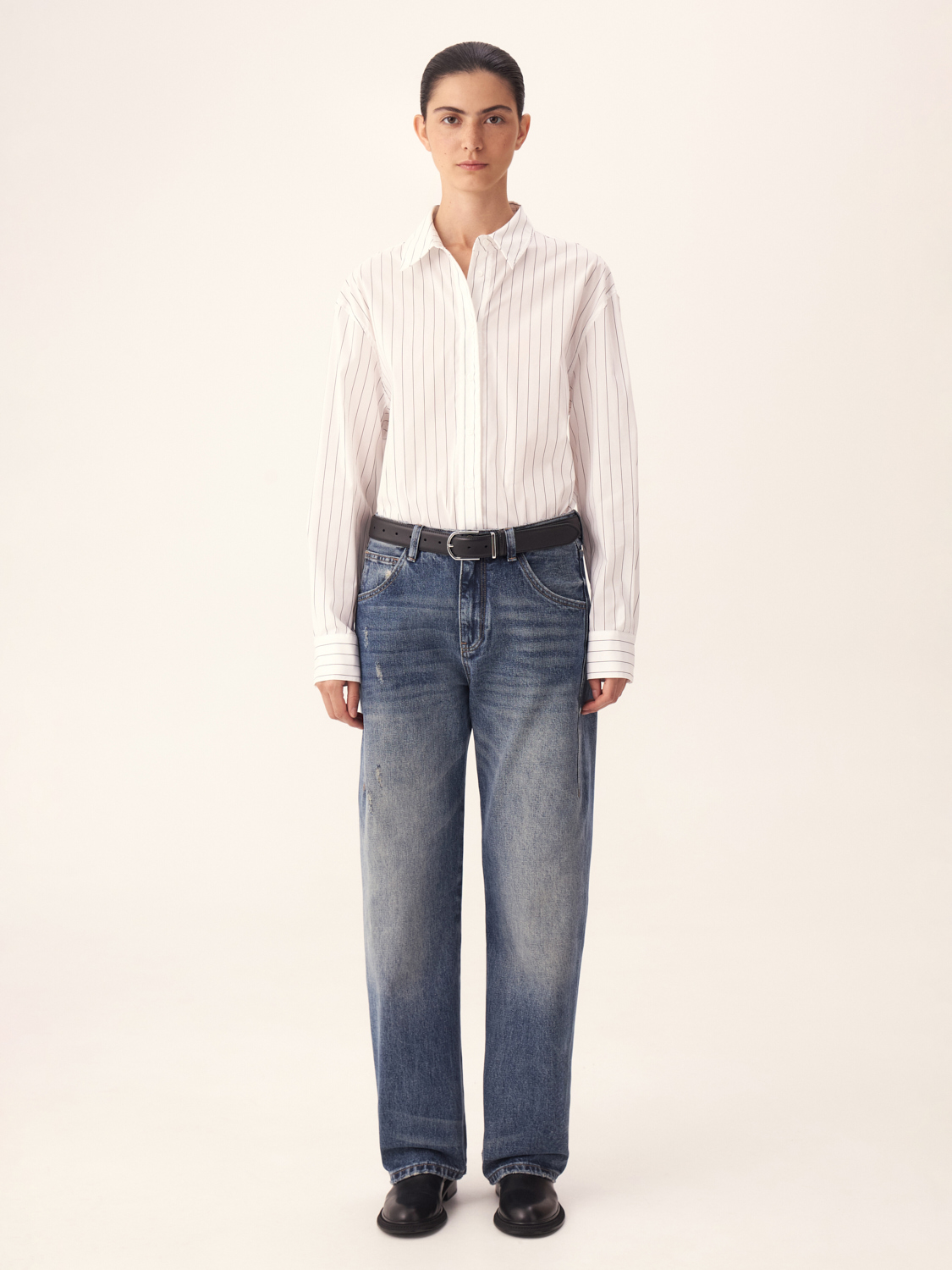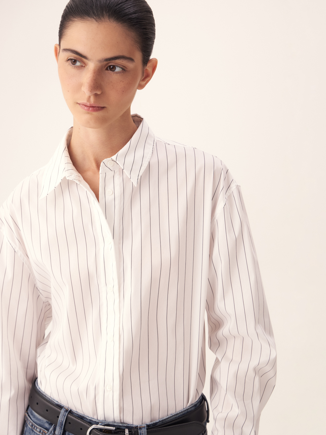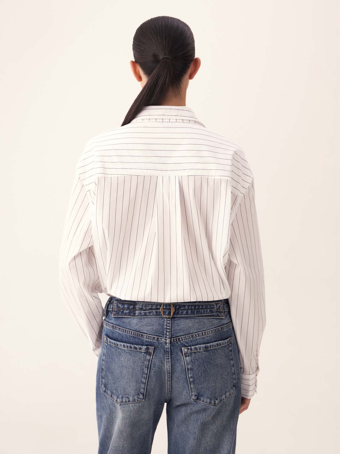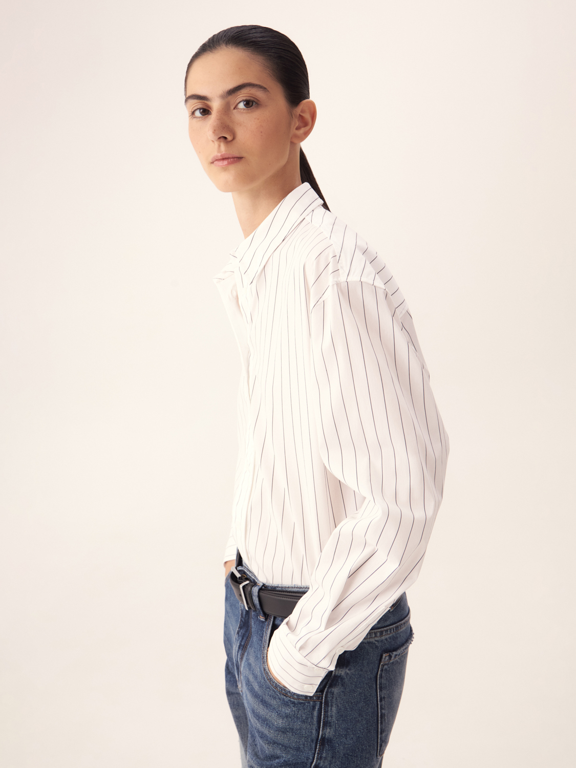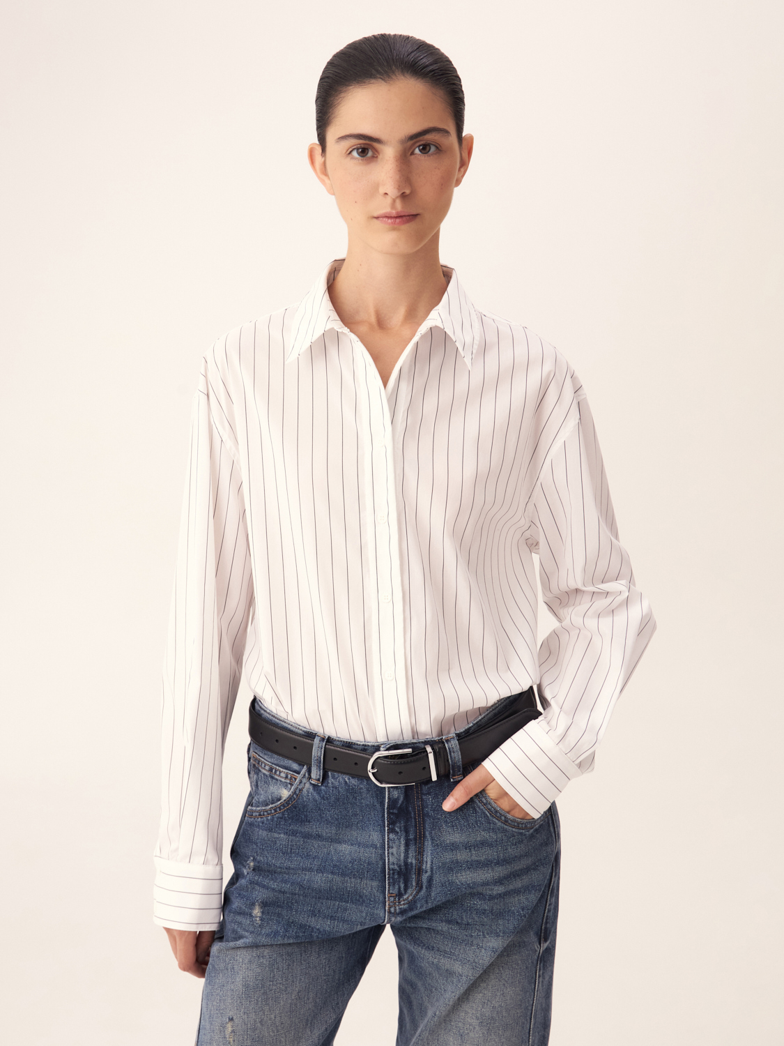 Рубашка из хлопка в тонкую полоску — отличный выбор для создания стильного и современного образа. Лаконичный дизайн с классическим воротником и манжетами делает ее универсальной для различных ситуаций — от деловых встреч до повседневных выходов. Вертикальные полосы визуально удлиняют силуэт, придавая ему стройность и элегантность. Свободный крой обеспечивает комфорт и динамичность движений. Мягкий хлопок приятен к телу и позволяет коже дышать, создавая ощущение легкости и свежести. Эта рубашка прекрасно сочетается как с классическими брюками или юбками, так и с джинсами. На модели размер S.