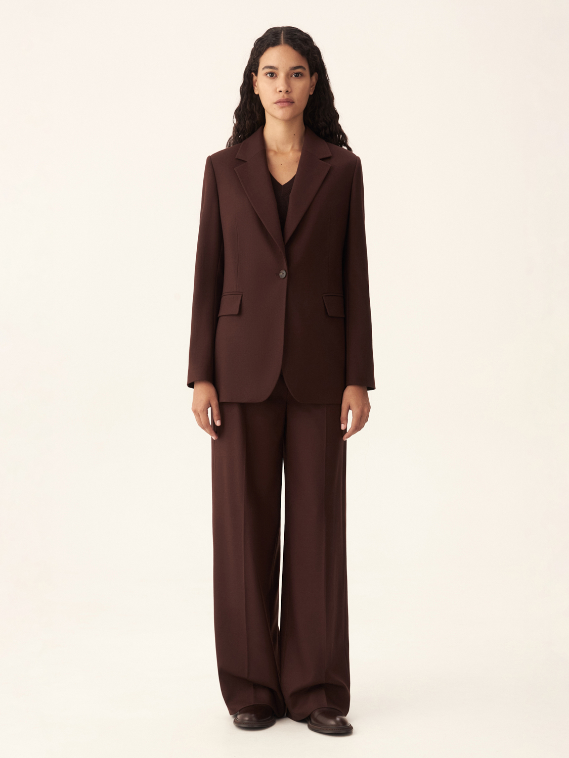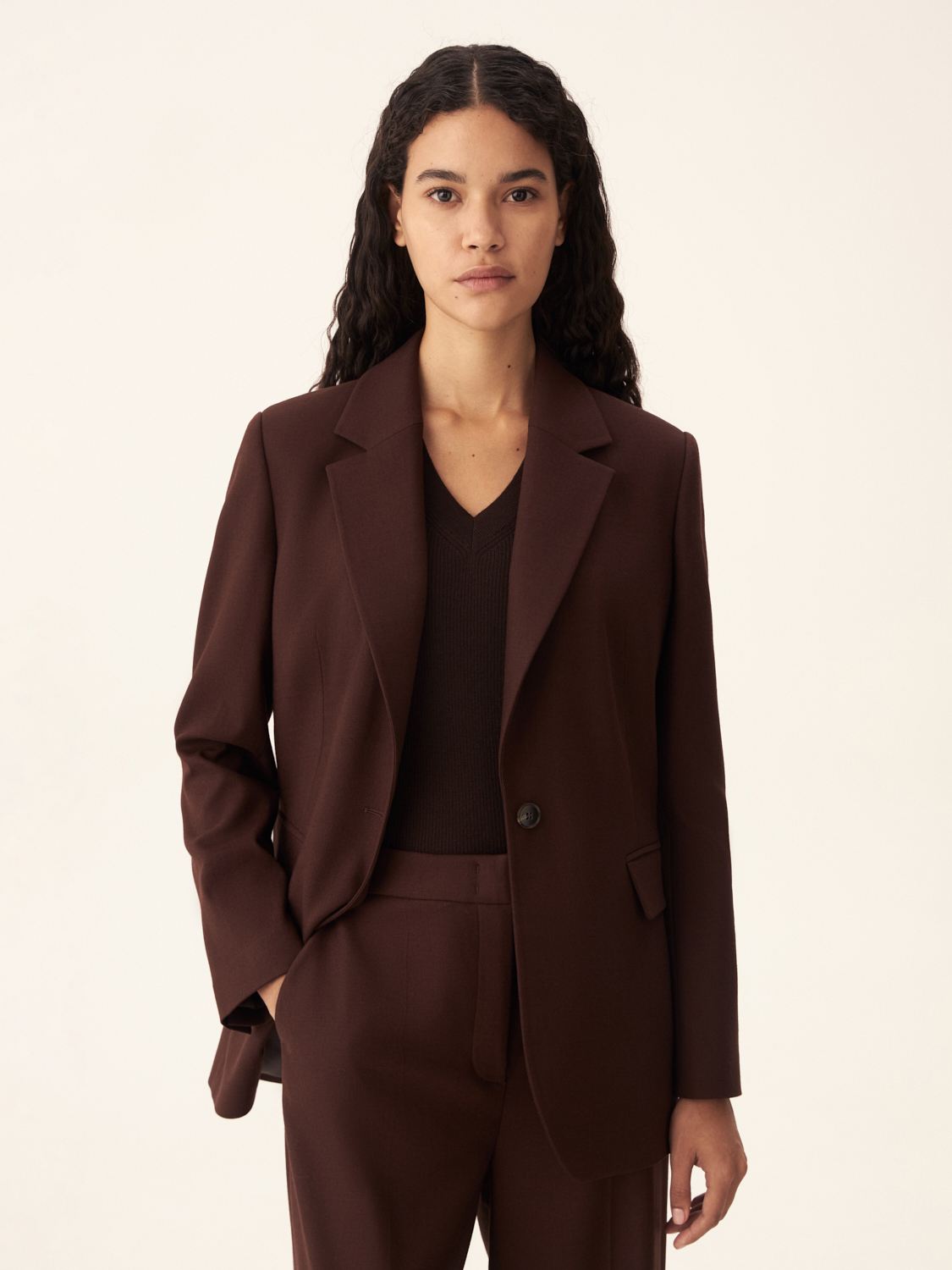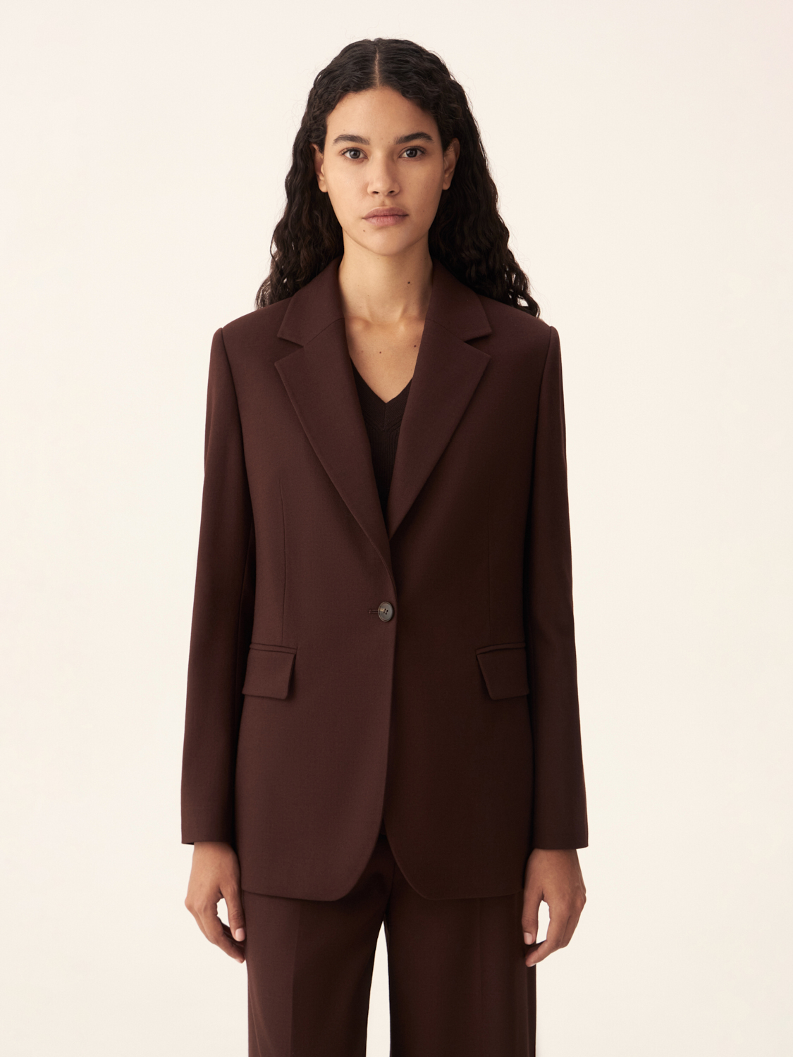 Однобортный жакет из шерсти — это сочетание лаконичности и современной элегантности. Модель выполнена из 100% натуральной шерсти, что обеспечивает тепло и комфорт, делая его идеальным выбором для прохладного времени года. Прямой крой и строгие линии создают минималистичный силуэт, который подчеркивает утонченность образа. Лацканы классической формы и застежка на одну пуговицу добавляют жакету элегантности, а декоративные карманы с клапанами завершают дизайн. Этот жакет прекрасно сочетается как с классическими брюками, так и с более повседневными вещами, позволяя легко адаптировать его к разным стилям. Параметры модели: рост 174 см, размер S.