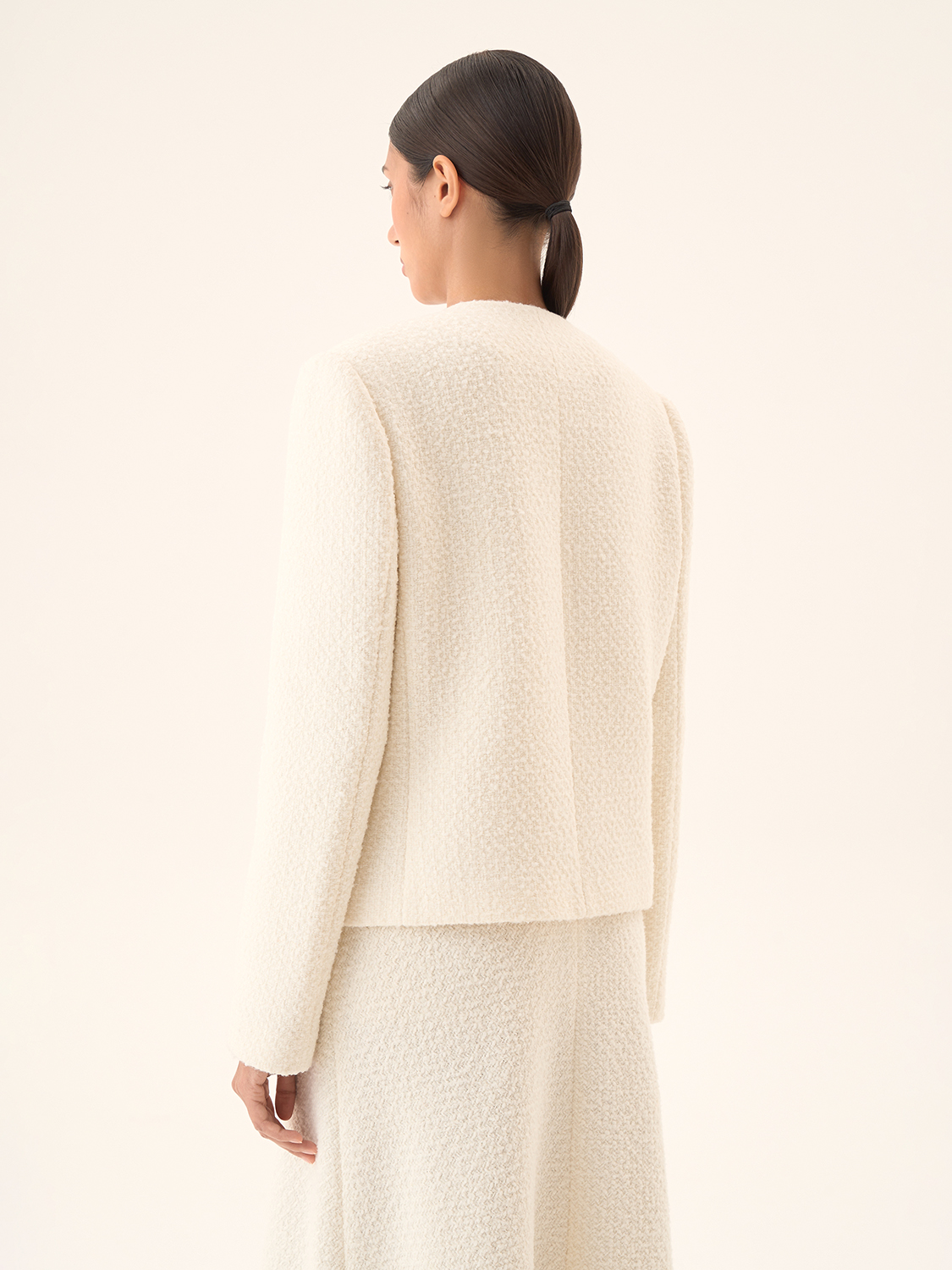Жакет букле — это воплощение элегантности и утонченности. Выполненный из текстурированной ткани букле, он идеально подходит для создания стильных образов в прохладное время года. Простой, но эффектный крой подчеркивает фигуру, а единственная акцентная пуговица добавляет изысканности. Этот жакет легко сочетается как с юбками, так и с брюками, что делает его универсальным элементом гардероба. Элегантный белый оттенок и мягкая текстура ткани подчеркивают ваш утонченный стиль и вкус. Параметры модели: рост 174 см, размер S.