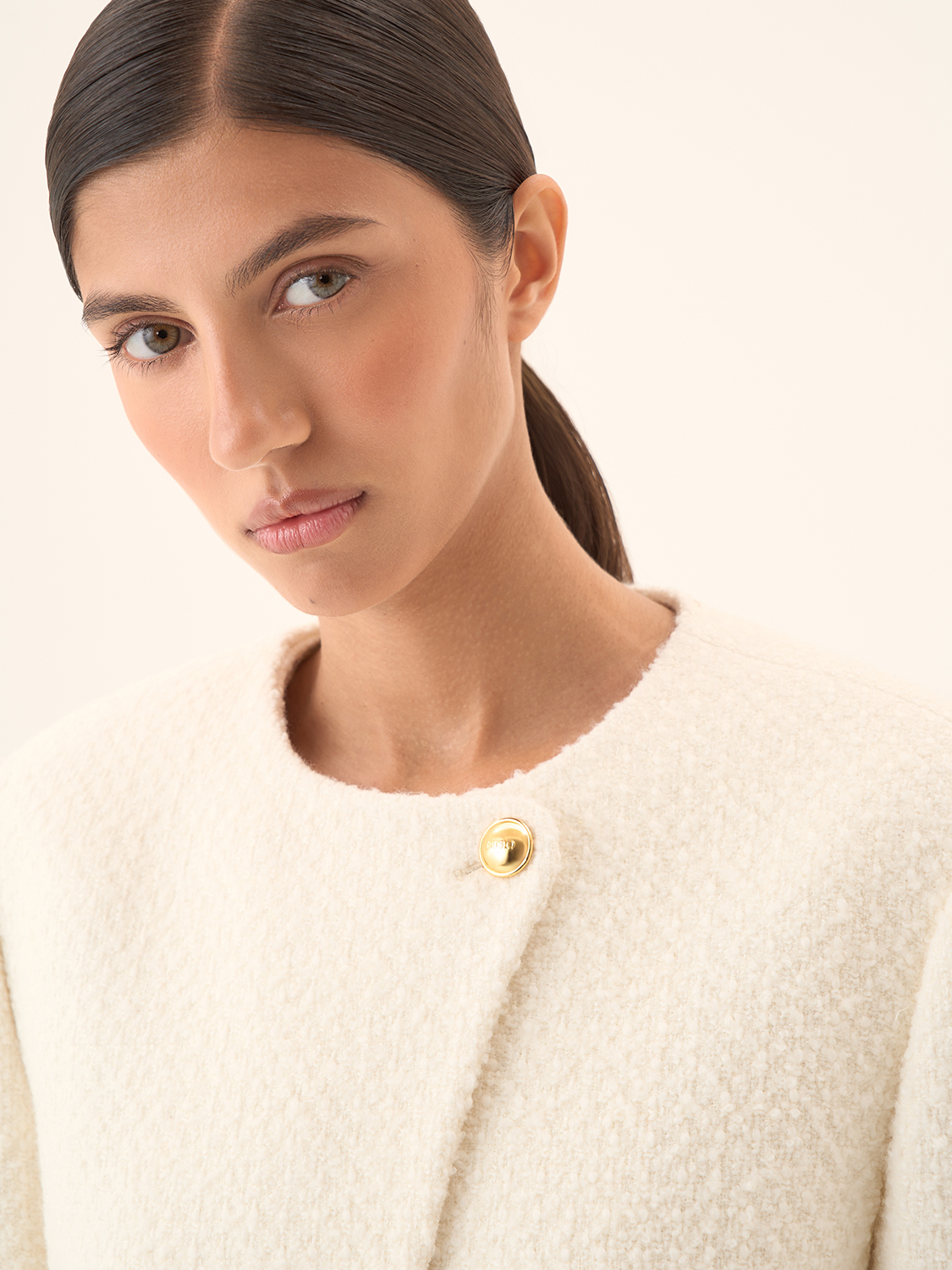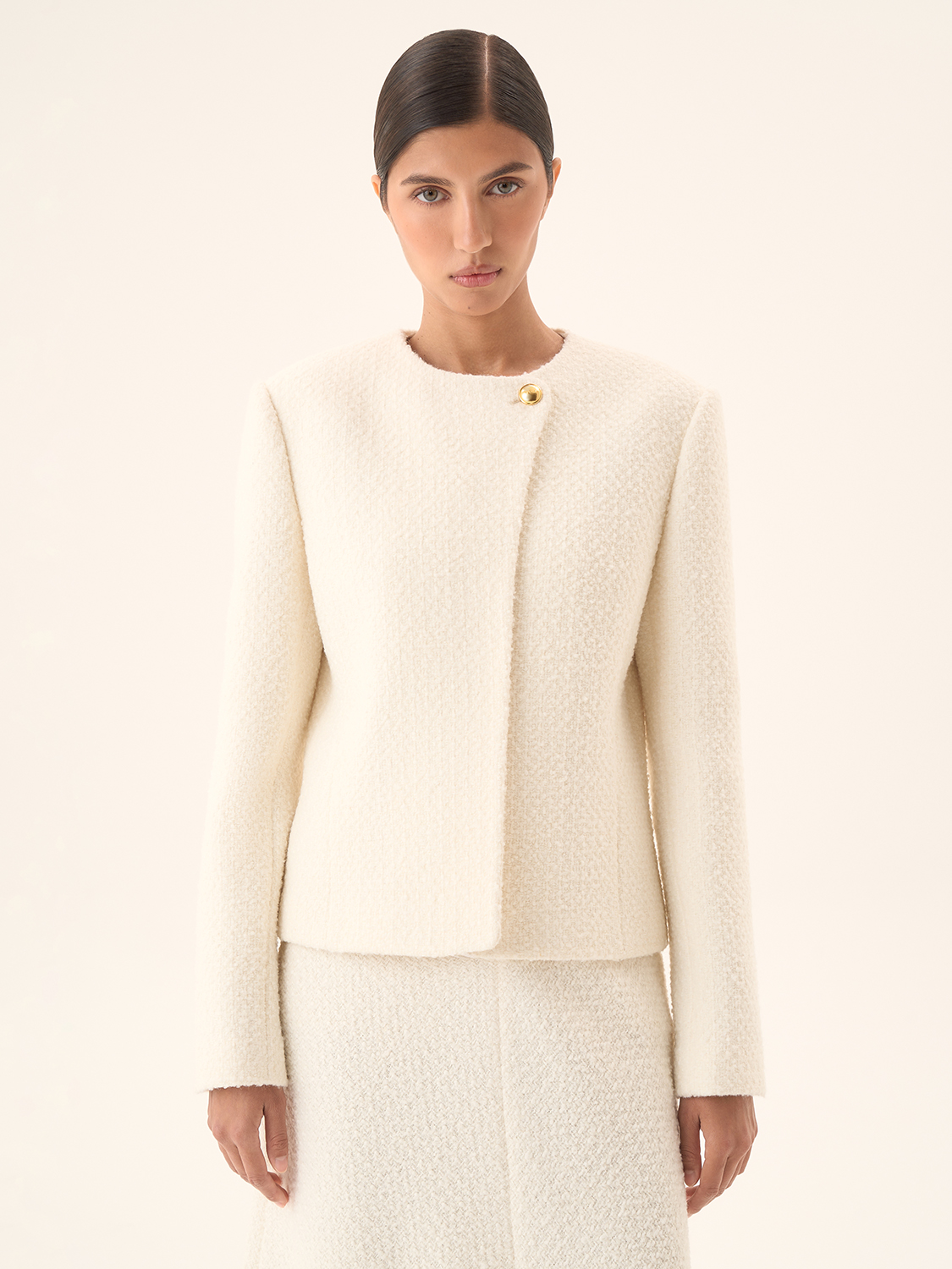 Жакет букле — это воплощение элегантности и утонченности. Выполненный из текстурированной ткани букле, он идеально подходит для создания стильных образов в прохладное время года. Простой, но эффектный крой подчеркивает фигуру, а единственная акцентная пуговица добавляет изысканности. Этот жакет легко сочетается как с юбками, так и с брюками, что делает его универсальным элементом гардероба. Элегантный белый оттенок и мягкая текстура ткани подчеркивают ваш утонченный стиль и вкус. Параметры модели: рост 174 см, размер S.