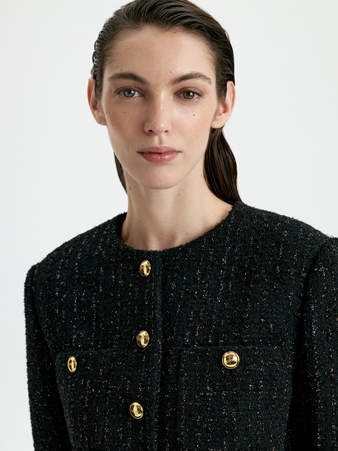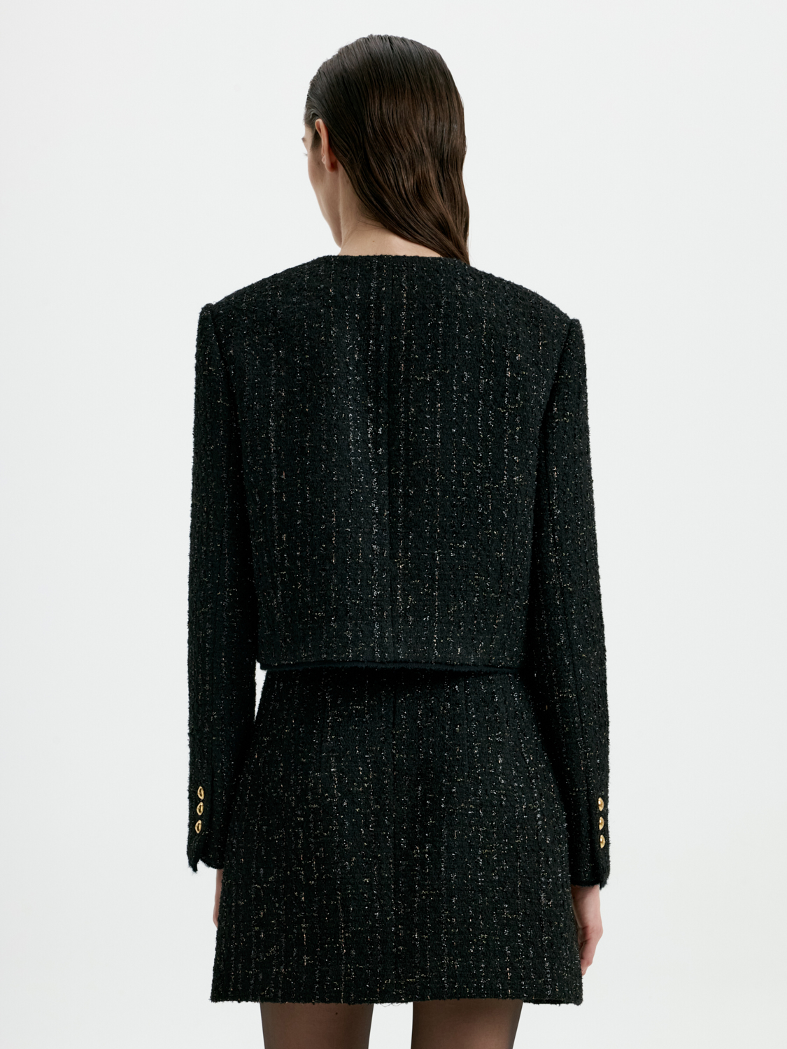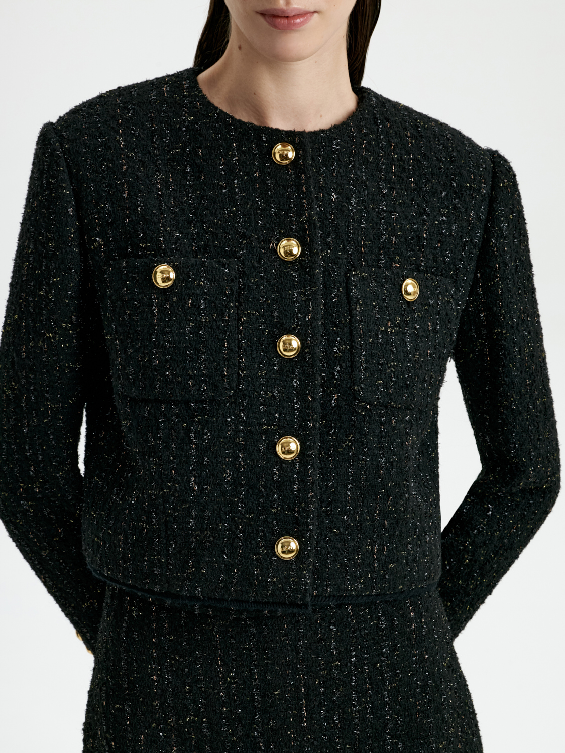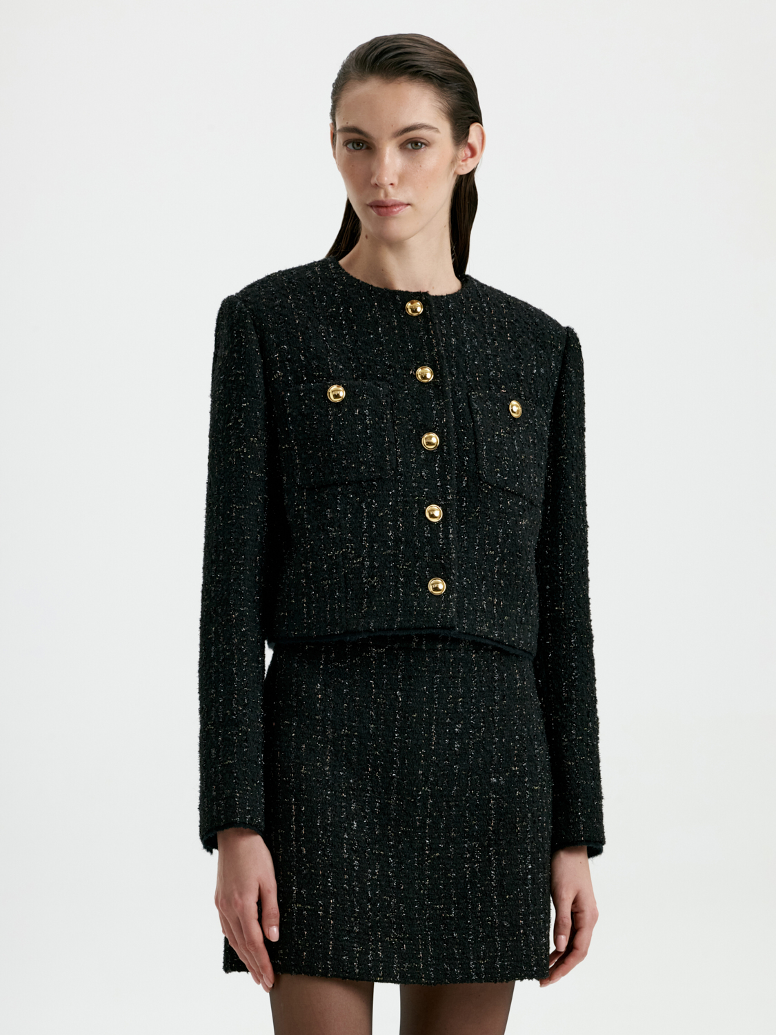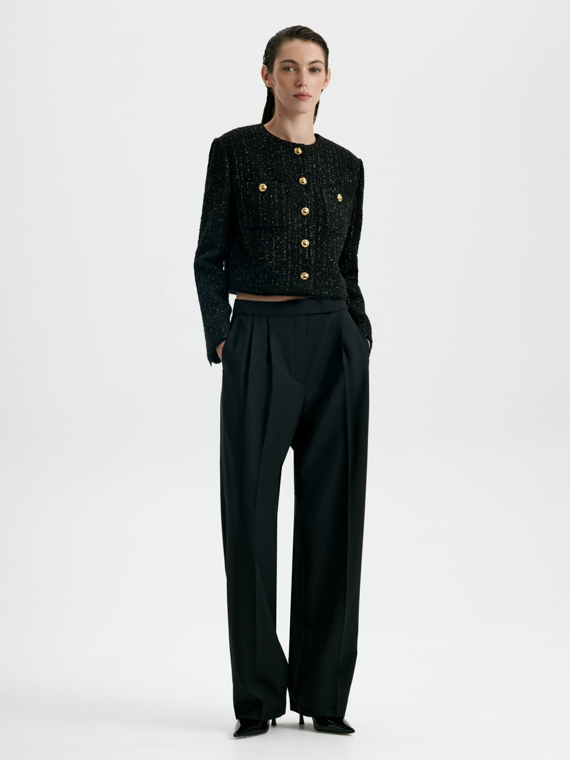 Укороченный жакет с шерстью — стильный акцент, который сочетает элегантность и современность. Благодаря шерстяной ткани он обеспечивает комфорт и тепло, а лаконичный крой подчеркивает силуэт и добавляет образу выразительности. Глубокий черный цвет делает жакет универсальным выбором для любых сочетаний — от строгих деловых комплектов до расслабленных повседневных образов. Этот жакет станет незаменимой деталью гардероба, добавляя в каждый наряд нотку утонченного стиля. На модели размер S. Параметры модели: рост 177, 80-60-90.