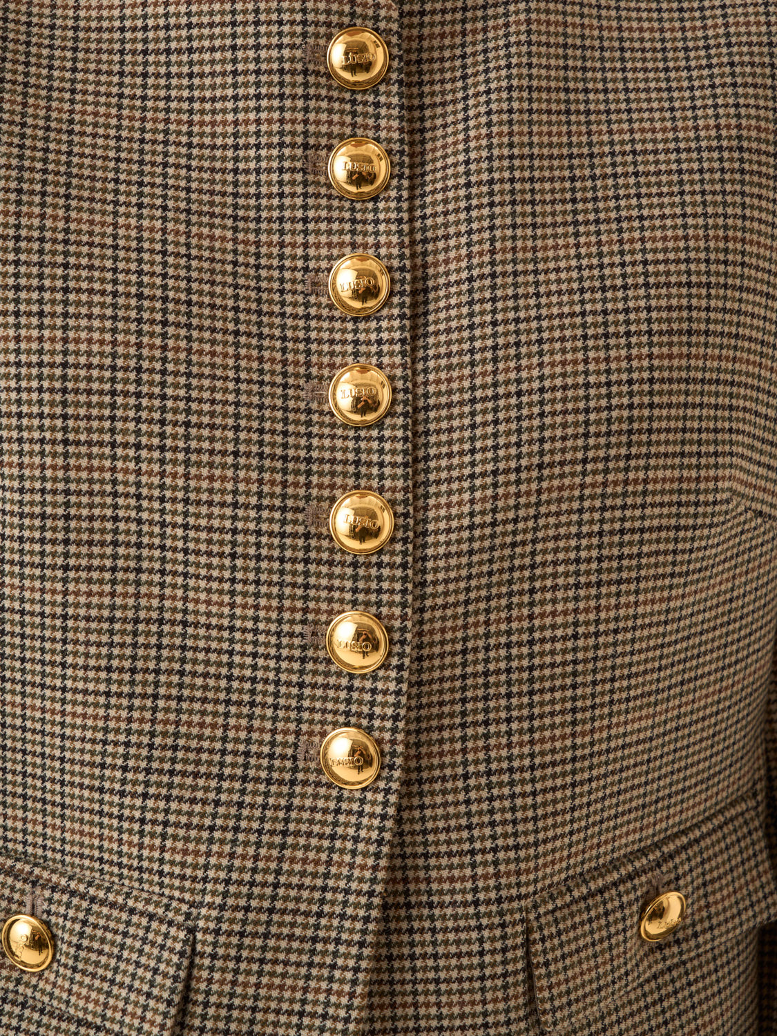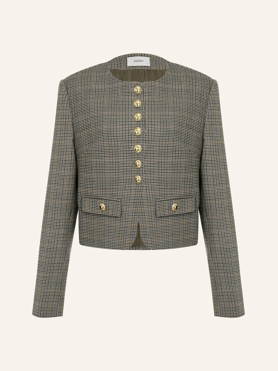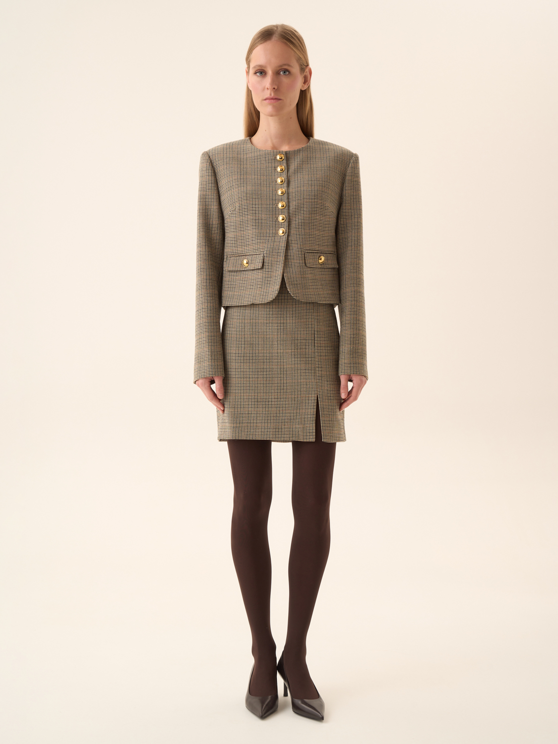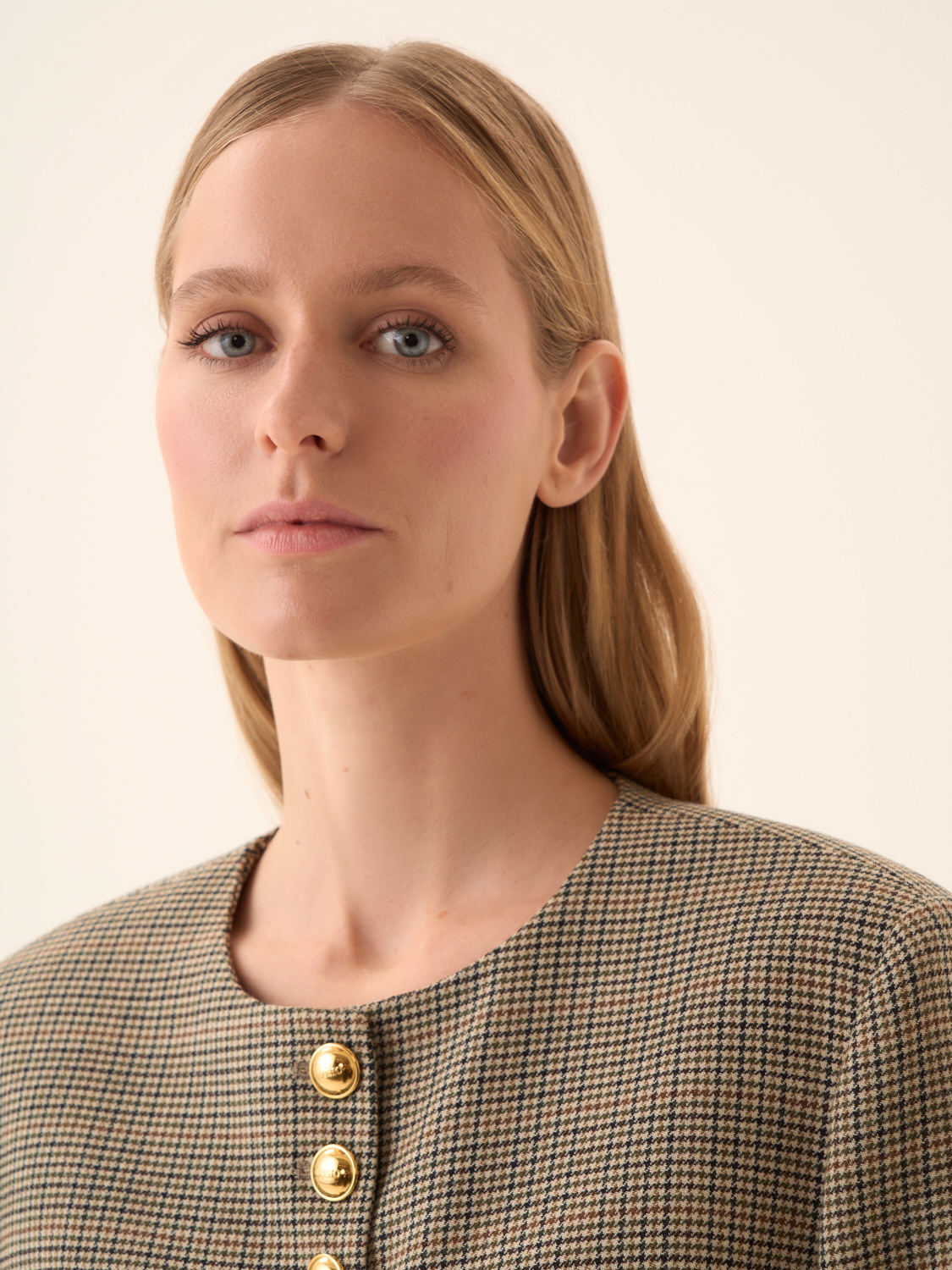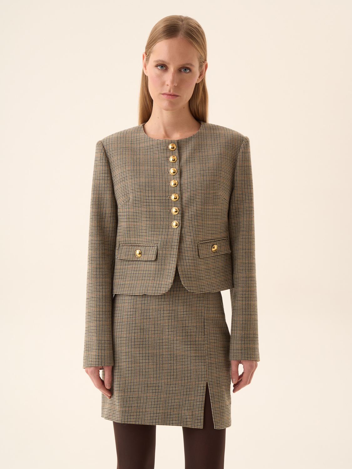 Жакет укороченного кроя выполнен из плотного текстиля на основе шерсти. Прямой силуэт подчеркнут круглым вырезом без лацканов, что делает модель современной и минималистичной. Застежка акцентирована рядом рельефных металлических пуговиц с тиснением, которые придают вещи выразительность. Карманы с клапанами и декоративной фурнитурой поддерживают графичность линии. Компактная длина выгодно подчеркивает талию и гармонично смотрится как в комплекте с юбкой, так и в независимых сочетаниях.