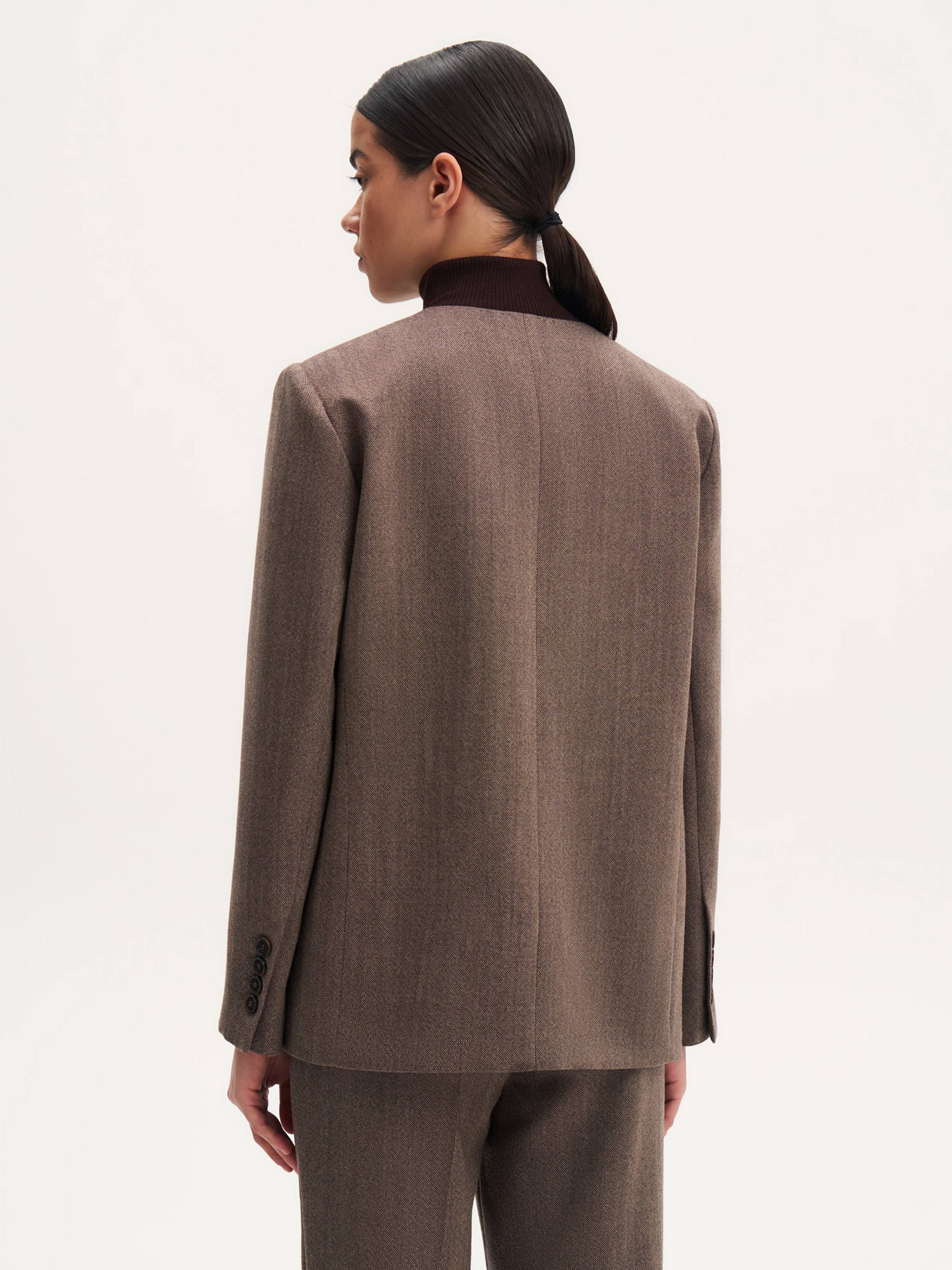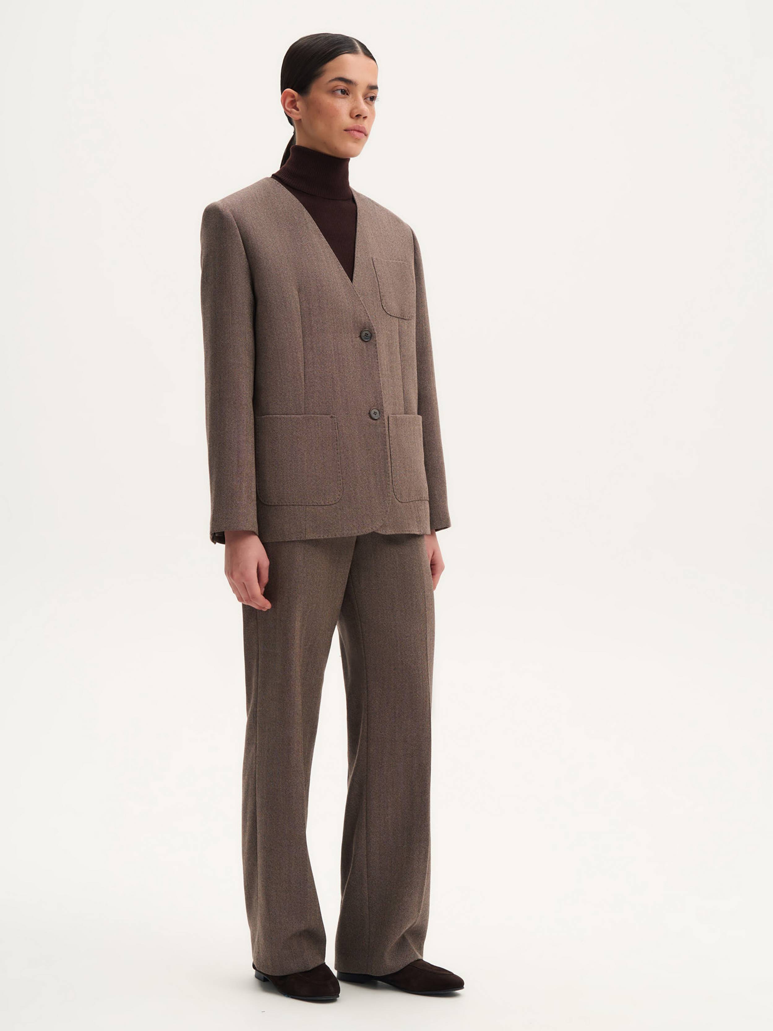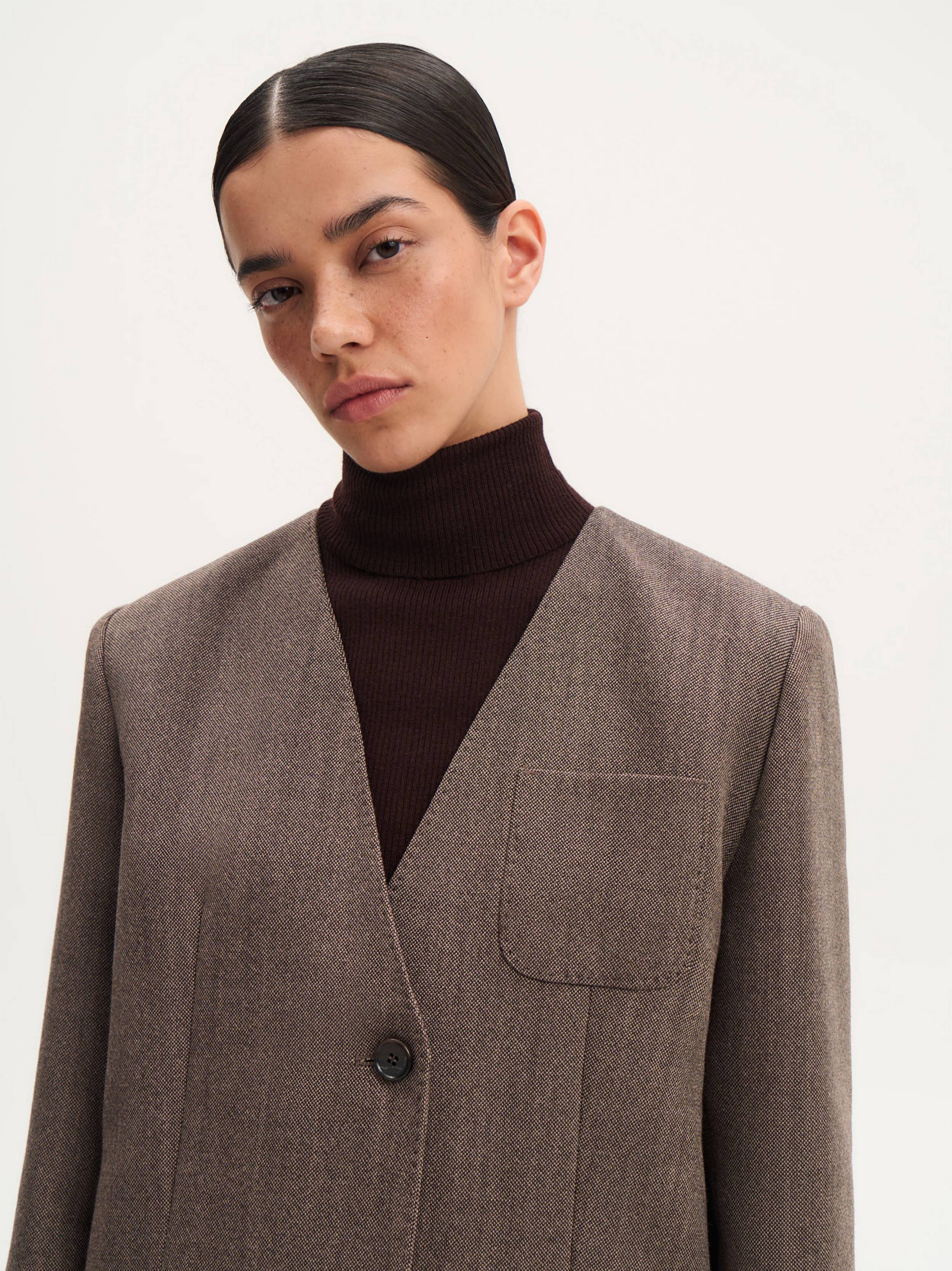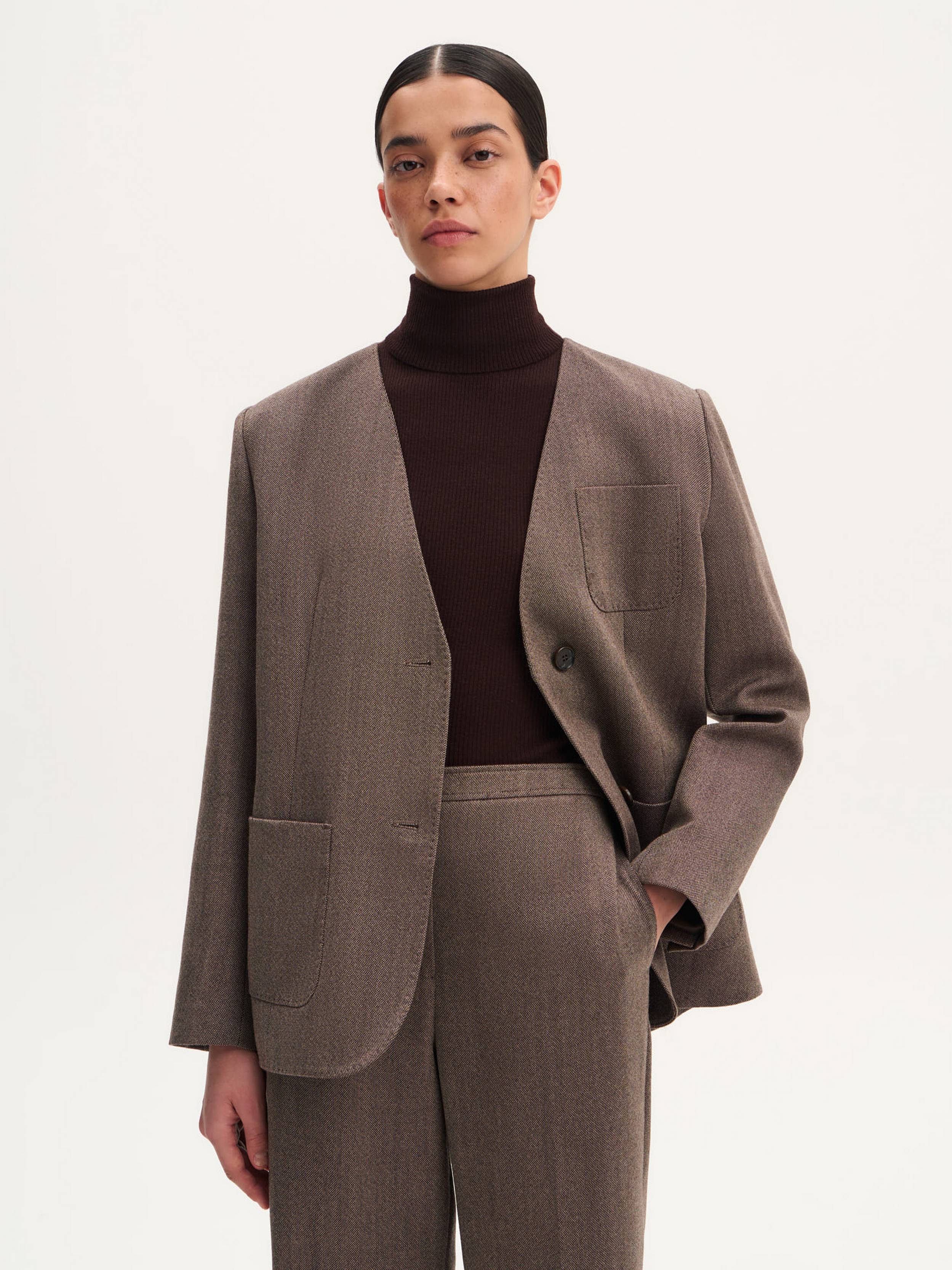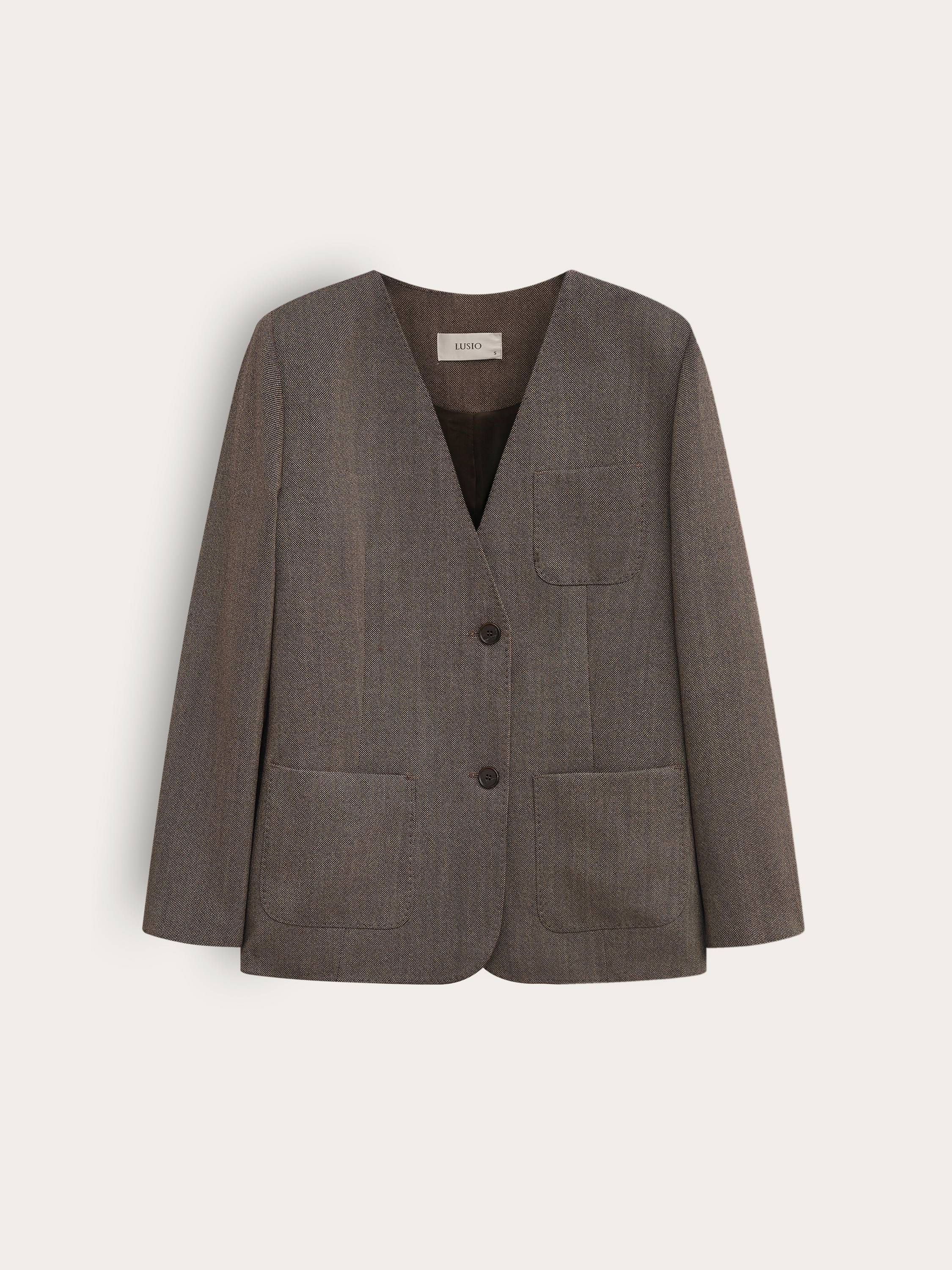 Жакет однобортный с шерстью — элегантная модель с утонченными деталями. Натуральная шерсть делает ткань мягкой, теплой и комфортной для носки. Особенность дизайна — V-образный вырез без привычного воротника, что придает жакету современный и стильный вид. Прямой крой и сдержанная форма акцентных накладных карманов придают жакету лаконичность. Дополнительный карман на груди не только подчеркивает структуру изделия, но и добавляет ему функциональности. Этот жакет легко впишется в любой гардероб и подойдет как для повседневных, так и более формальных образов.