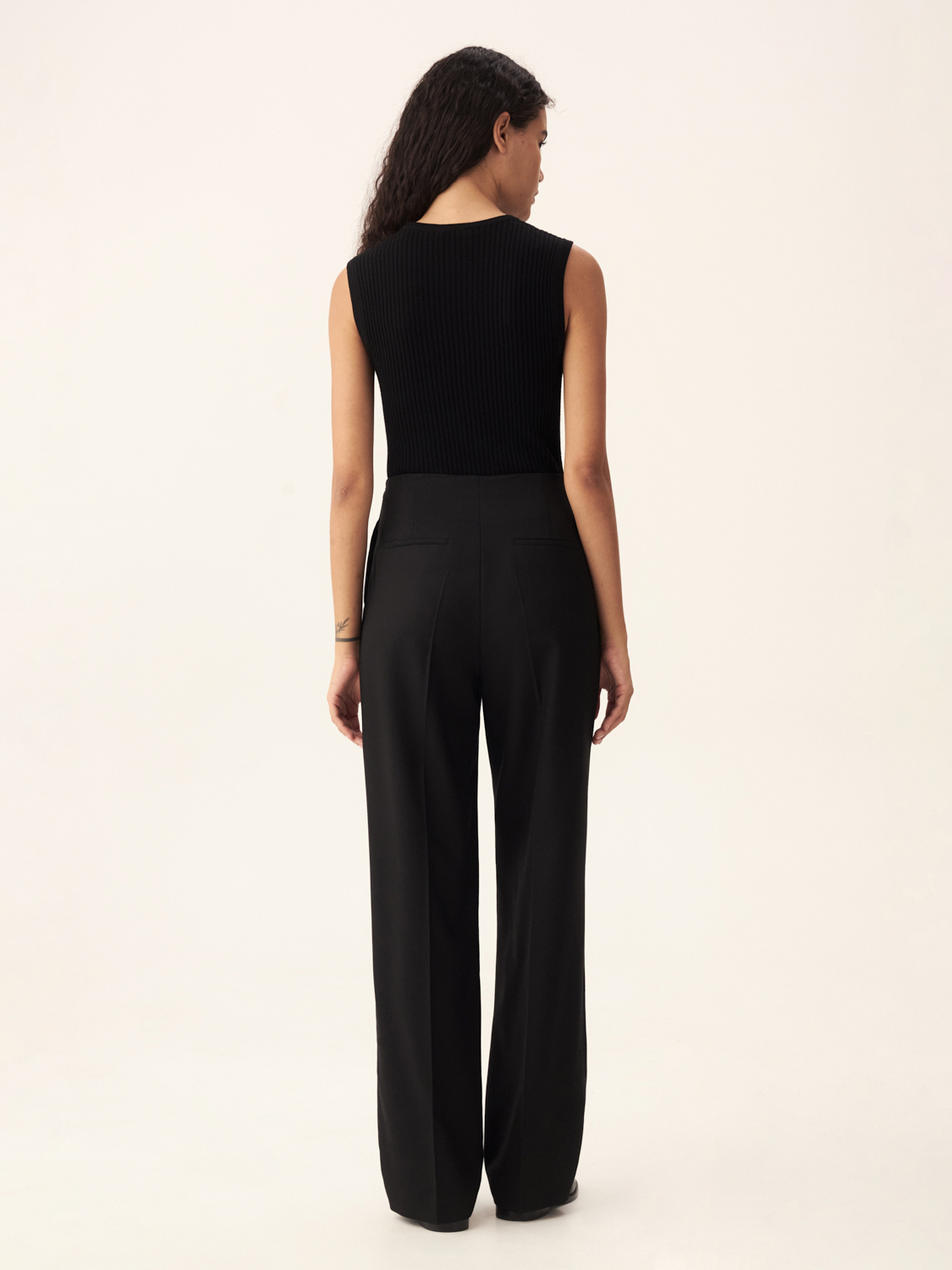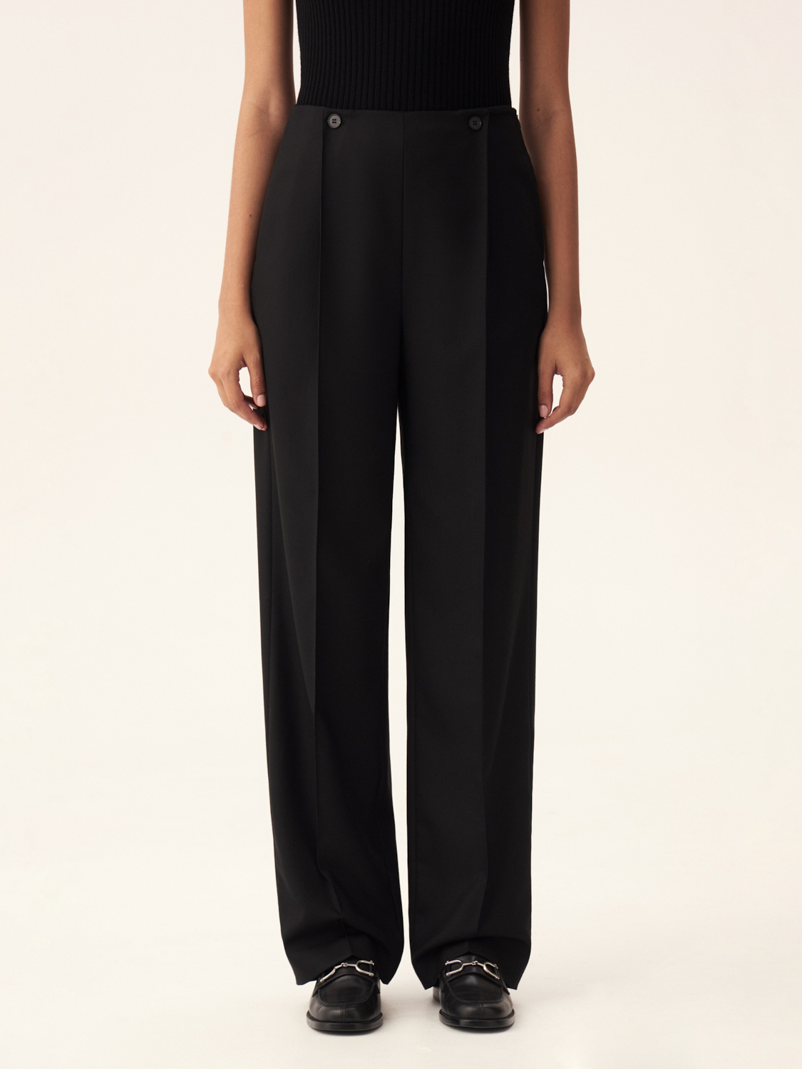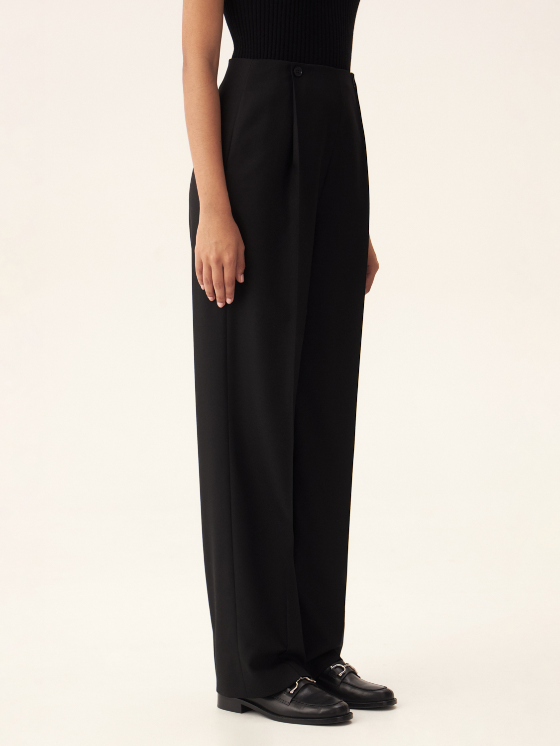 Шерстяные брюки из австралийской шерсти объединяют в себе стиль и комфорт. Классический прямой крой визуально удлиняет ноги, а высокая посадка идеально подходит для создания как деловых, так повседневных образов. Двухпуговичная деталь на поясе акцентирует внимание на талии, добавляя изысканности. Аккуратные складки обеспечивают легкость движений и подчеркивают современный силуэт. Ткань не только приятна на ощупь, но и сохраняет тепло, форму и безупречный вид даже при длительном ношении. Эти брюки легко комбинируются с жакетами и другими элементами гардероба, создавая стильные и гармоничные образы. На модели размер S.