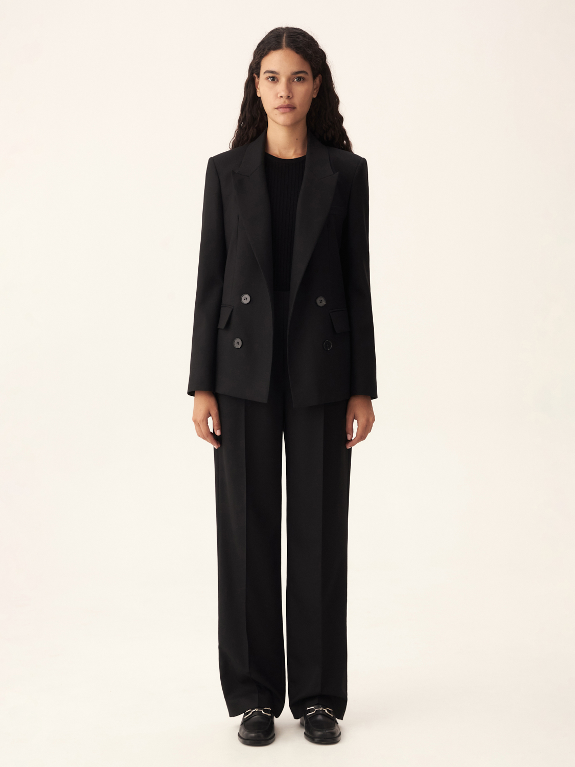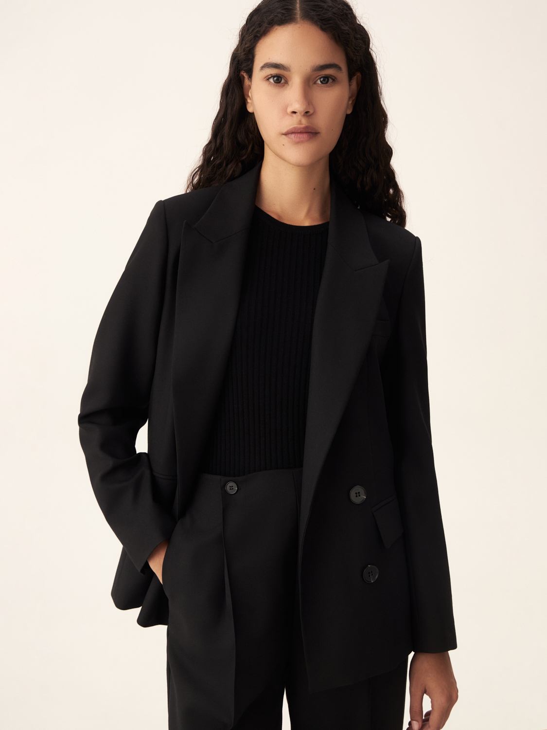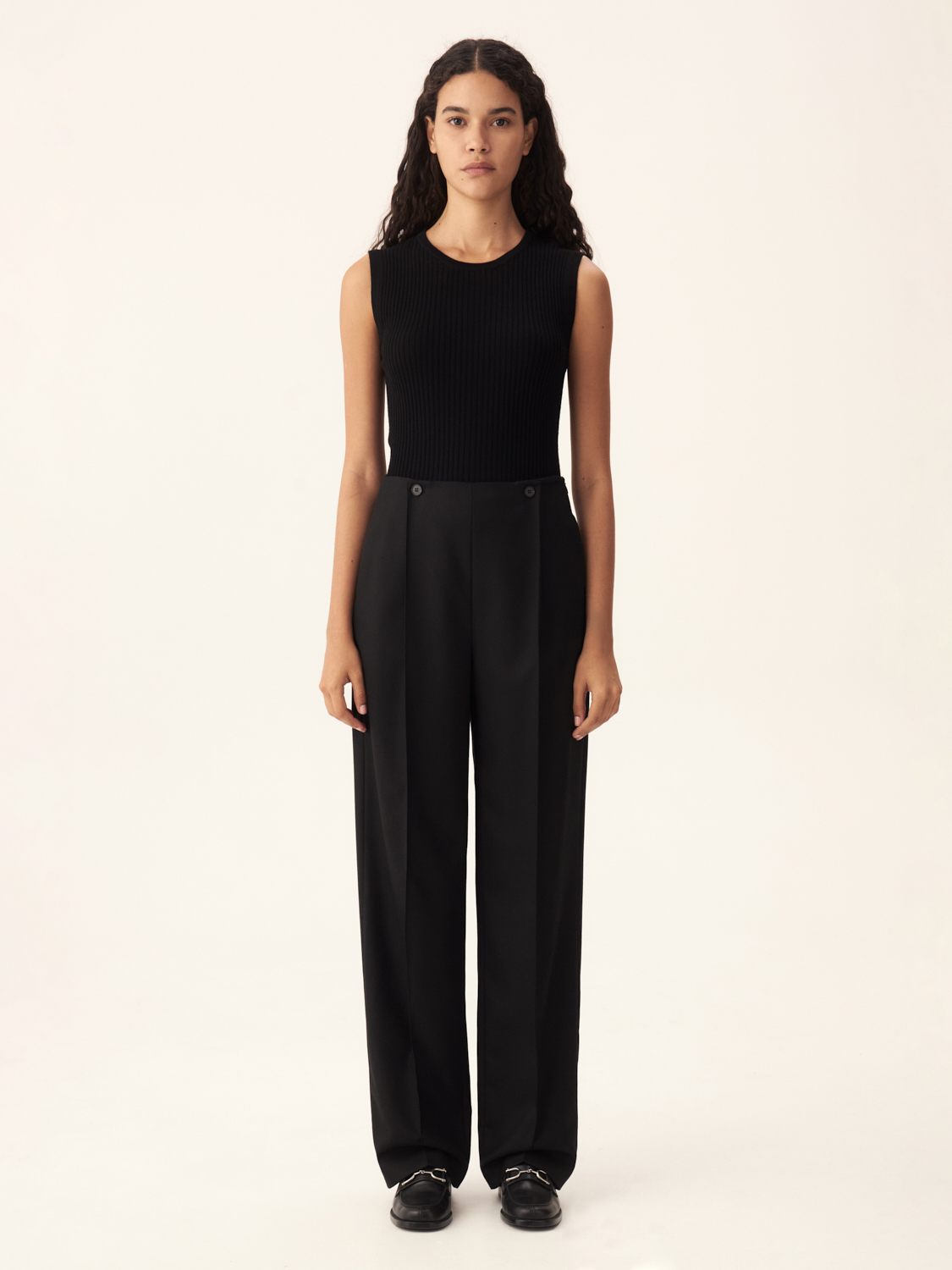 Шерстяные брюки из австралийской шерсти объединяют в себе стиль и комфорт. Классический прямой крой визуально удлиняет ноги, а высокая посадка идеально подходит для создания как деловых, так повседневных образов. Двухпуговичная деталь на поясе акцентирует внимание на талии, добавляя изысканности. Аккуратные складки обеспечивают легкость движений и подчеркивают современный силуэт. Ткань не только приятна на ощупь, но и сохраняет тепло, форму и безупречный вид даже при длительном ношении. Эти брюки легко комбинируются с жакетами и другими элементами гардероба, создавая стильные и гармоничные образы. На модели размер S.