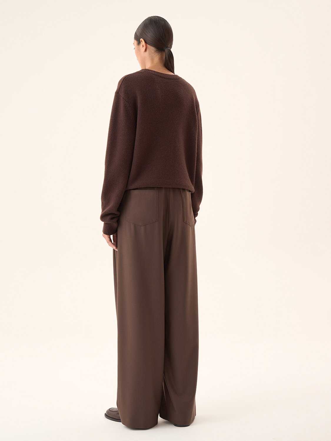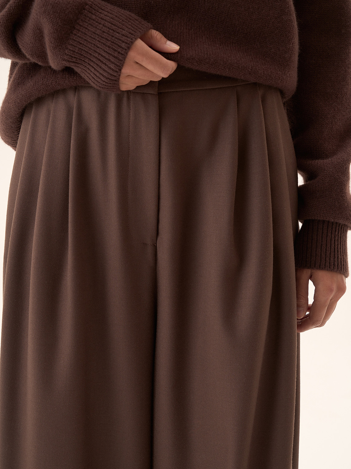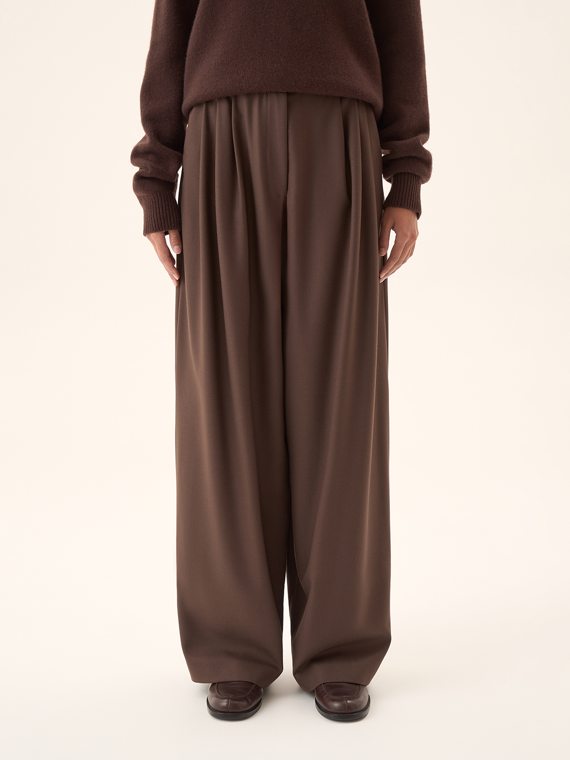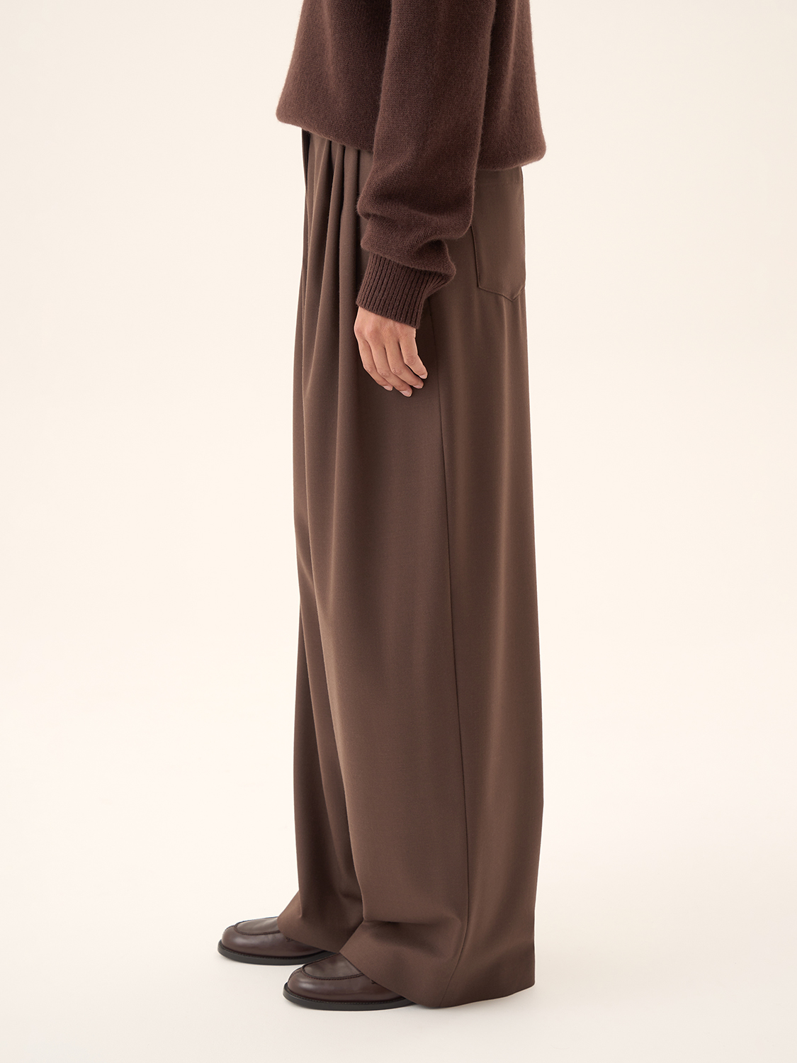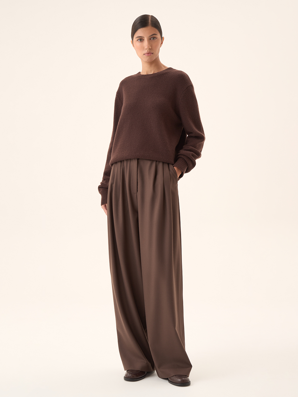 Широкие костюмные брюки — это идеальное сочетание комфорта и элегантности. Благодаря свободному крою они создают непринужденный, но в то же время утонченный образ. Высокая посадка подчеркивает талию, визуально удлиняя ноги, а глубокие складки спереди добавляют динамичности. Эти брюки отлично сочетаются как с деловыми рубашками и блузами, так и с более повседневными трикотажными изделиями. Такой фасон универсален и легко адаптируется под различные случаи, делая образ стильным и современным. Параметры модели: рост 174 см, размер S.