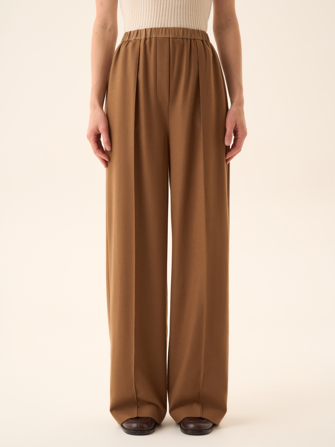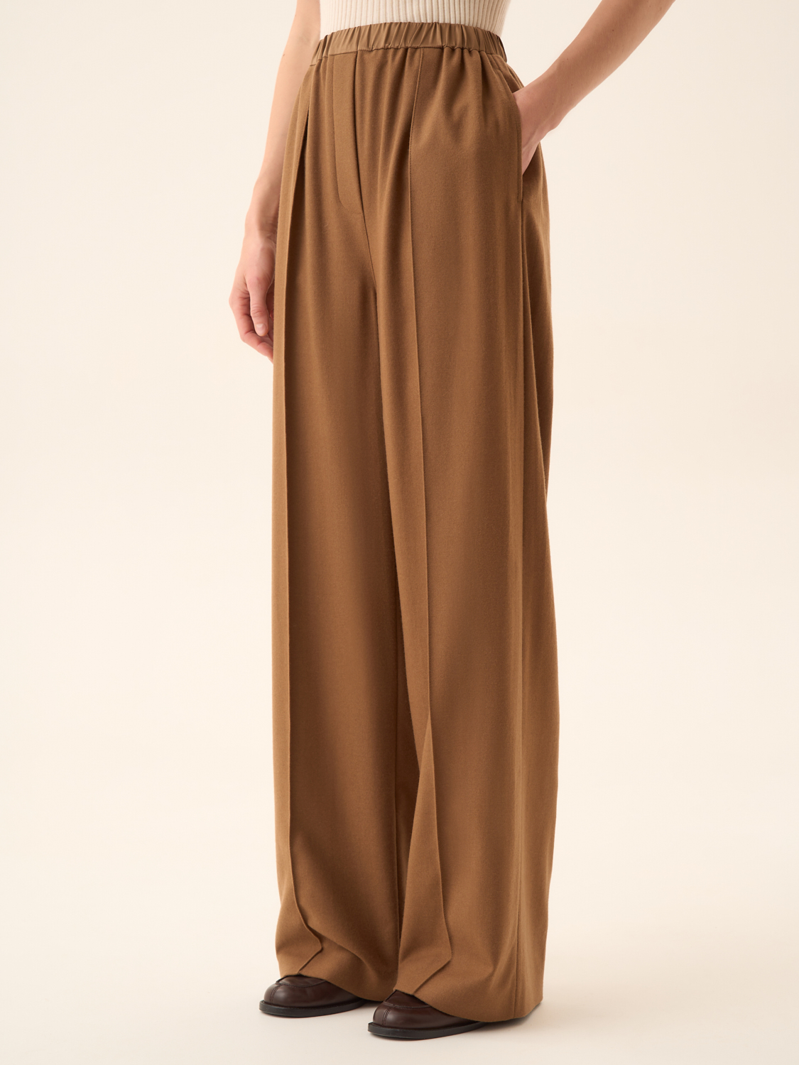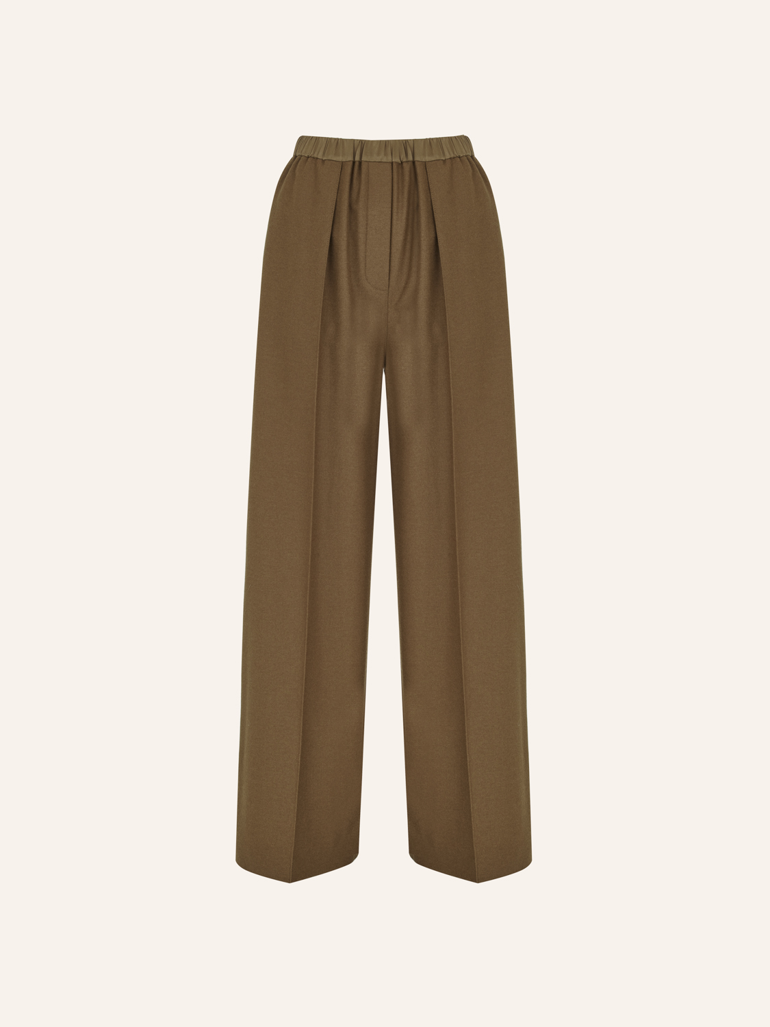 Брюки из шерсти с резинкой на поясе — идеальный выбор для тех, кто ценит комфорт, практичность и стиль. Легкая шерстяная ткань сохраняет тепло, обеспечивая уют в холодное время года, а резинка на поясе добавляет удобства и подчеркивает фигуру. Эти брюки легко сочетать с различными верхами, от уютных свитеров до рубашек свободного кроя, создавая элегантные и комфортные образы для повседневной носки или более формальных выходов.