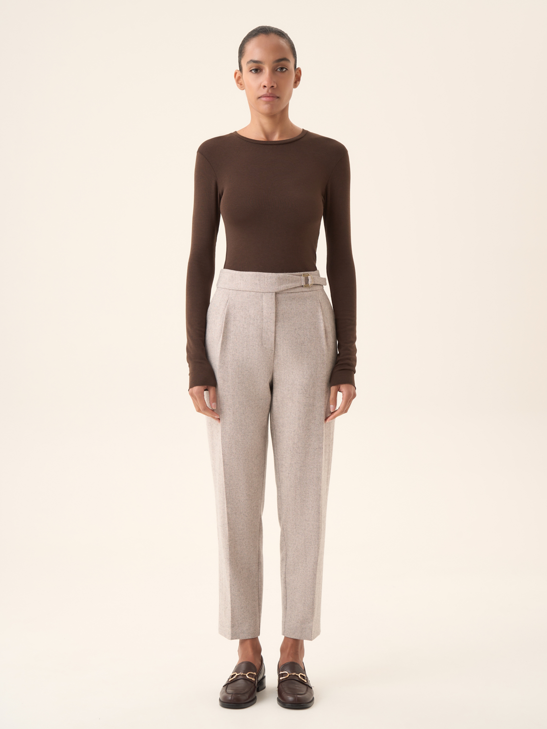 Эти костюмные брюки — идеальный выбор для создания элегантного и стильного образа. Изготовленные из высококачественного материала, они обеспечивают комфорт и легкость в носке. Прямой крой и элегантные стрелки подчеркивают фигуру, придавая образу утонченность. Особая деталь — пояс с пряжкой, который акцентирует внимание на талии и добавляет интересный штрих к классическому дизайну. Эти брюки легко сочетать с различными топами и обувью, что делает их универсальными для офисных луков и вечерних выходов.
