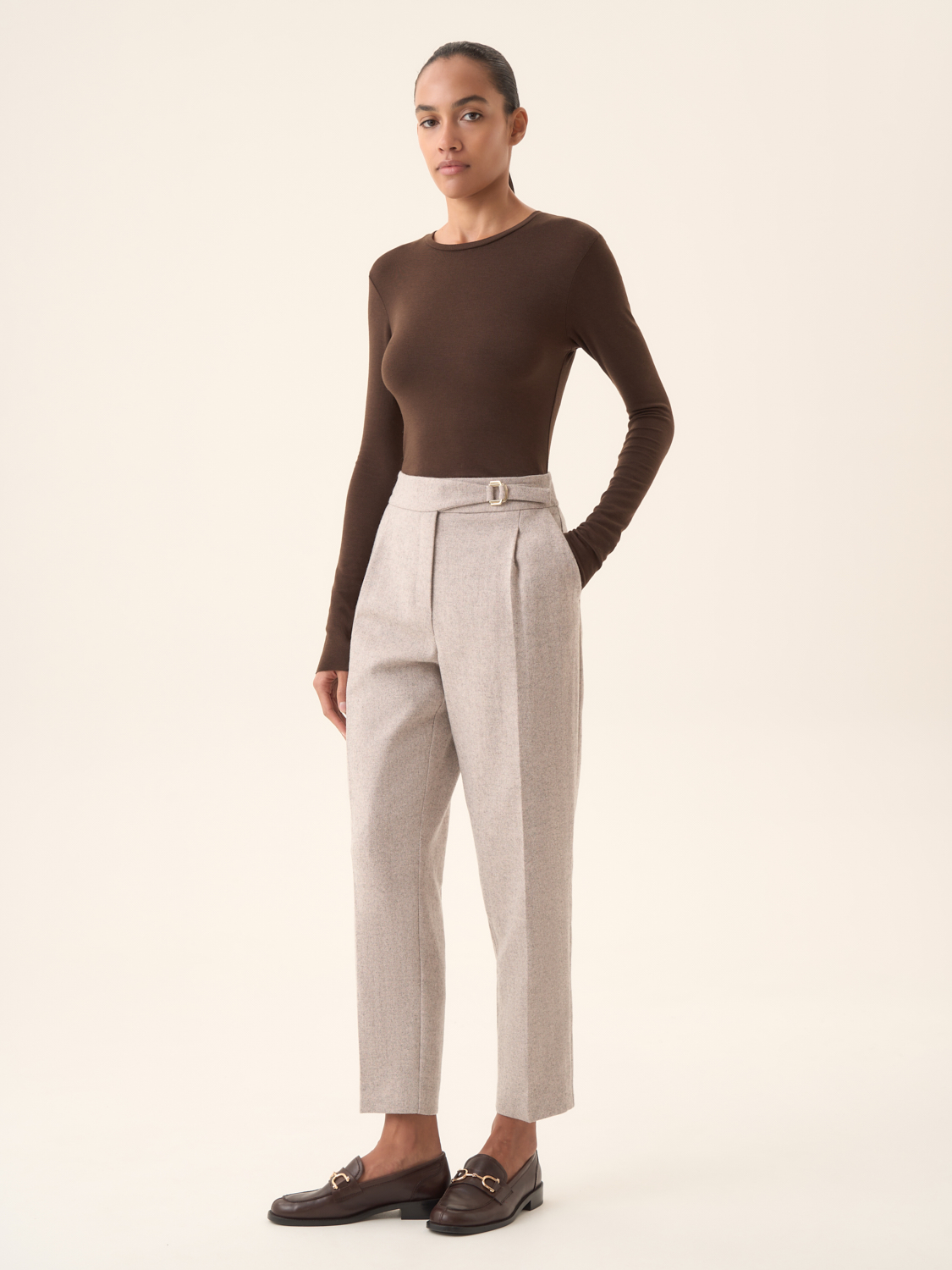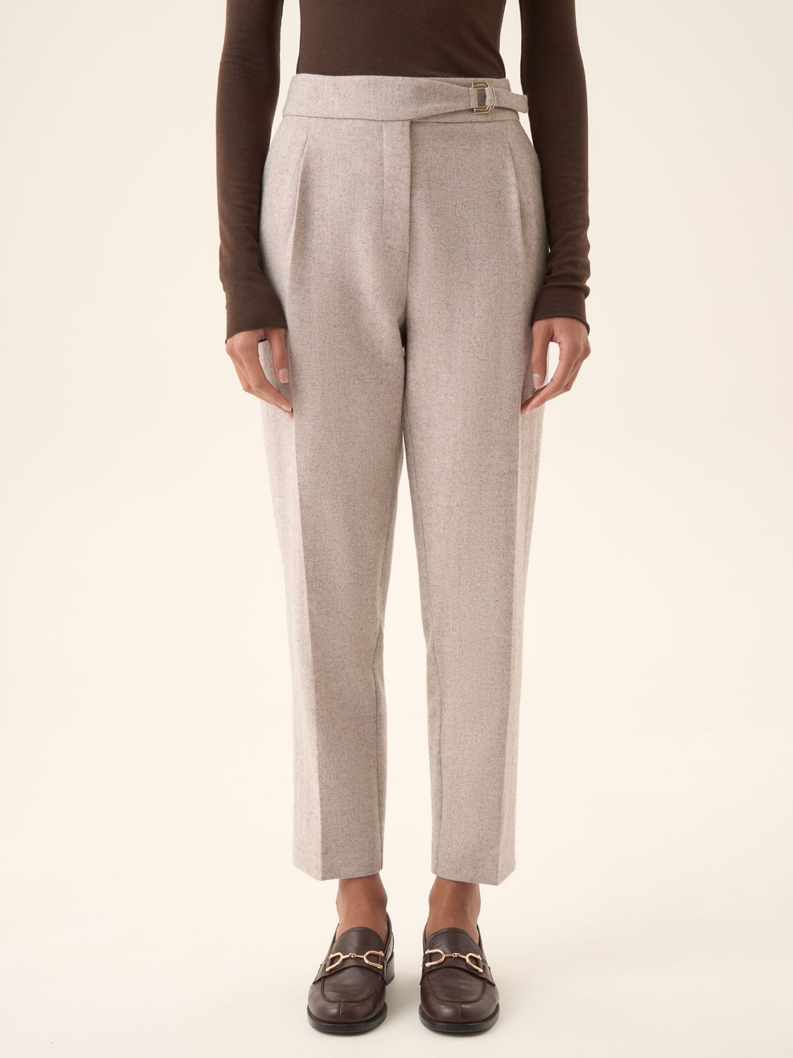 Эти костюмные брюки — идеальный выбор для создания элегантного и стильного образа. Изготовленные из высококачественного материала, они обеспечивают комфорт и легкость в носке. Прямой крой и элегантные стрелки подчеркивают фигуру, придавая образу утонченность. Особая деталь — пояс с пряжкой, который акцентирует внимание на талии и добавляет интересный штрих к классическому дизайну. Эти брюки легко сочетать с различными топами и обувью, что делает их универсальными для офисных луков и вечерних выходов.