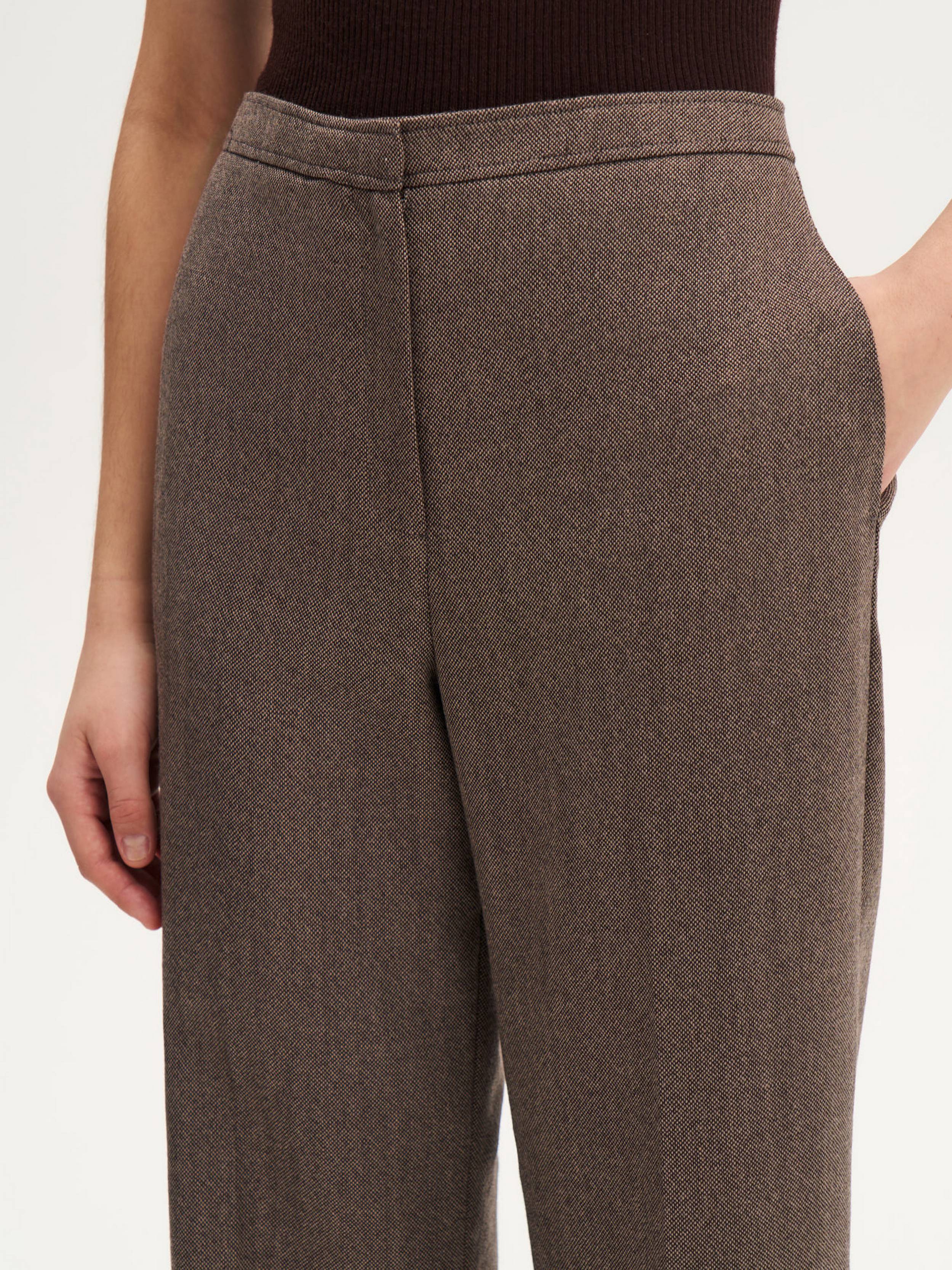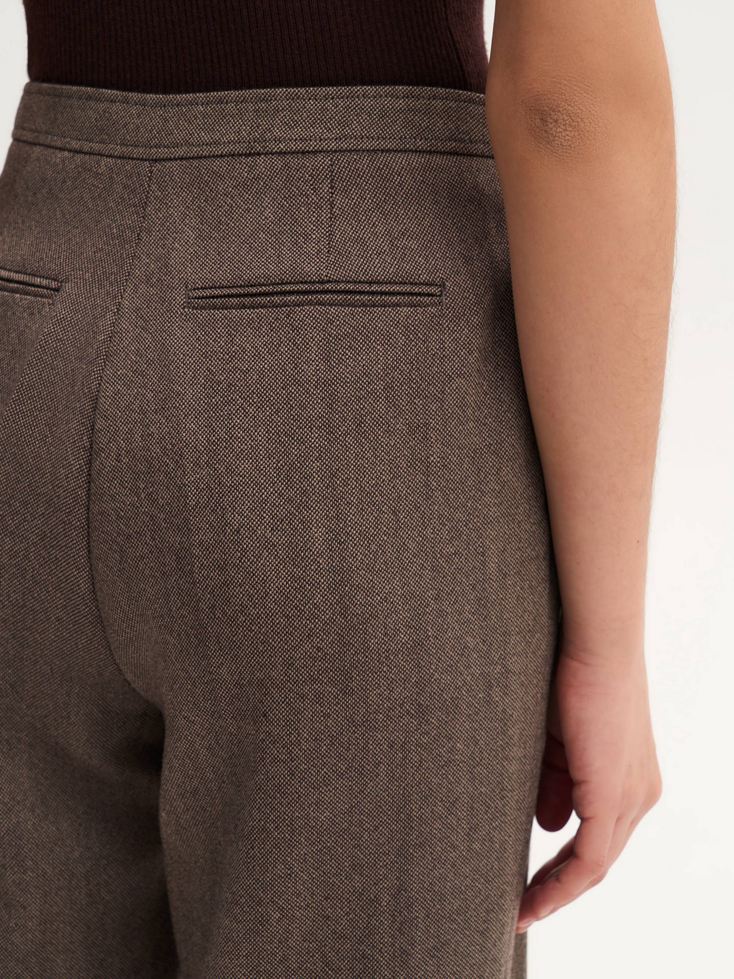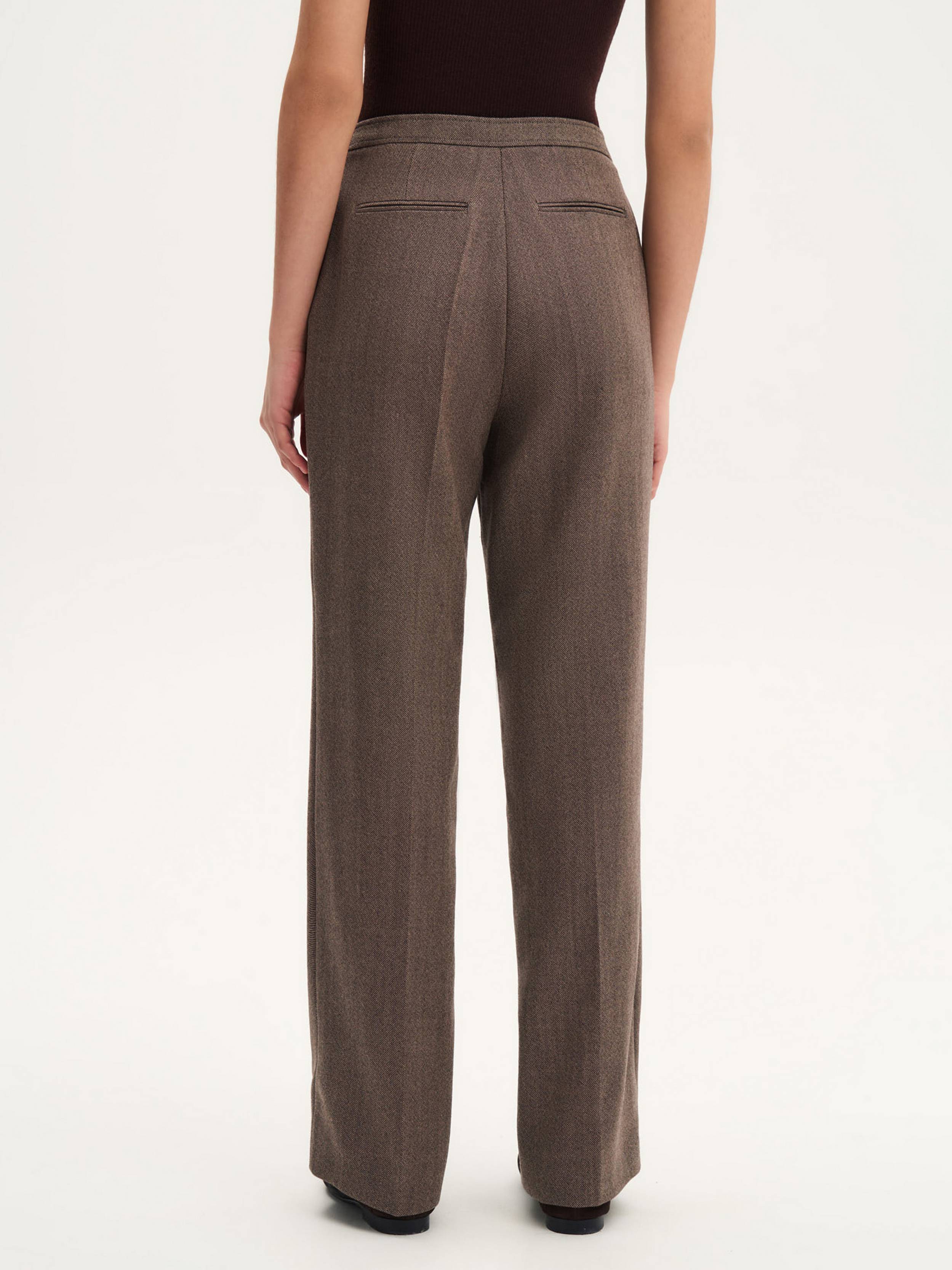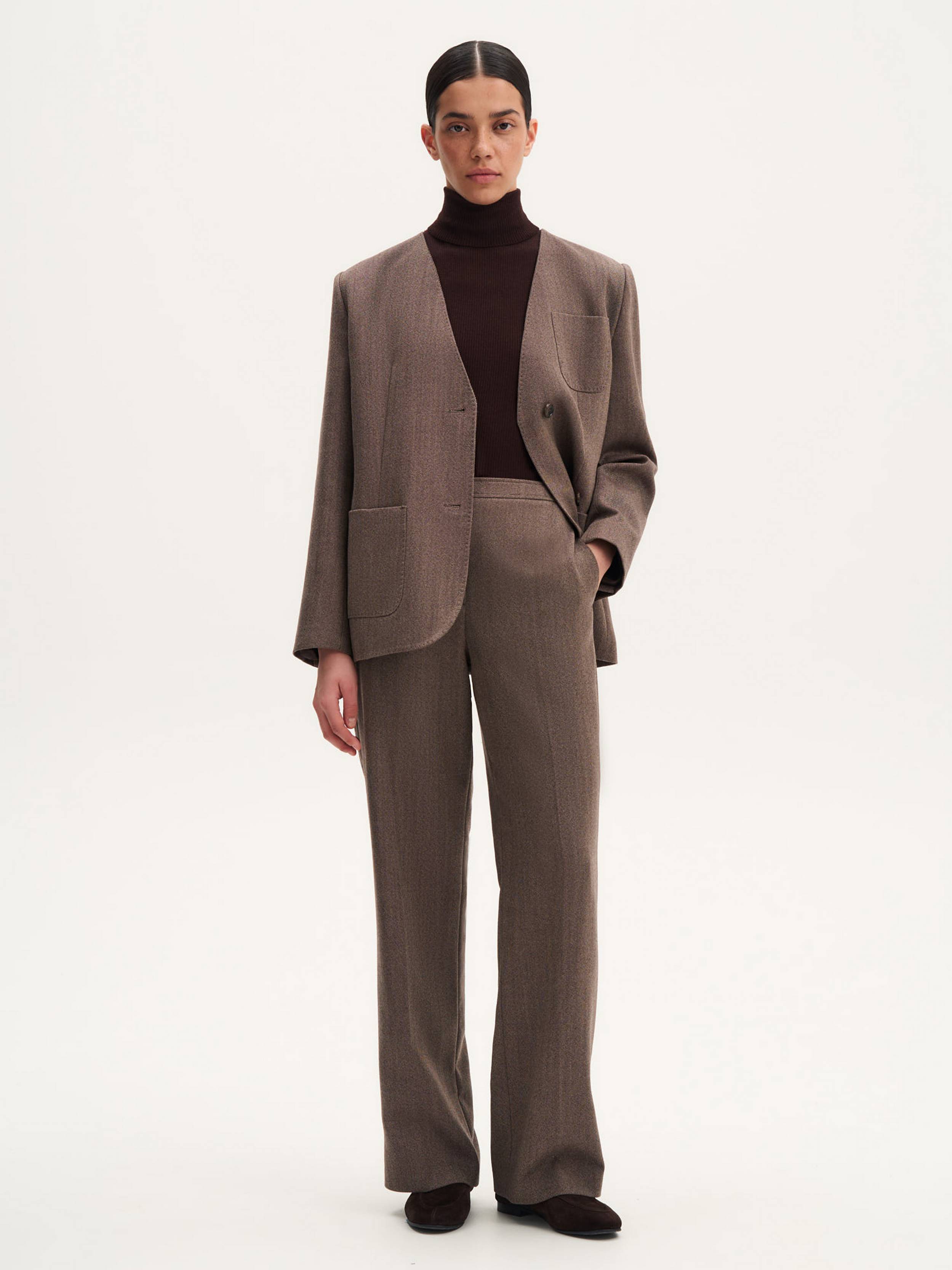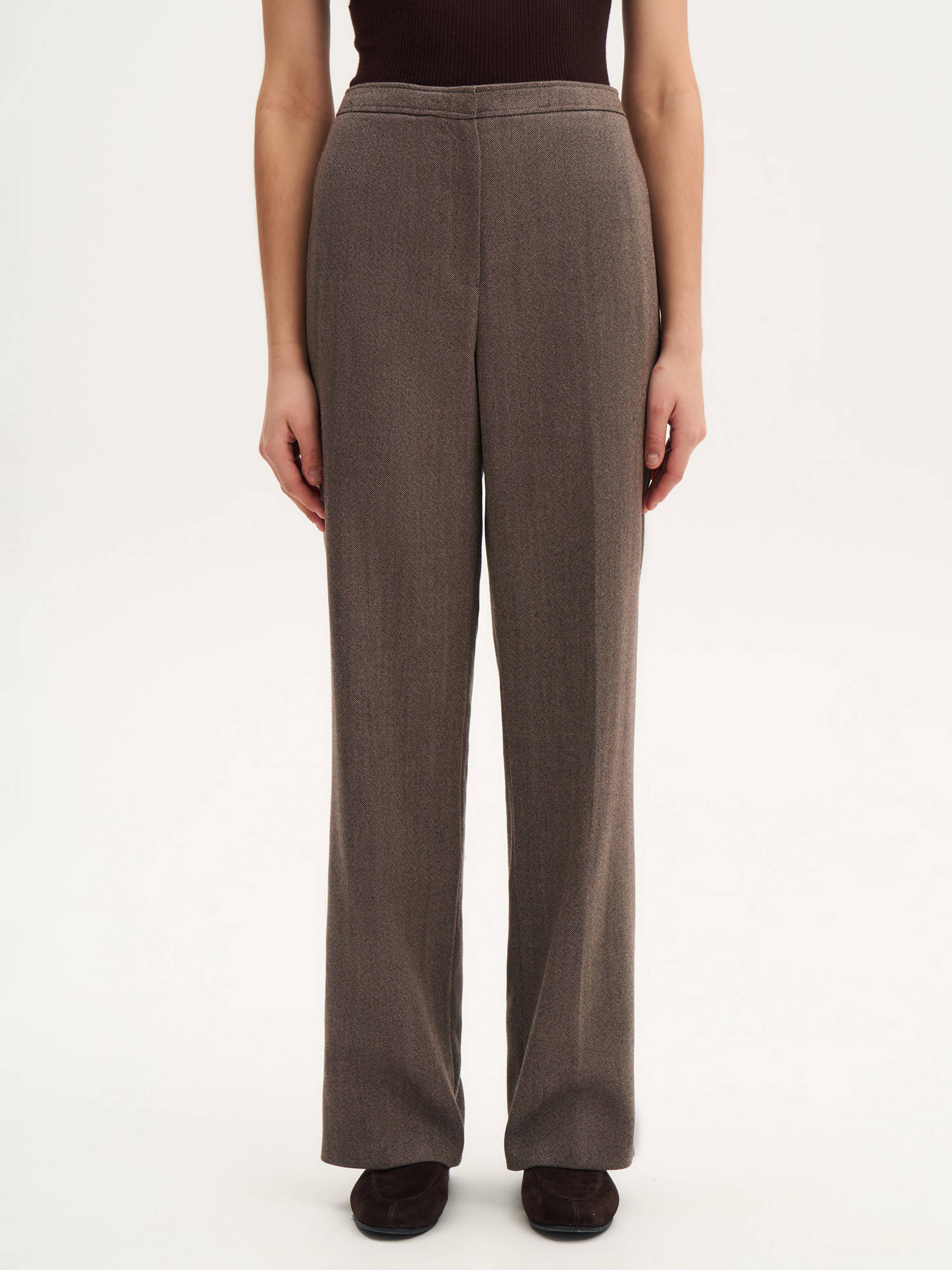 Костюмные брюки с добавлением шерсти — стильное сочетание элегантности и практичности. Прямой силуэт визуально вытягивает фигуру, создавая утонченный образ, а продуманный крой обеспечивает комфортную посадку. Натуральная шерсть в составе делает ткань приятной на ощупь, придавая модели мягкость и легкость. Плотная, но дышащая фактура позволяет чувствовать себя комфортно в течение всего дня, сохраняя тепло в прохладное время года. Брюки органично сочетаются с классическими жакетами, мягкими трикотажными водолазками или строгими рубашками, позволяя создавать как деловые, так и повседневные образы.