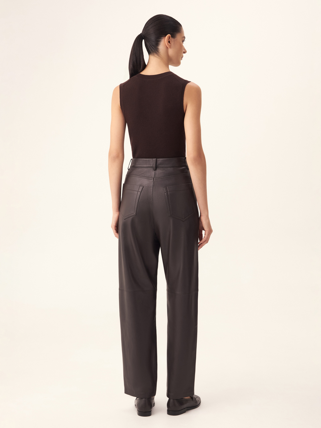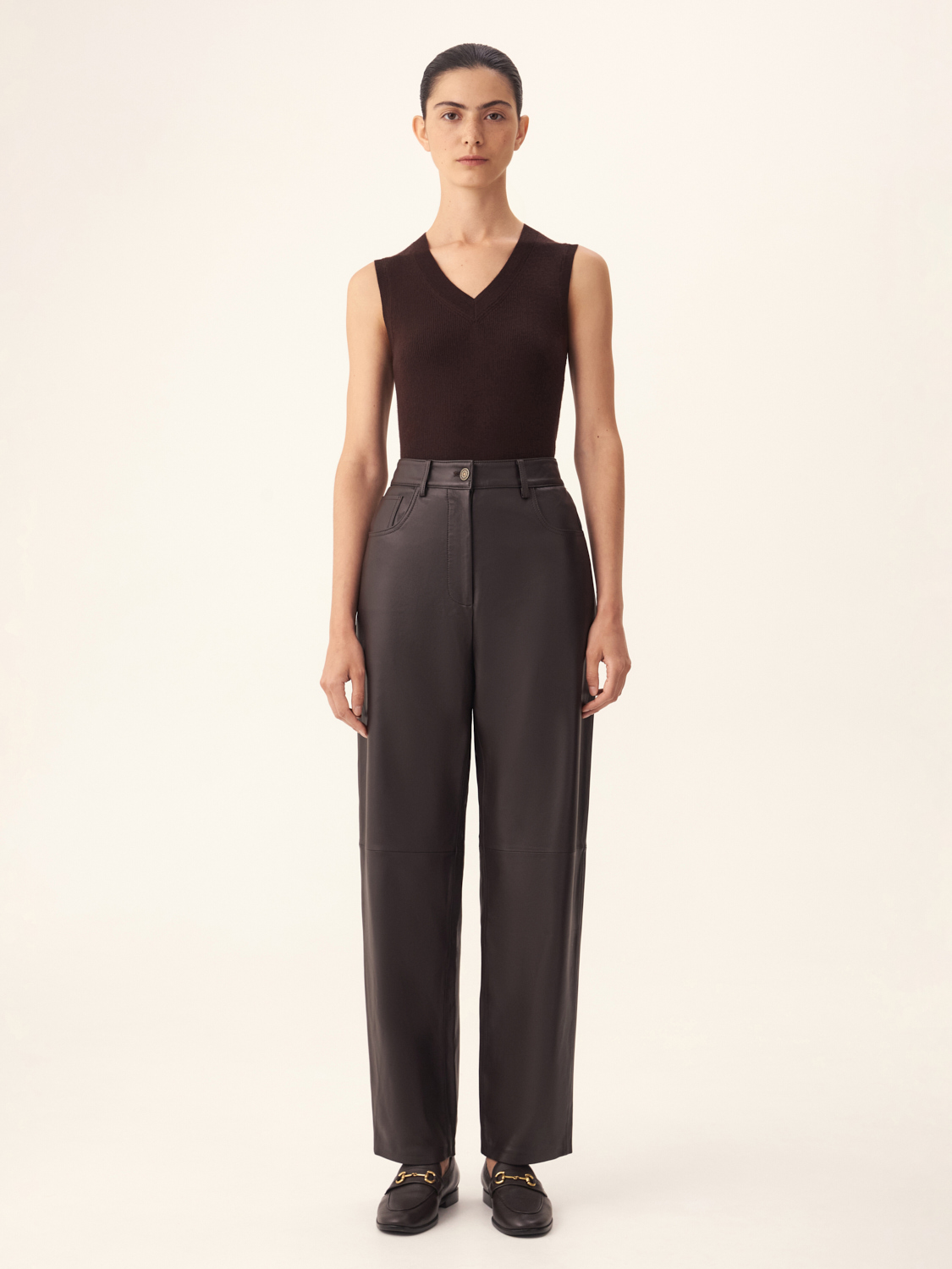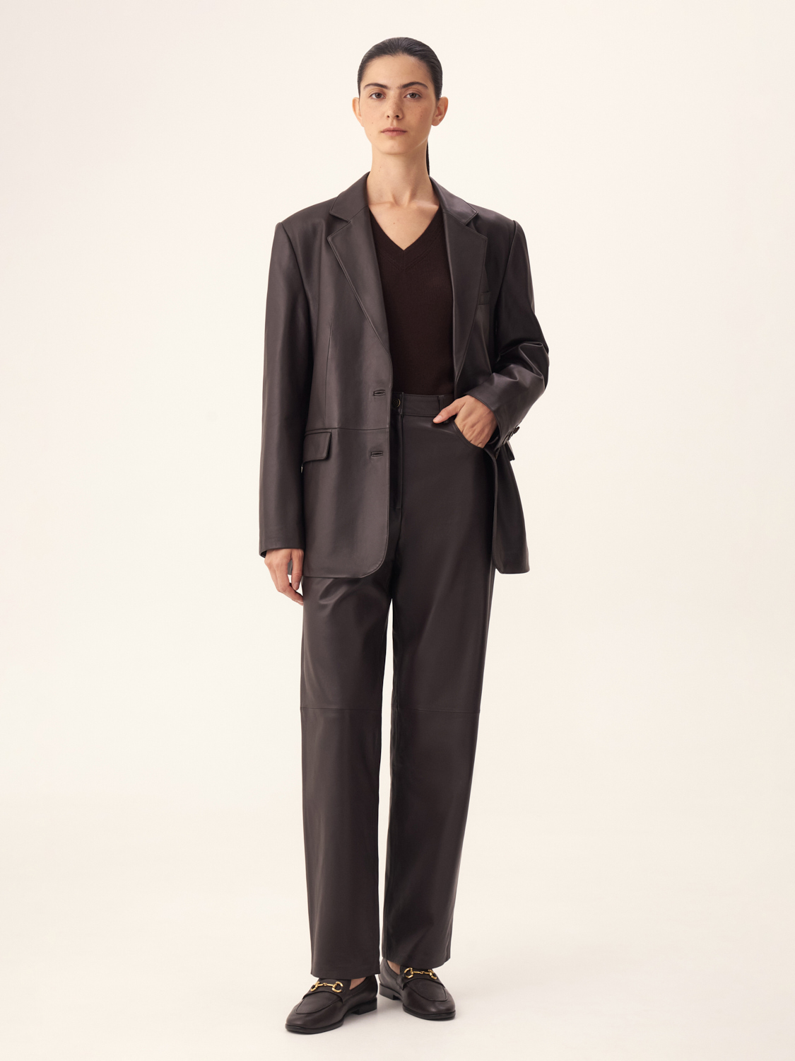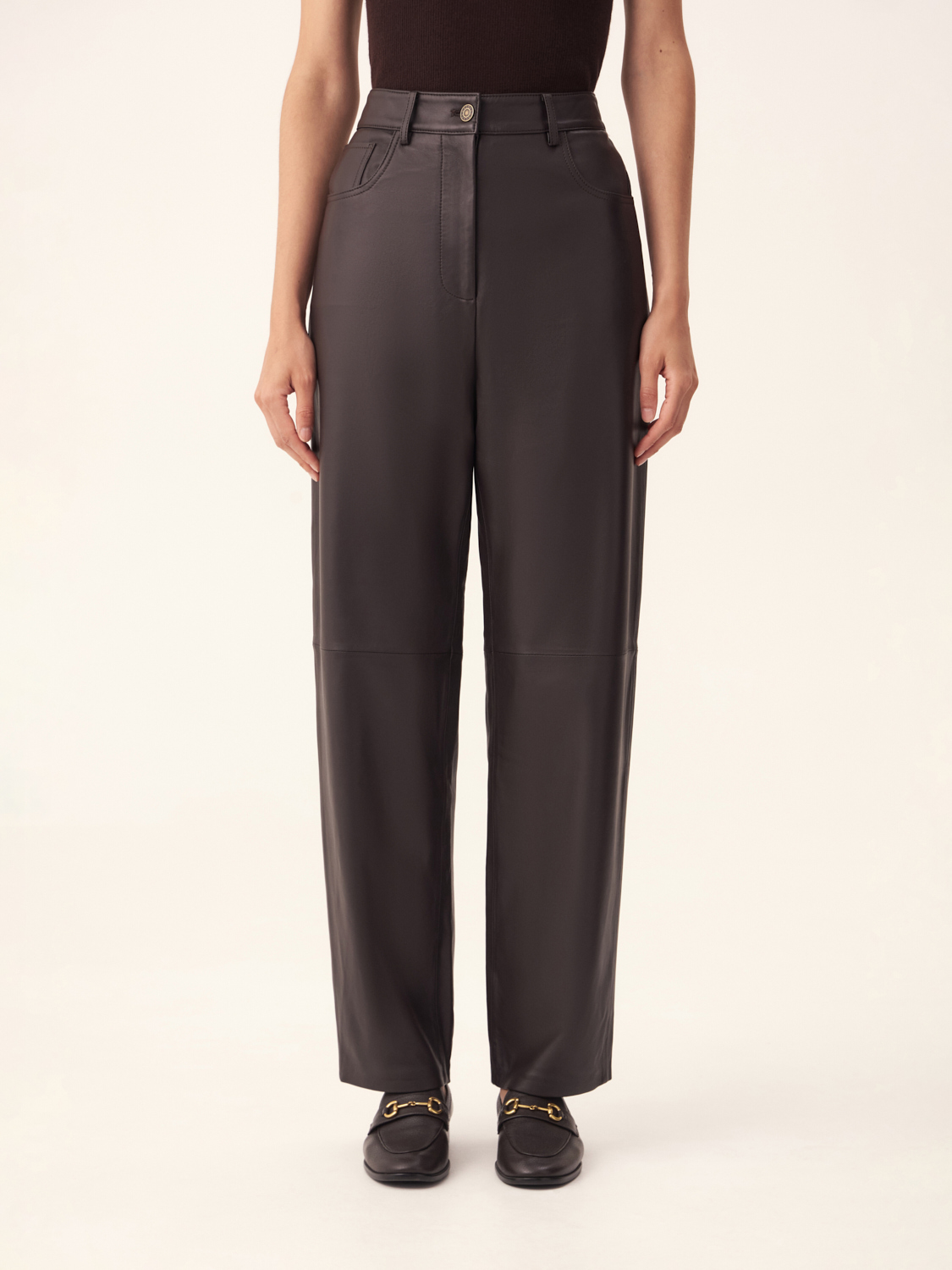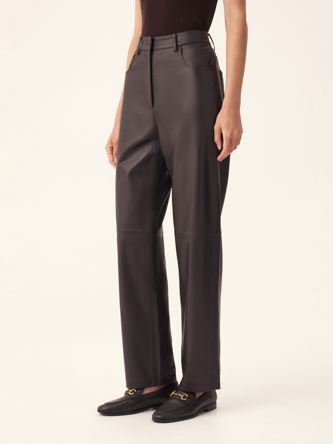 Эти брюки из натуральной кожи воплощают собой современный стиль и утонченную элегантность. Высокая посадка и свободный крой придают силуэту выразительность и позволяют легко комбинировать эту модель как с базовыми топами, так и с объемными свитерами. Плотная, но мягкая кожа обеспечивает комфорт при носке, а классические боковые и задние карманы добавляют практичности. Благодаря минималистичному дизайну брюки идеально подойдут для создания стильных повседневных или вечерних образов. Они станут акцентом любого гардероба, придавая ему дерзкий и в то же время сдержанный характер.