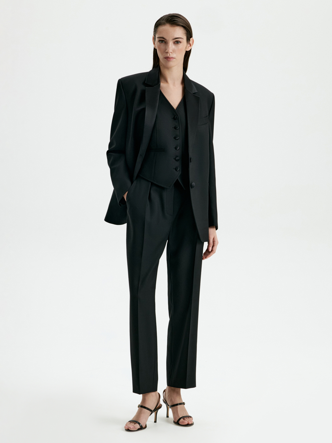Брюки со стрелками — современная классика, которая всегда остается актуальной. Прямой силуэт с идеально выверенными пропорциями подчеркивает изящество фигуры, а стрелки добавляют образу строгости и элегантности. Укороченная длина делает эту модель универсальной: она прекрасно сочетается как с лодочками, так и с ботильонами или лоферами. Брюки выполнены из плотного материала, который обеспечивает комфорт и сохраняет форму в течение дня. Эта модель станет базовым элементом гардероба, подходящим для создания стильных офисных аутфитов и расслабленных вечерних образов.