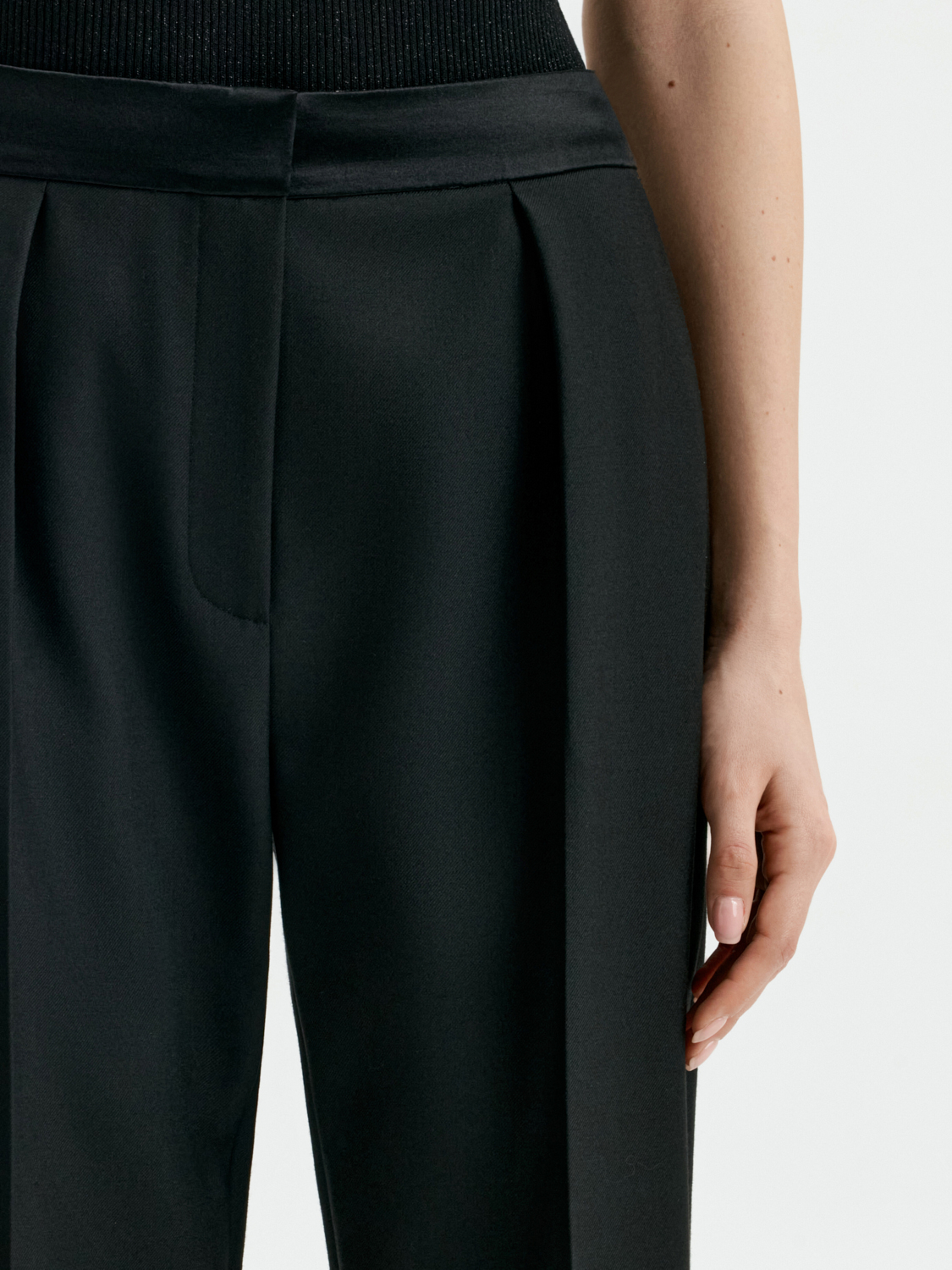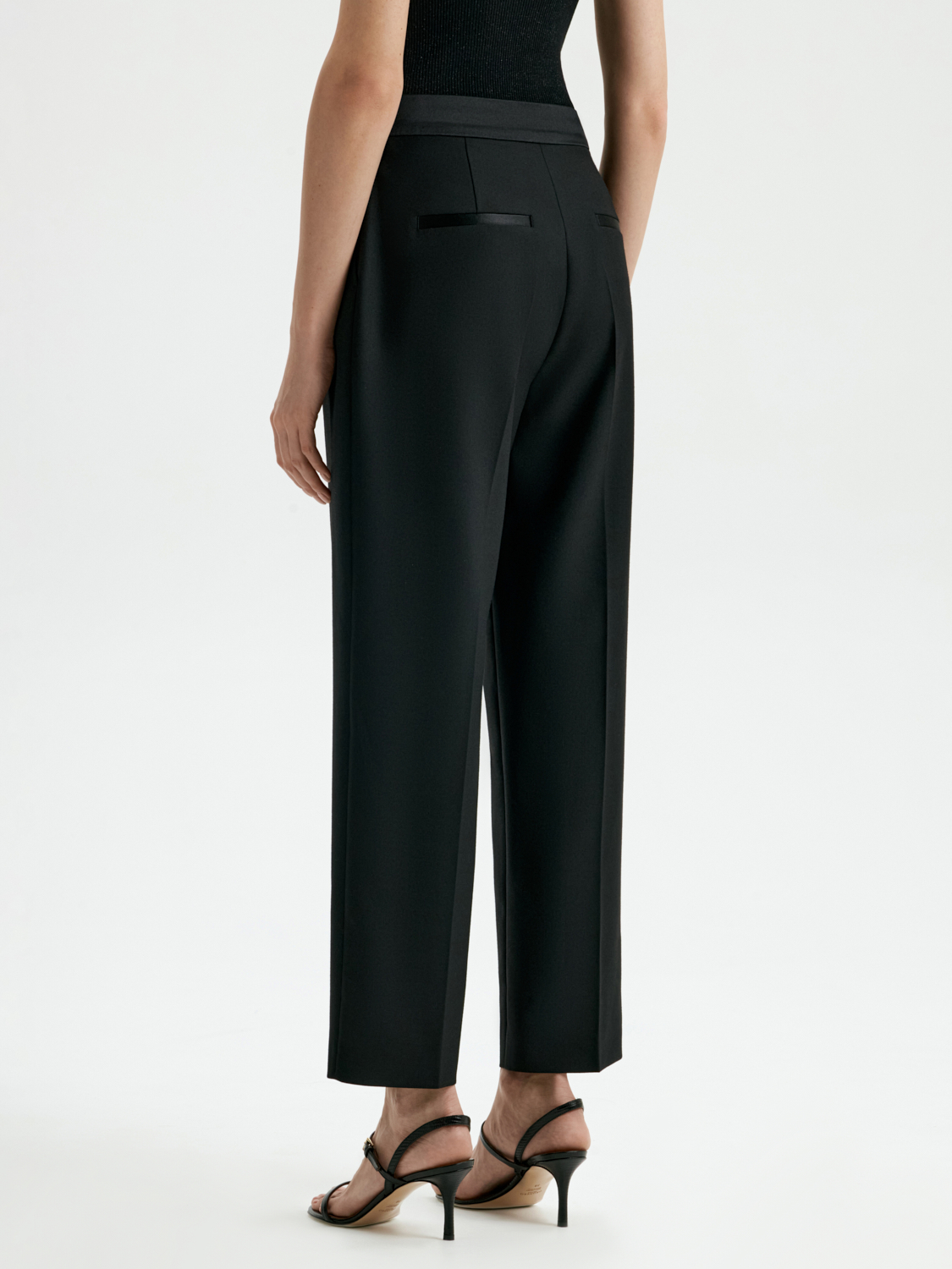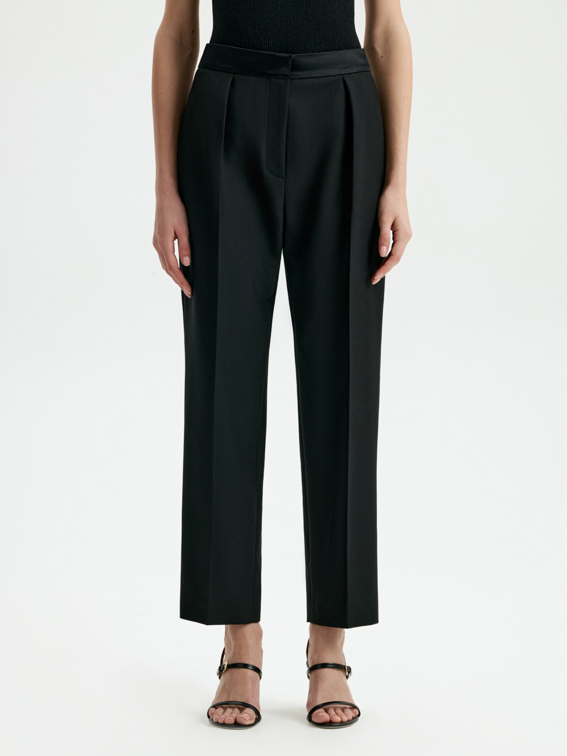 Брюки со стрелками — современная классика, которая всегда остается актуальной. Прямой силуэт с идеально выверенными пропорциями подчеркивает изящество фигуры, а стрелки добавляют образу строгости и элегантности. Укороченная длина делает эту модель универсальной: она прекрасно сочетается как с лодочками, так и с ботильонами или лоферами. Брюки выполнены из плотного материала, который обеспечивает комфорт и сохраняет форму в течение дня. Эта модель станет базовым элементом гардероба, подходящим для создания стильных офисных аутфитов и расслабленных вечерних образов.