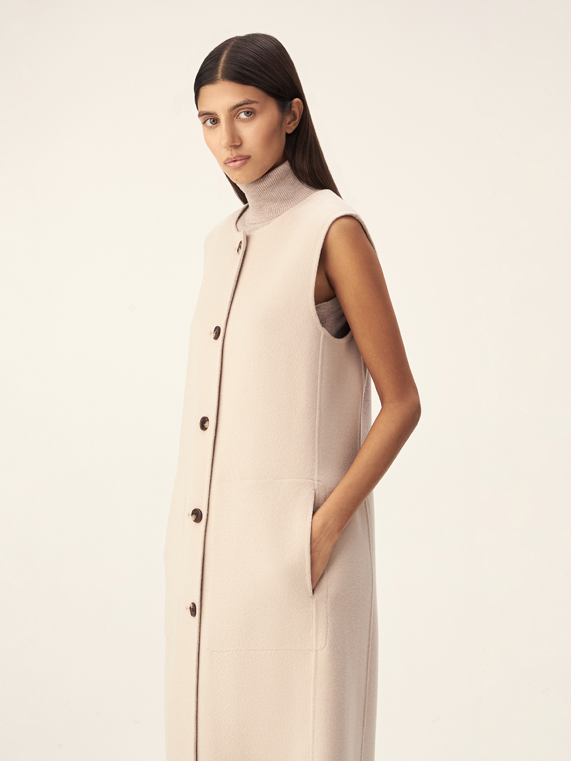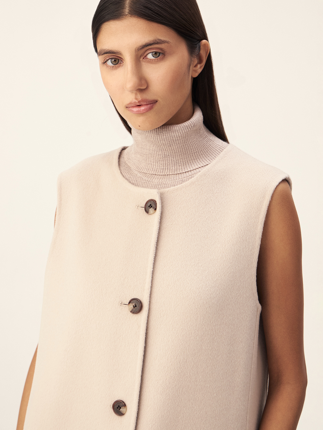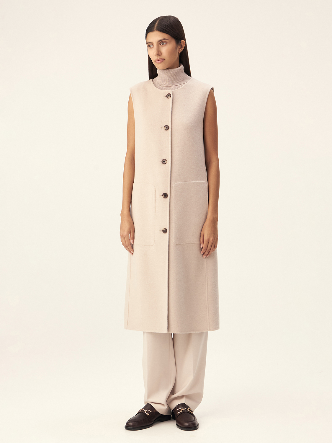 Удлиненная жилетка из шерсти мериноса — воплощение утонченного стиля и функциональности. Изготовленная из высококачественной шерсти, она обеспечивает тепло и легкость, создавая уютный образ. Асимметричный крой и крупные пуговицы придают модели современный вид, делая ее универсальной для различных стилей. Она прекрасно вписывается в многослойные аутфиты, создавая гармонию с монохромными цветами и текстурами. Сочетайте жилетку с элегантными брюками или легким платьем — она станет отличным дополнением к вашему гардеробу, подчеркивая вашу индивидуальность и вкус.