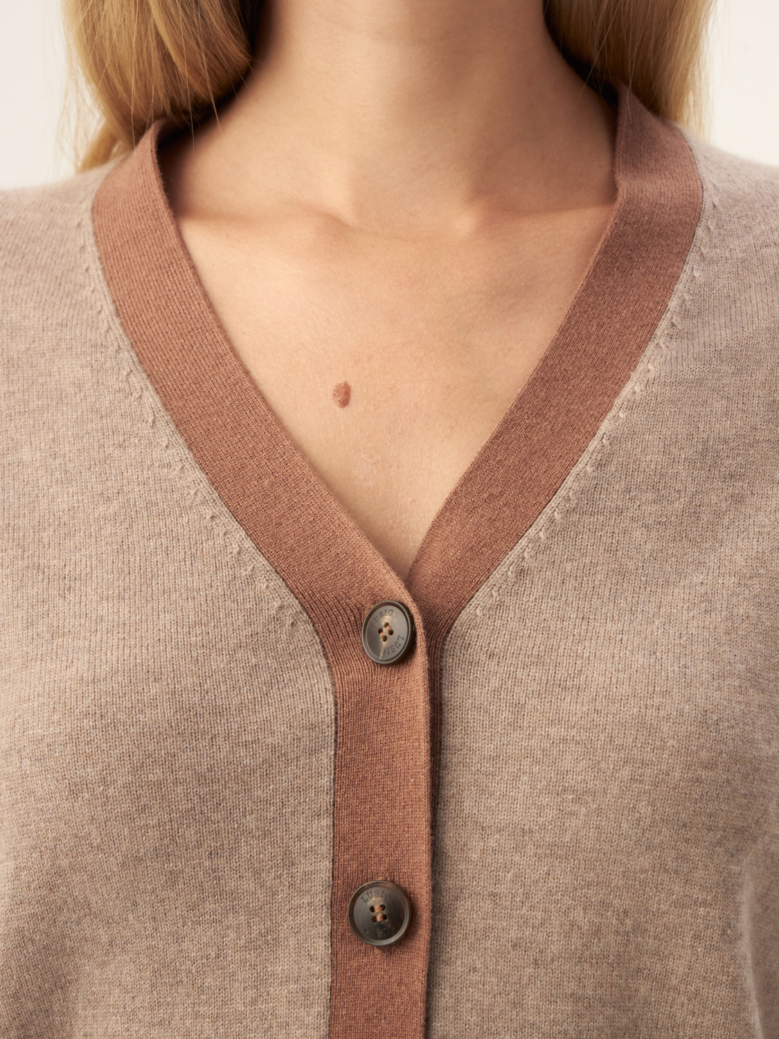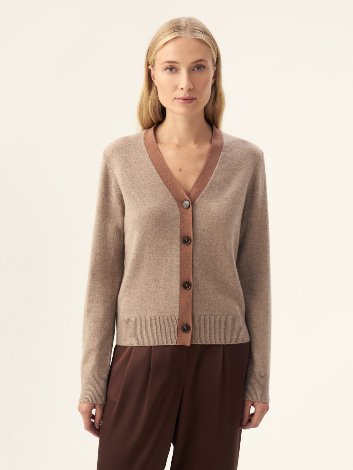 Кардиган из шерсти мериноса и кашемира воплощает в себе элегантность и комфорт. Благодаря мягкой текстуре и продуманному дизайну, эта модель станет незаменимым элементом вашего гардероба в прохладное время года. V-образный вырез и контрастная окантовка придают кардигану изысканный вид, а удобная посадка и фактурные пуговицы подчеркивают его стильный характер. Идеально подходит для создания многослойных образов в комбинации с брюками или юбками. Этот кардиган станет универсальным дополнением как к повседневному, так и к более формальному аутфиту. На модели размер S. Параметры модели: рост 172, 84-62-91.