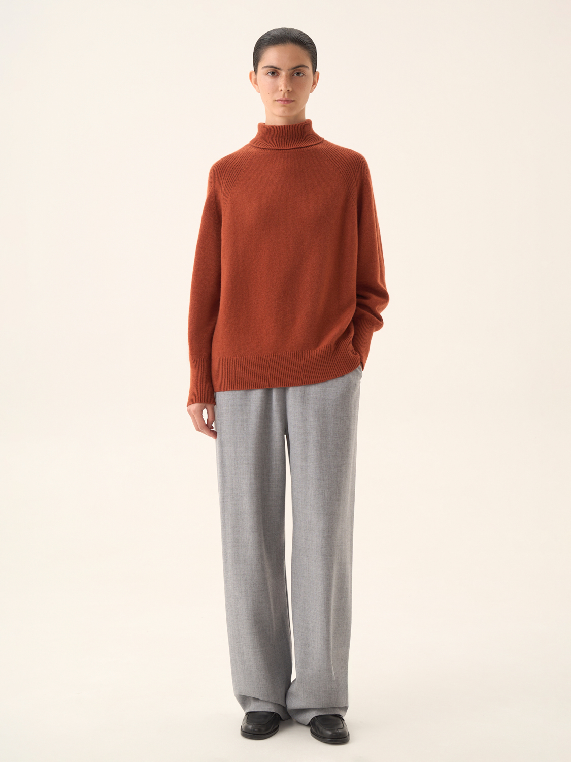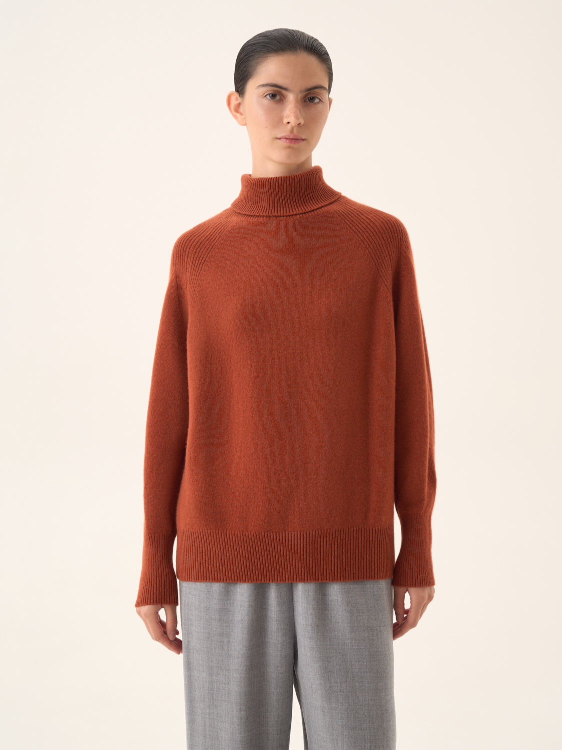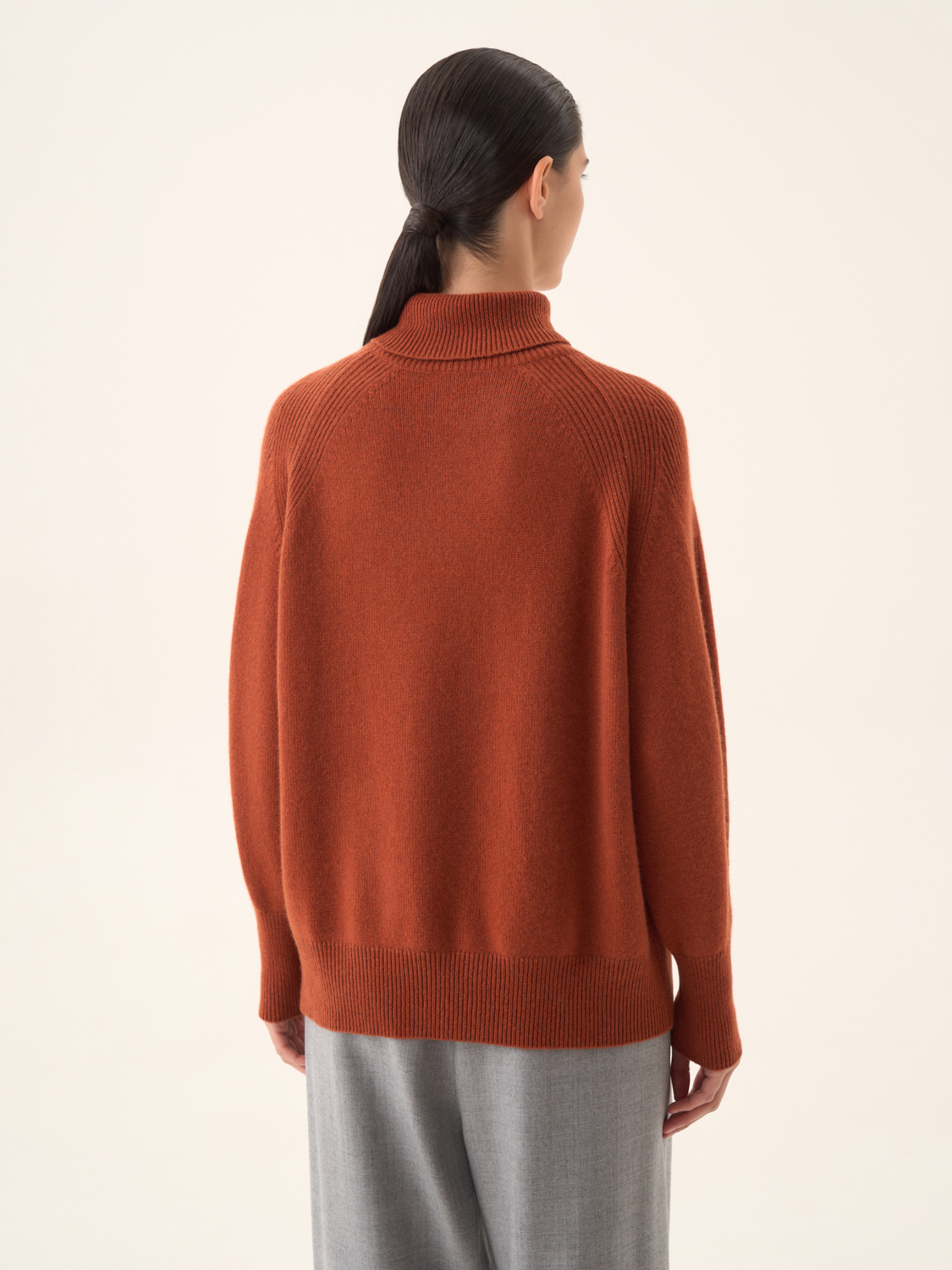 Джемпер свободного кроя из кашемира — воплощение стиля и комфорта. Мягкий и теплый, он идеально подходит для прохладной погоды. Свободный крой и слегка удлиненные рукава создают расслабленный силуэт, который остается элегантным и современным. Воротник-стойка добавляет дополнительный уровень комфорта и уюта, защищая от холодного ветра. Ребристая отделка на манжетах, подоле и воротнике подчеркивает минималистичный дизайн, делая этот джемпер универсальным элементом гардероба. Он легко комбинируется с различными стилями — от делового до повседневного. На модели размер S.