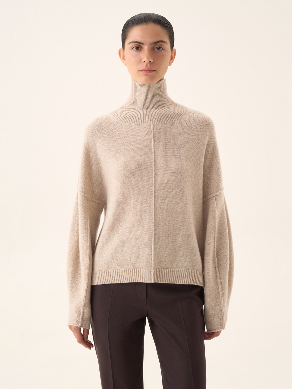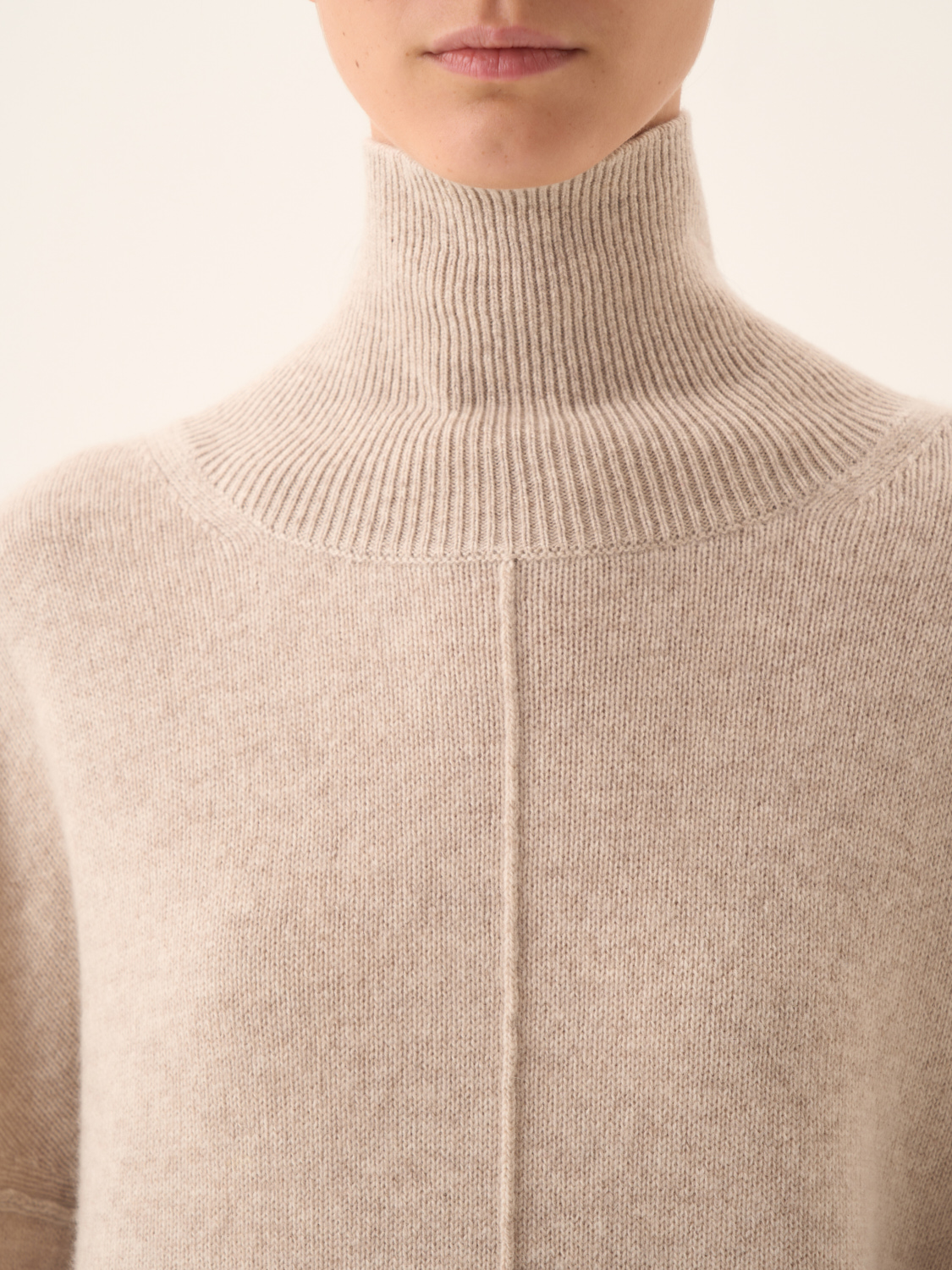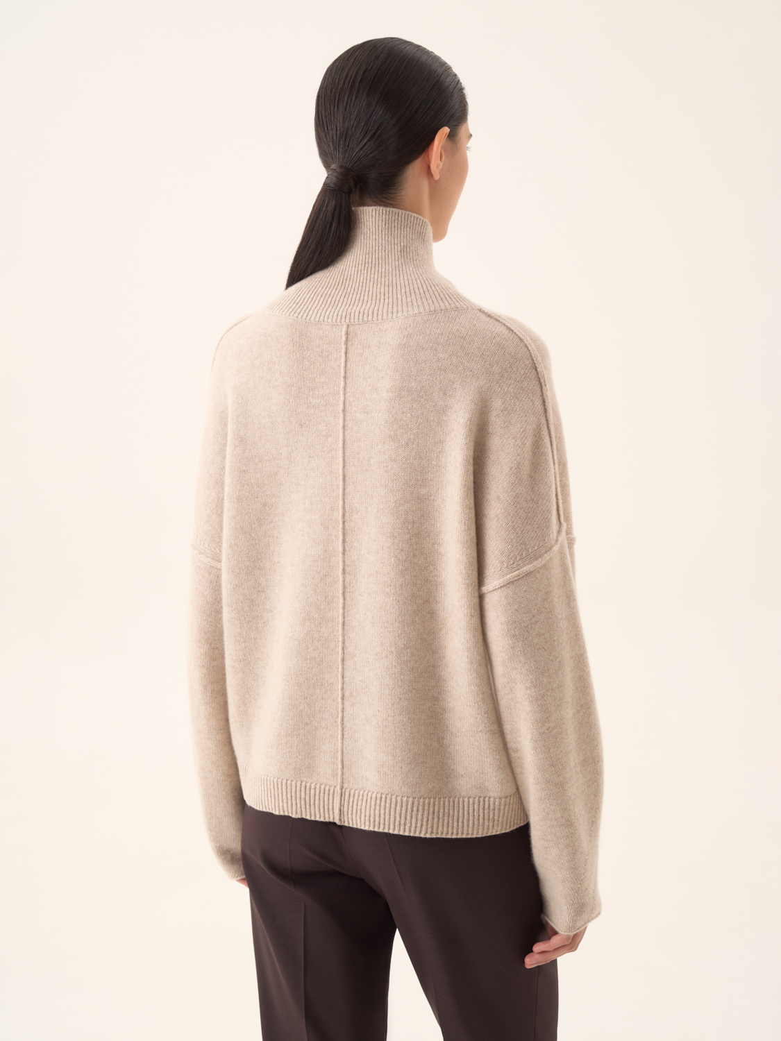 Джемпер из кашемира — идеальный выбор для создания уютного и элегантного образа. Мягкий и приятный на ощупь кашемир обеспечивает комфорт и тепло в холодное время года. Свободный крой и спущенные плечи создают расслабленный силуэт, который придает образу легкость и современность. Воротник-стойка добавляет джемперу нотку утонченности и защищает от ветра, делая его практичным выбором для осенне-зимнего сезона. Центральный шов спереди и сзади подчеркивает минималистичный дизайн, а ребристые манжеты и подол придают завершенность образу. Этот джемпер легко комбинируется с брюками и юбками, становясь универсальной базой для создания стильных ансамблей. На модели размер S.