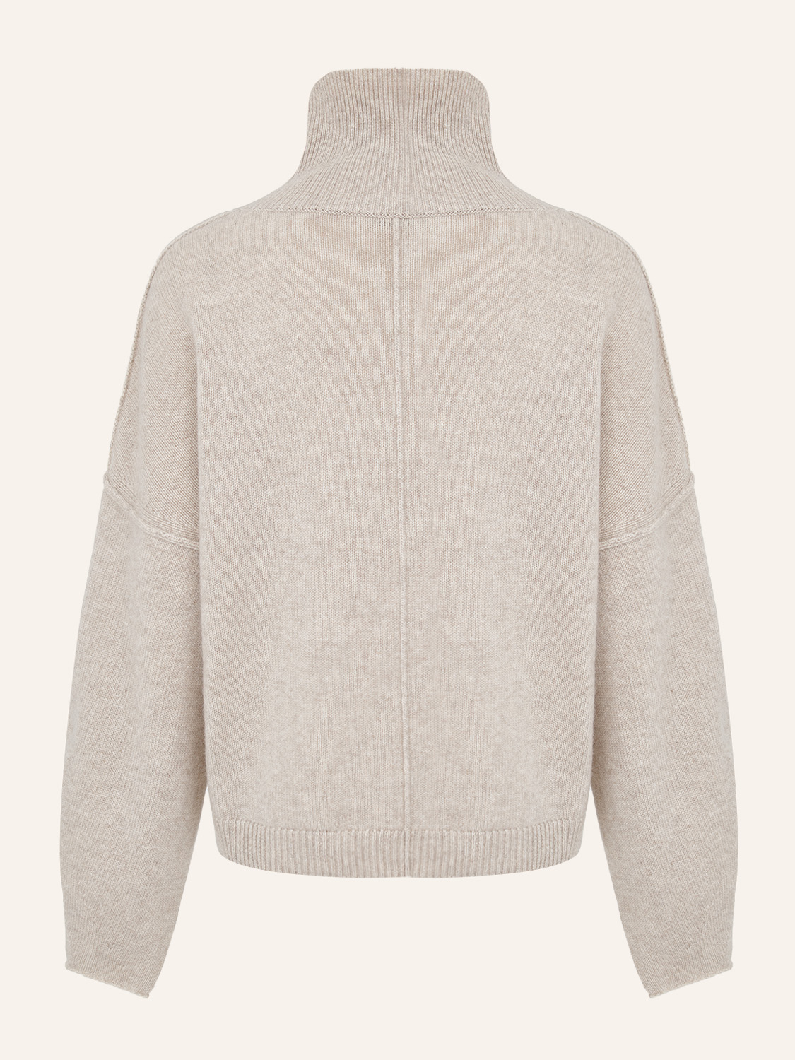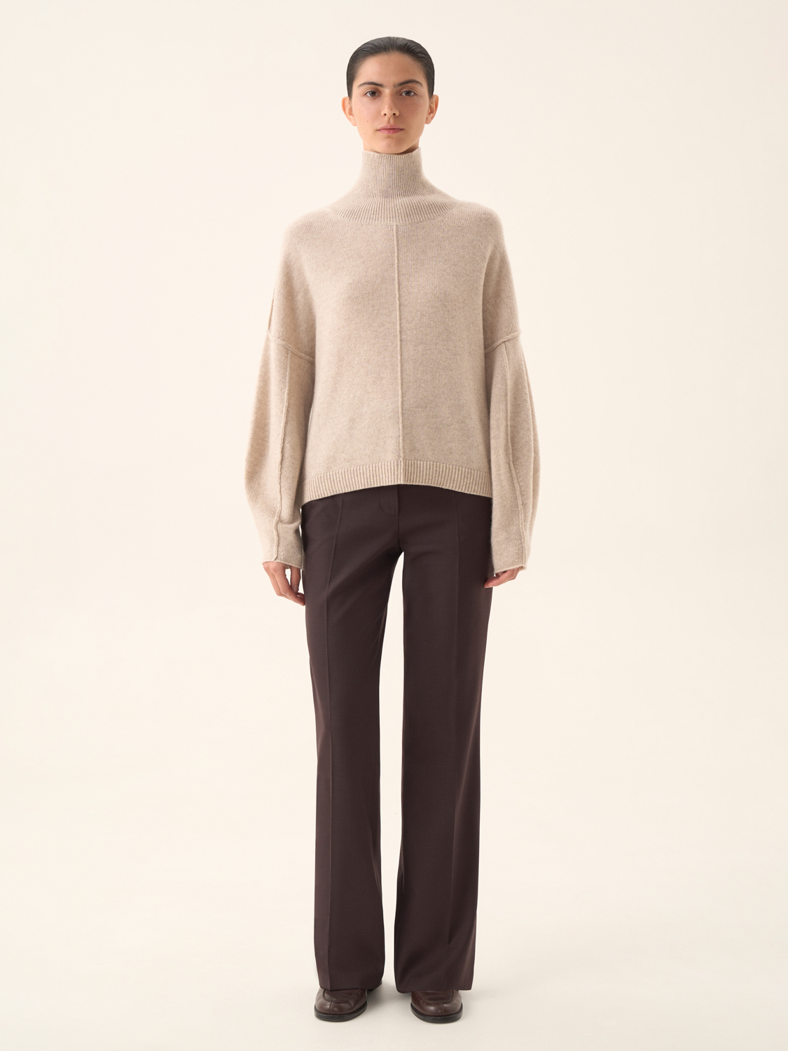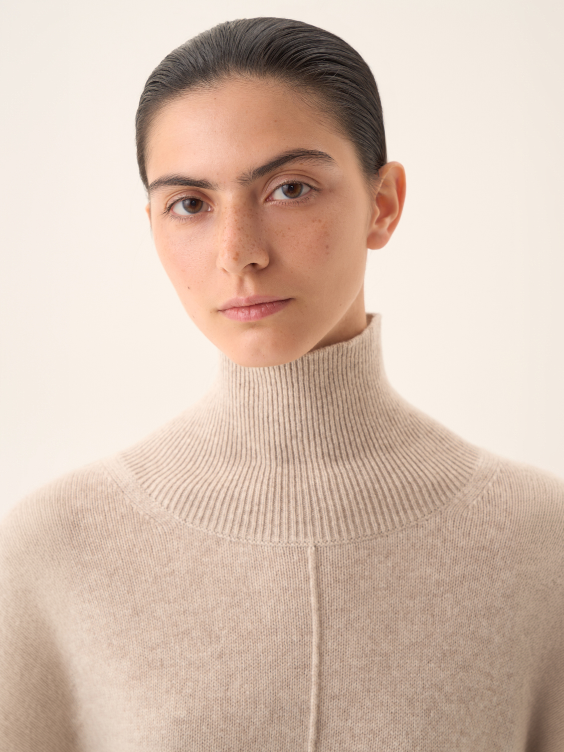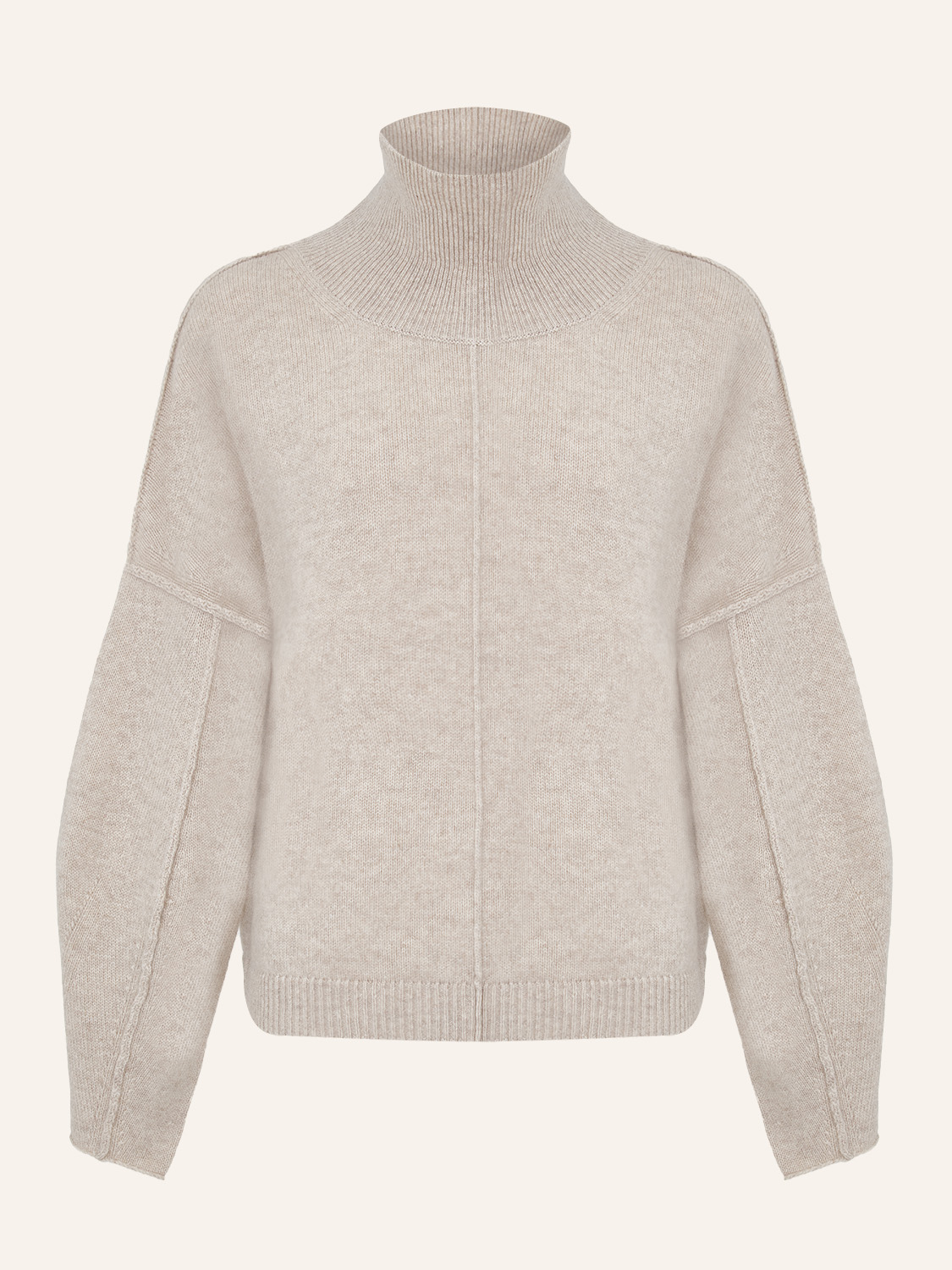 Джемпер из кашемира — идеальный выбор для создания уютного и элегантного образа. Мягкий и приятный на ощупь кашемир обеспечивает комфорт и тепло в холодное время года. Свободный крой и спущенные плечи создают расслабленный силуэт, который придает образу легкость и современность. Воротник-стойка добавляет джемперу нотку утонченности и защищает от ветра, делая его практичным выбором для осенне-зимнего сезона. Центральный шов спереди и сзади подчеркивает минималистичный дизайн, а ребристые манжеты и подол придают завершенность образу. Этот джемпер легко комбинируется с брюками и юбками, становясь универсальной базой для создания стильных ансамблей. На модели размер S.