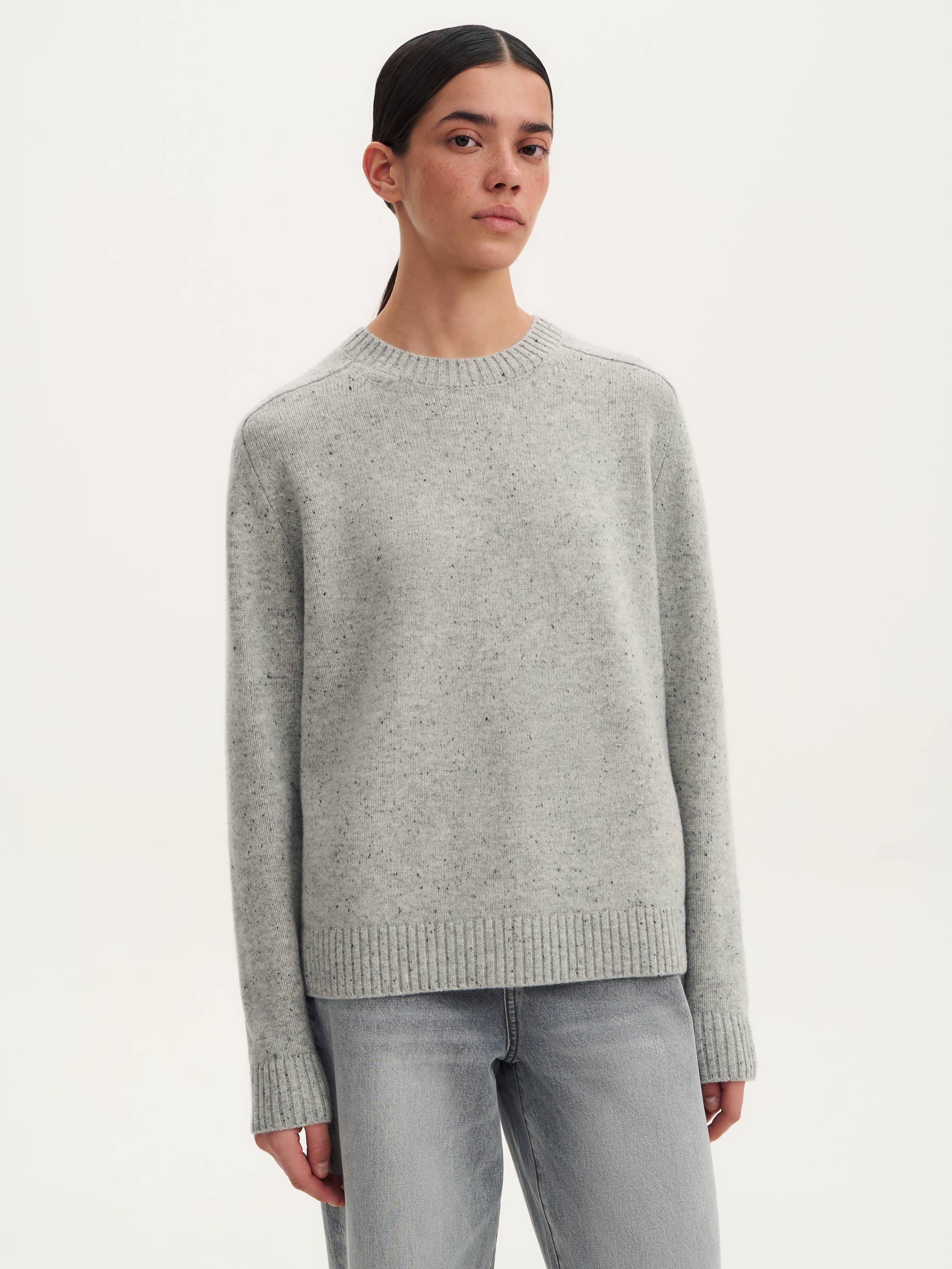 Джемпер из 100% шерсти мериноса с мягкой фактурой и естественным теплом. Материал дышащий, комфортный в носке и устойчивый к износу, обеспечивает деликатную тактильность и аккуратный внешний вид. Крой прямой, с круглым вырезом и длинными рукавами на плотных манжетах. Нижний край выполнен в широкой резинке, что формирует чистый силуэт. Лаконичный дизайн делает модель универсальной: она вписывается как в повседневные комплекты с джинсами и трикотажем, так и в более собранные образы с жакетами и брюками.