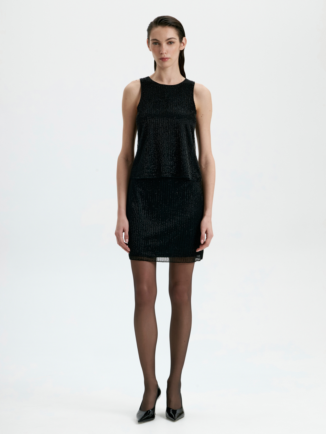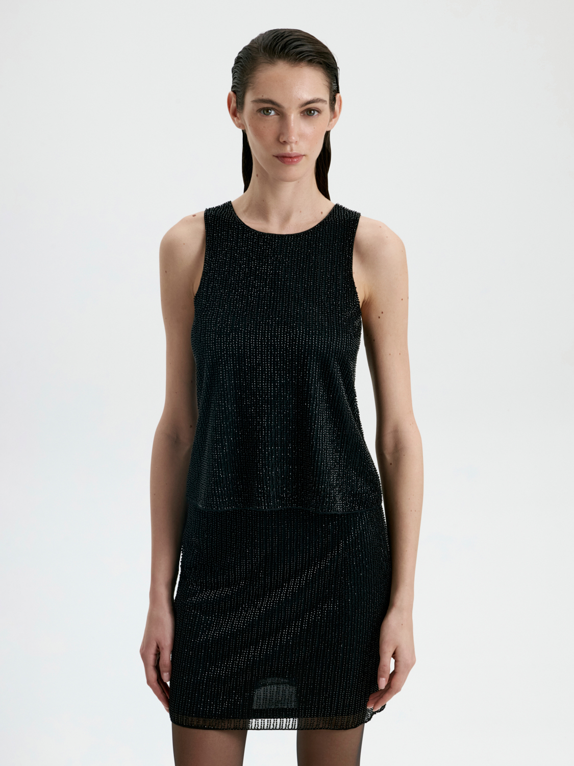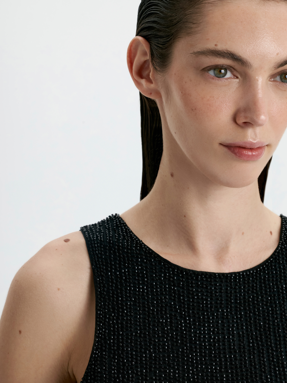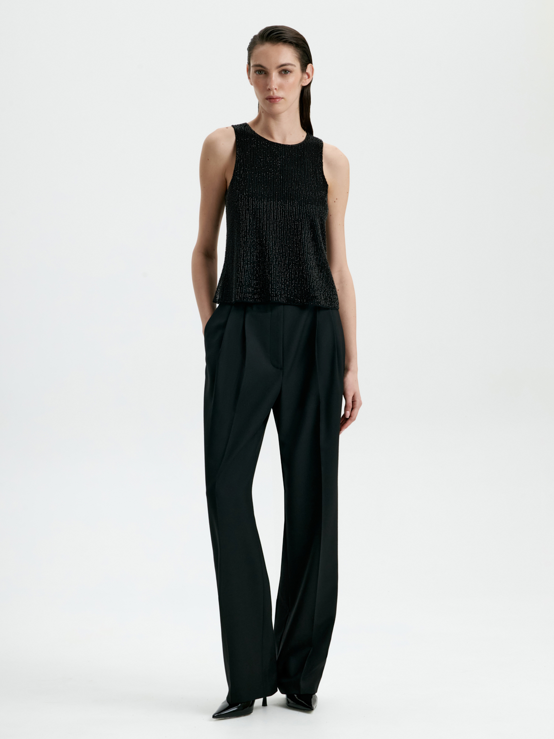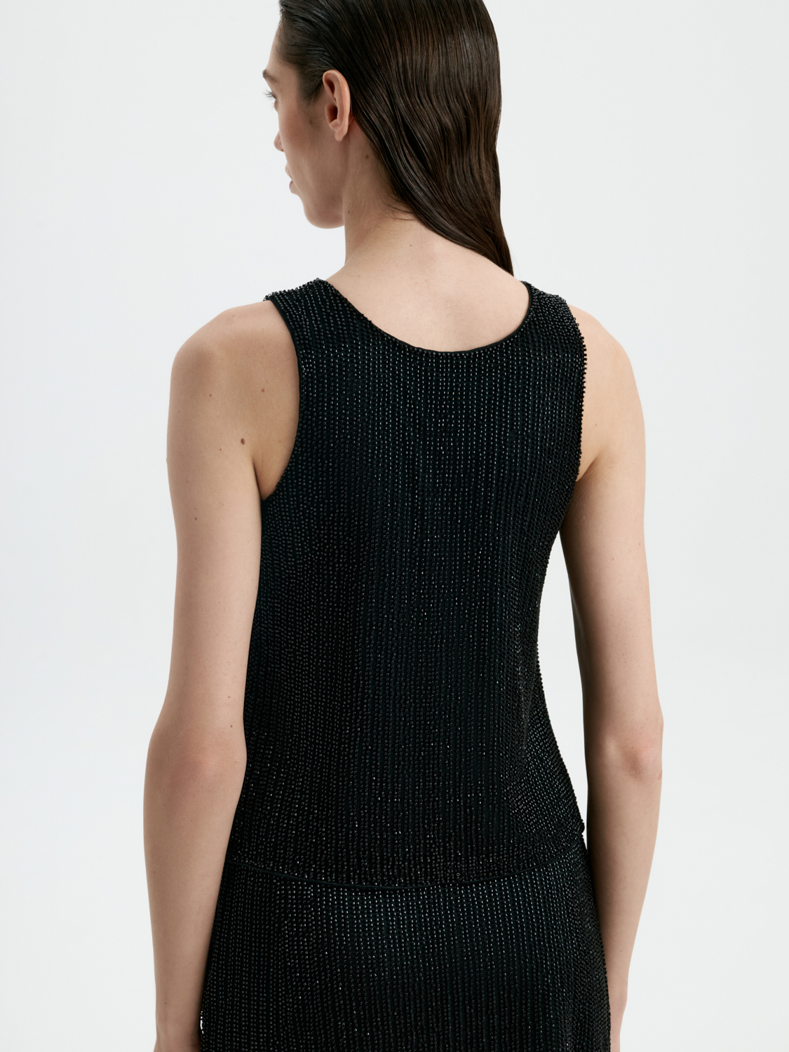 Топ, расшитый бисером, — изысканная и эффектная модель для особых случаев. Тонкая ручная отделка бисером создает утонченный блеск, который привлекает внимание и добавляет образу нарядности. Плотный, но мягкий материал обеспечивает комфортную посадку, подчеркивая линии фигуры. Классический цвет подчеркивает элегантность модели, делая ее универсальной для вечерних выходов. Этот топ легко комбинируется с классическими брюками или юбками, создавая гармоничные и выразительные образы для торжественных мероприятий или стильных вечеринок.