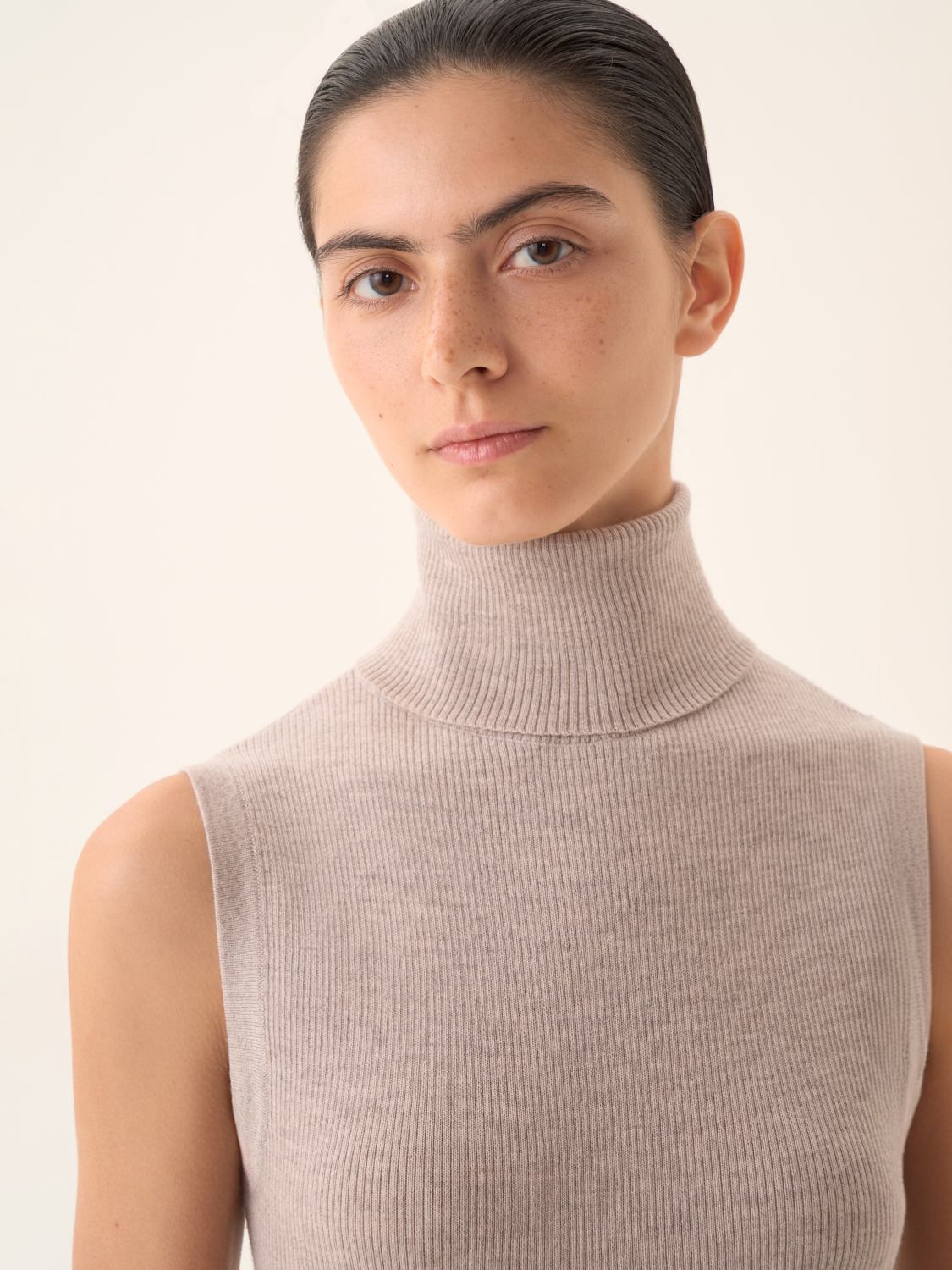 Эта водолазка без рукавов выполнена в актуальном рубчике, что придает изделию современный и стильный вид. Высокий воротник подчеркивает утонченность образа, создавая акцент на линии шеи. Приталенный крой мягко облегает фигуру, создавая женственный силуэт и обеспечивая комфорт в течение всего дня. Водолазка идеально сочетается с различными вещами вашего гардероба, будь то классические брюки или юбка, создавая современные и элегантные аутфиты. Подойдет для создания многослойных образов или как самостоятельный элемент гардероба. На модели размер S. Параметры модели: рост 175, 84-59-91.