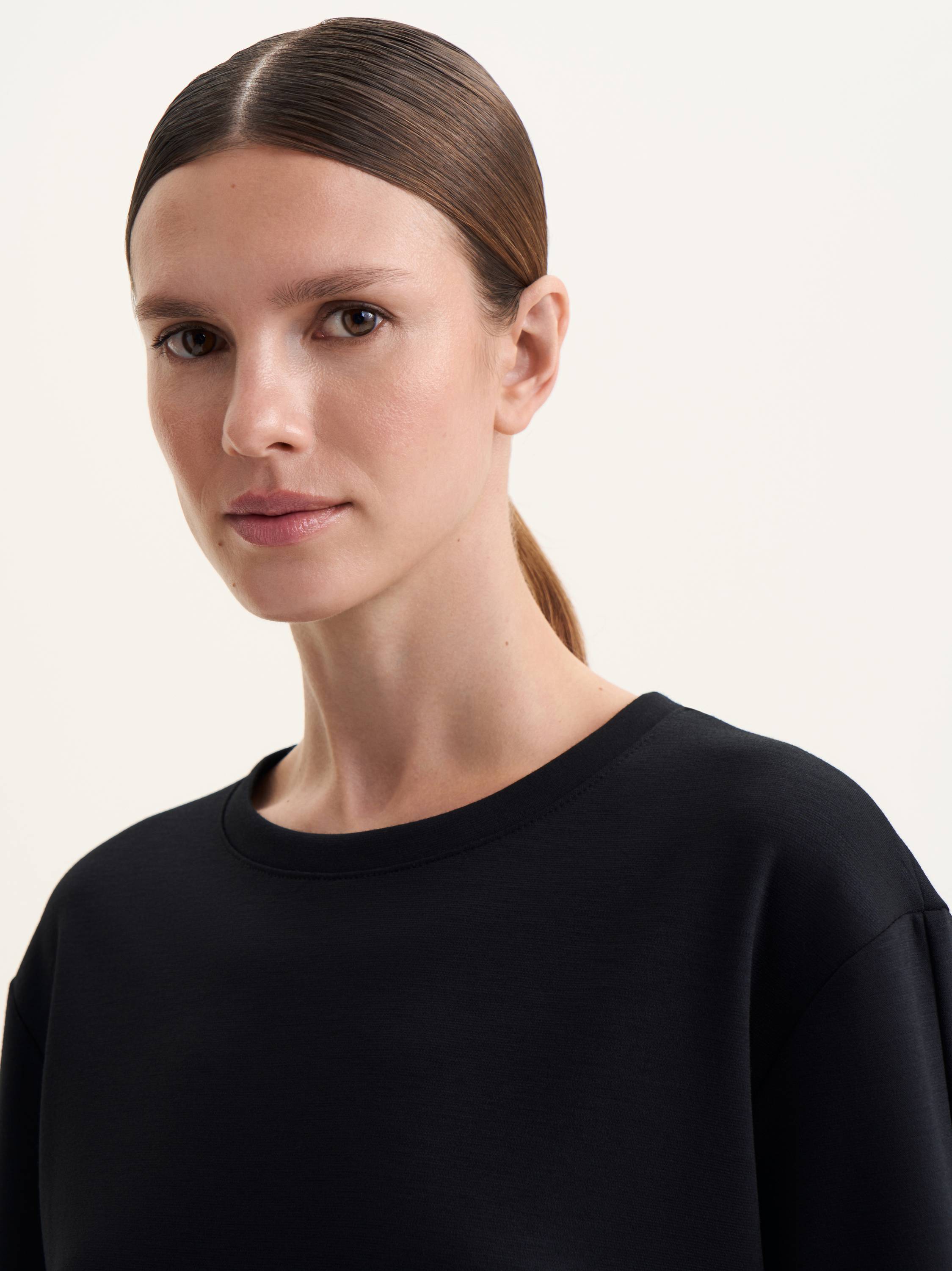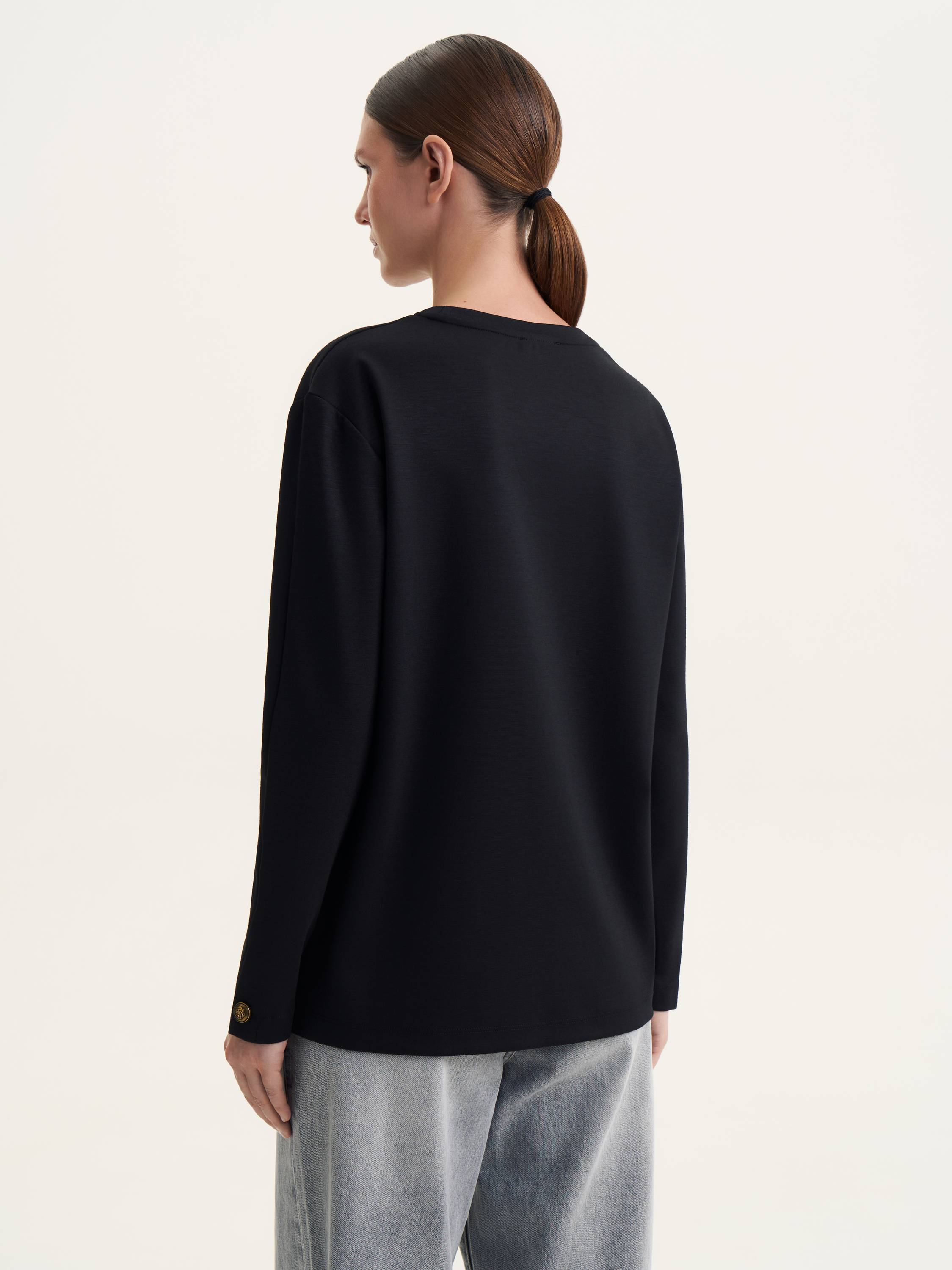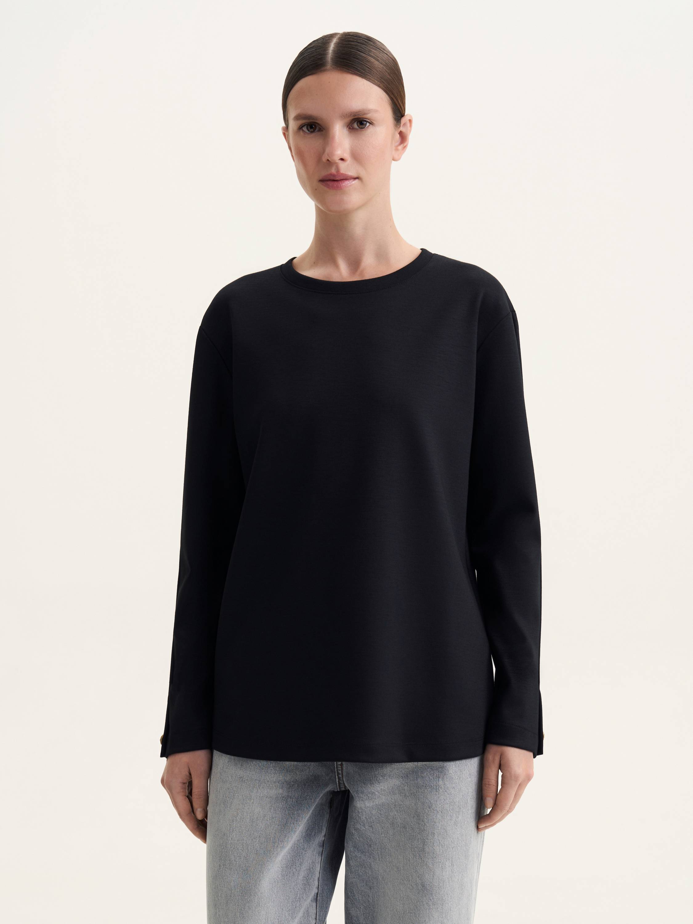 Этот лонгслив прямого кроя представляет собой гармонию между комфортом и стилем. Высококачественная ткань с добавлением шерсти делает его особенно приятным на ощупь, обеспечивая дополнительное тепло и уют. Минималистичный дизайн, дополненный пуговицами на манжетах, добавляет элегантный акцент, что делает этот лонгслив идеальным для повседневных и более формальных образов. Это универсальная вещь, которая будет отлично сочетаться как в многослойных, так и в самостоятельных ансамблях.