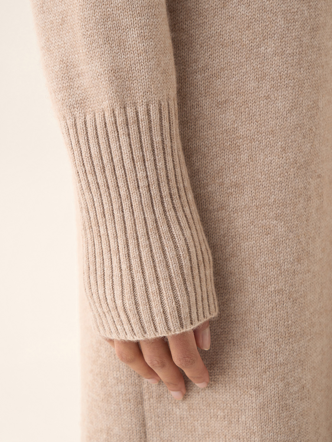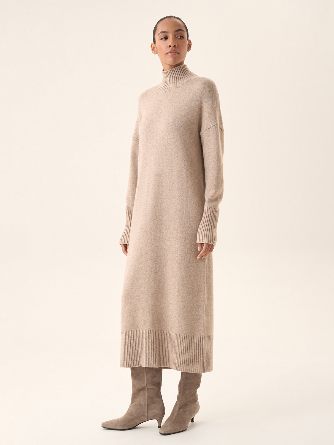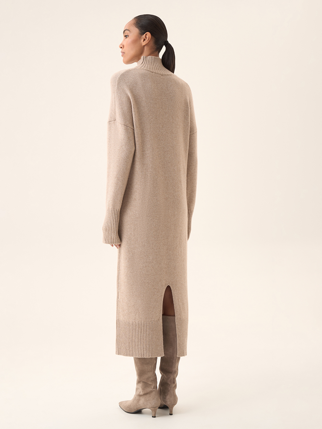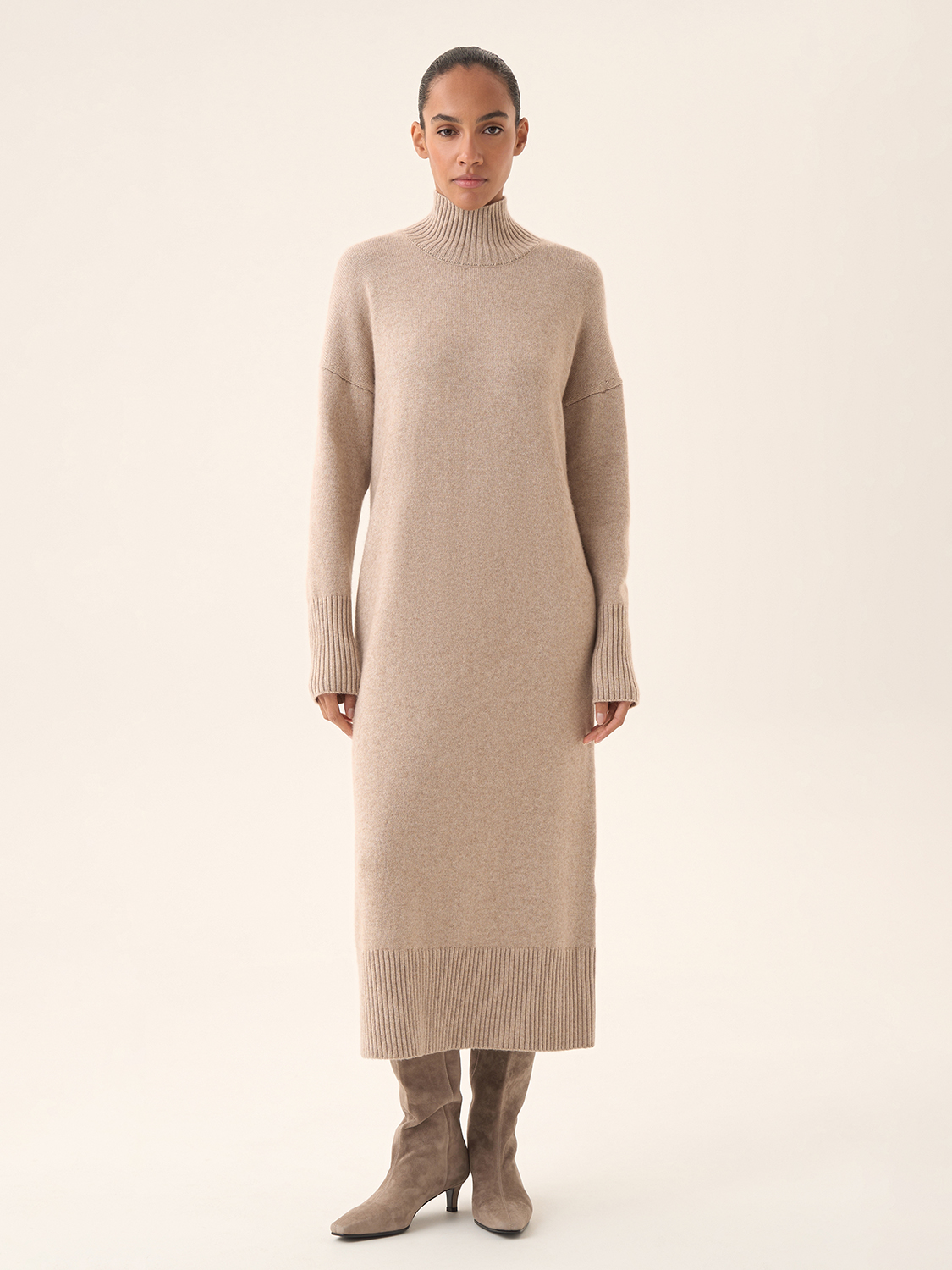 Платье с тончайшей австралийской шерстью — это идеальное воплощение уюта и элегантности. Выполненное из нежнейшей австралийской шерсти, оно обеспечивает исключительное тепло и комфорт, оставаясь при этом лёгким и стильным. Прямой крой и минималистичный дизайн позволяют платью выглядеть сдержанно, но при этом современно. Высокий воротник и длинные рукава добавляют дополнительную защиту от холода, делая его идеальным выбором для прохладных дней. Платье легко сочетать как с высокими ботинками для повседневного стиля, так и с аксессуарами для создания более утонченного образа.