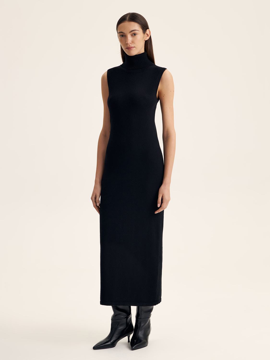 Трикотажное платье из шерсти мериноса — воплощение женственности и утонченного стиля. Высокий воротник элегантно подчеркивает линию шеи, а открытые плечи добавляют образу изысканности и мягкой чувственности. Длинный силуэт гармонично облегает фигуру, создавая элегантный и лаконичный образ. Натуральная шерсть мериноса обеспечивает тепло и комфорт, идеально подходит для прохладных дней. Универсальный дизайн платья позволяет комбинировать его с классическими пальто или уютными кардиганами, создавая стильные и многогранные образы.