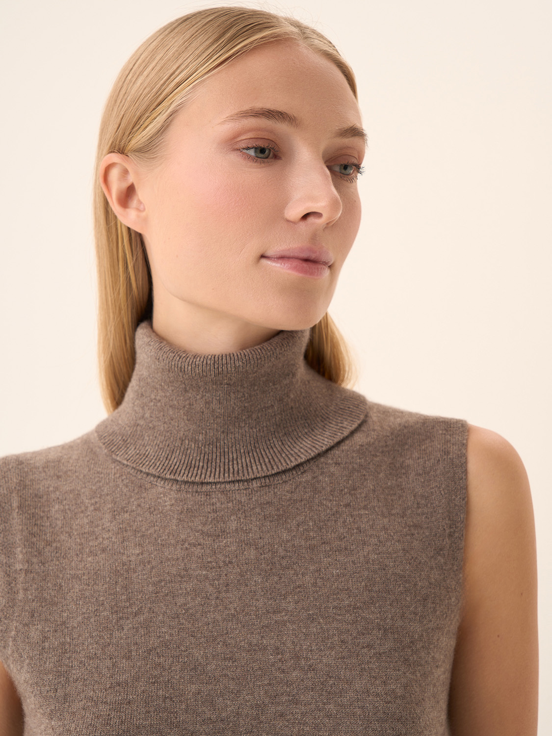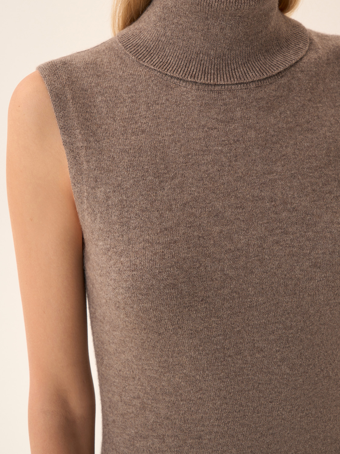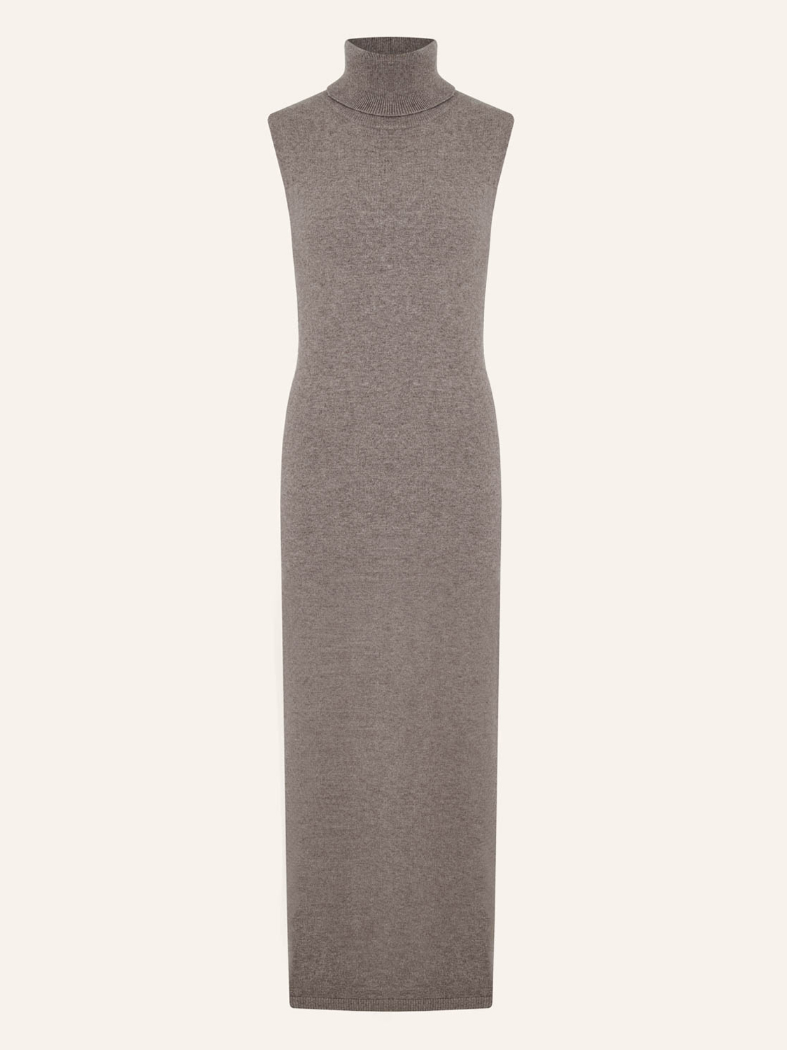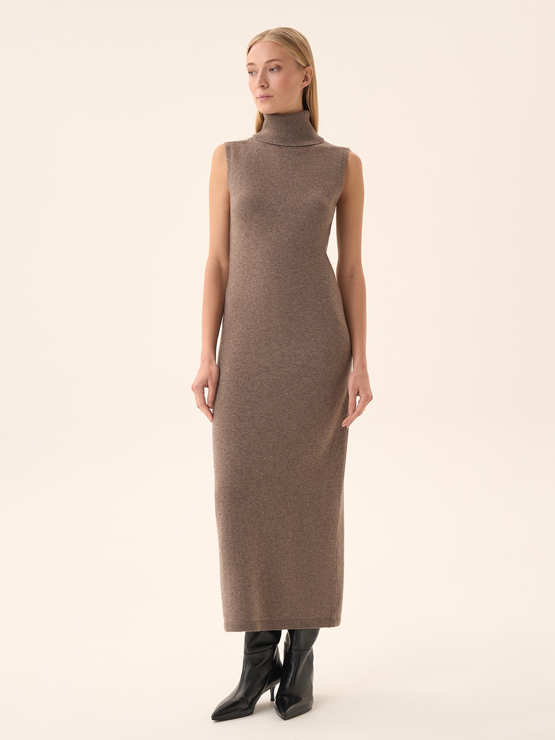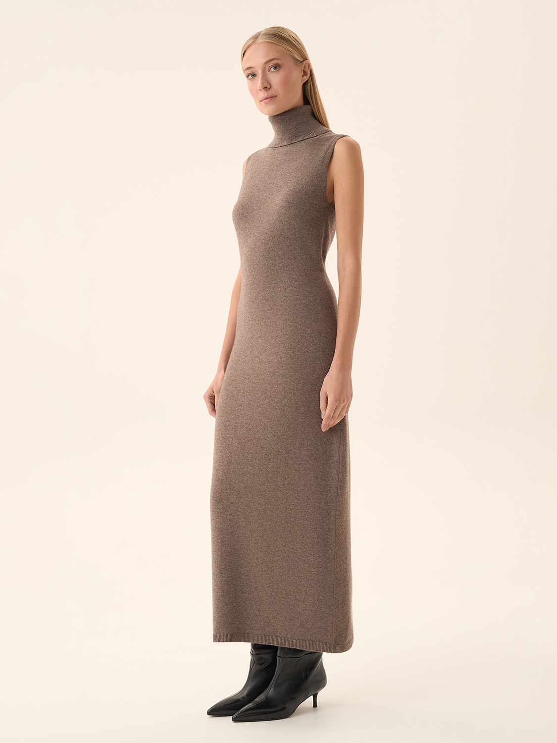 Трикотажное платье из шерсти мериноса — воплощение женственности и утонченного стиля. Высокий воротник элегантно подчеркивает линию шеи, а открытые плечи добавляют образу изысканности и мягкой чувственности. Длинный силуэт гармонично облегает фигуру, создавая элегантный и лаконичный образ. Натуральная шерсть мериноса обеспечивает тепло и комфорт, идеально подходит для прохладных дней. Универсальный дизайн платья позволяет комбинировать его с классическими пальто или уютными кардиганами, создавая стильные и многогранные образы.